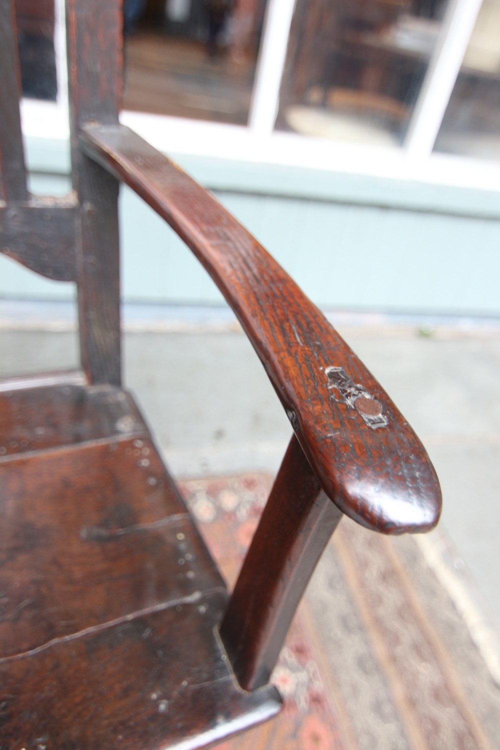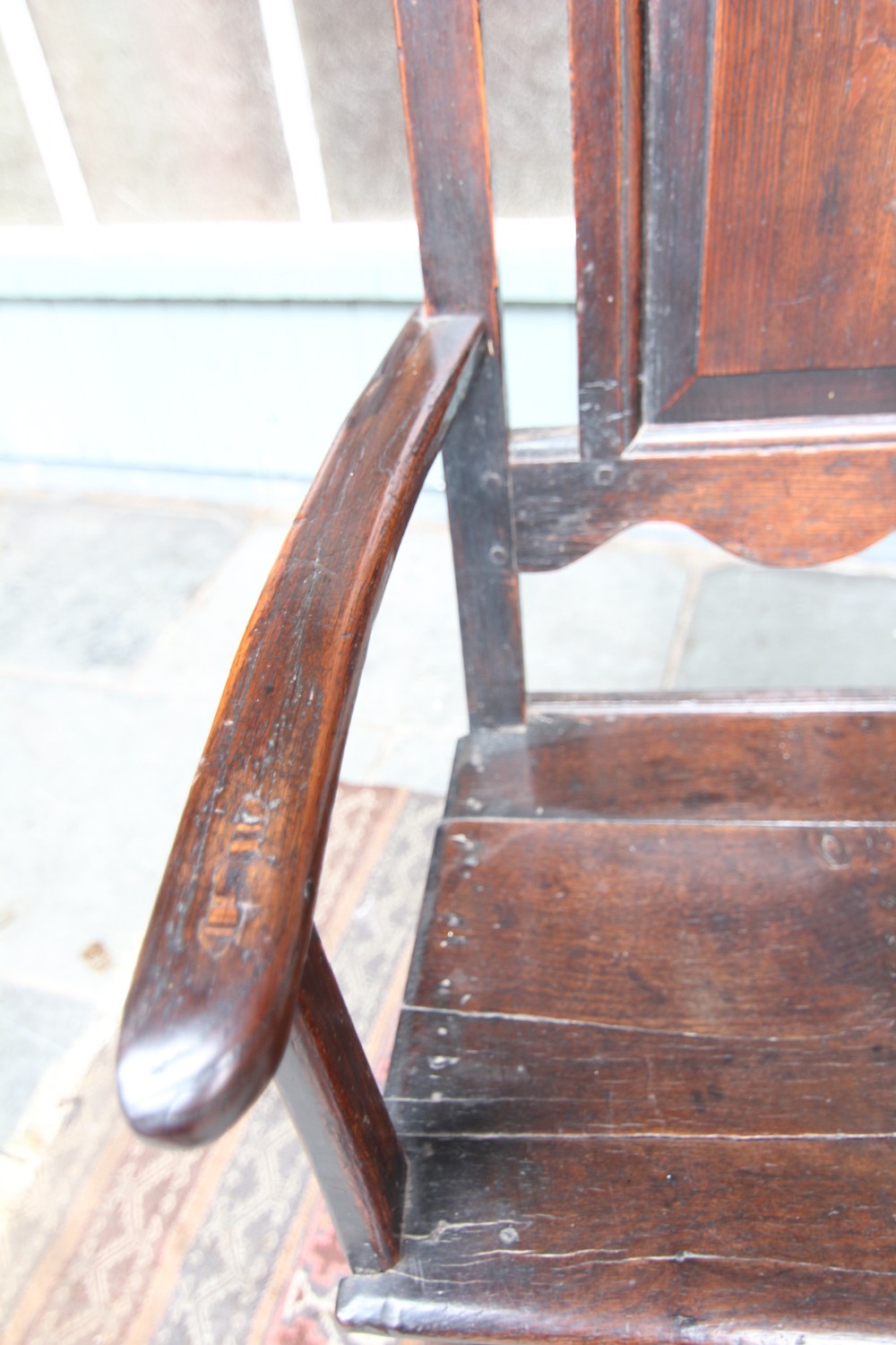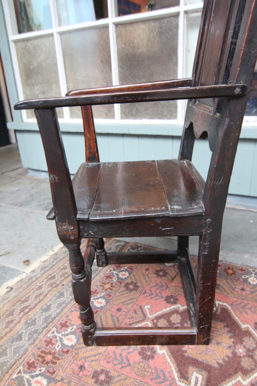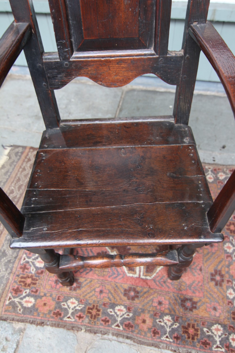 A GOOD HONEST PROVINCIAL WELSH OAK WAINSCOT TYPE OAK ARMCHAIR; JOINED CONSTRUCTION WITH SHAPED BACK AND RAISED PANEL BACKREST, SLENDER WORN TO SHAPE ARMRESTS WITH POLISHED SEAT. STOOD ON POLE LATHE TURNED UPRIGHTS WITH CROSS SUPPORTS TERMINATING ON STILED FOOT. STRUCTURALLY SOUND OVERALL, VARIOUS OLD HONEST REPAIRS AS PER PHOTOS. BEAUTIFUL RICH COLOUR AND PATINATION. PURCHASED SNOWDONIA 70S, FROM PRIVATE COLLECTION.