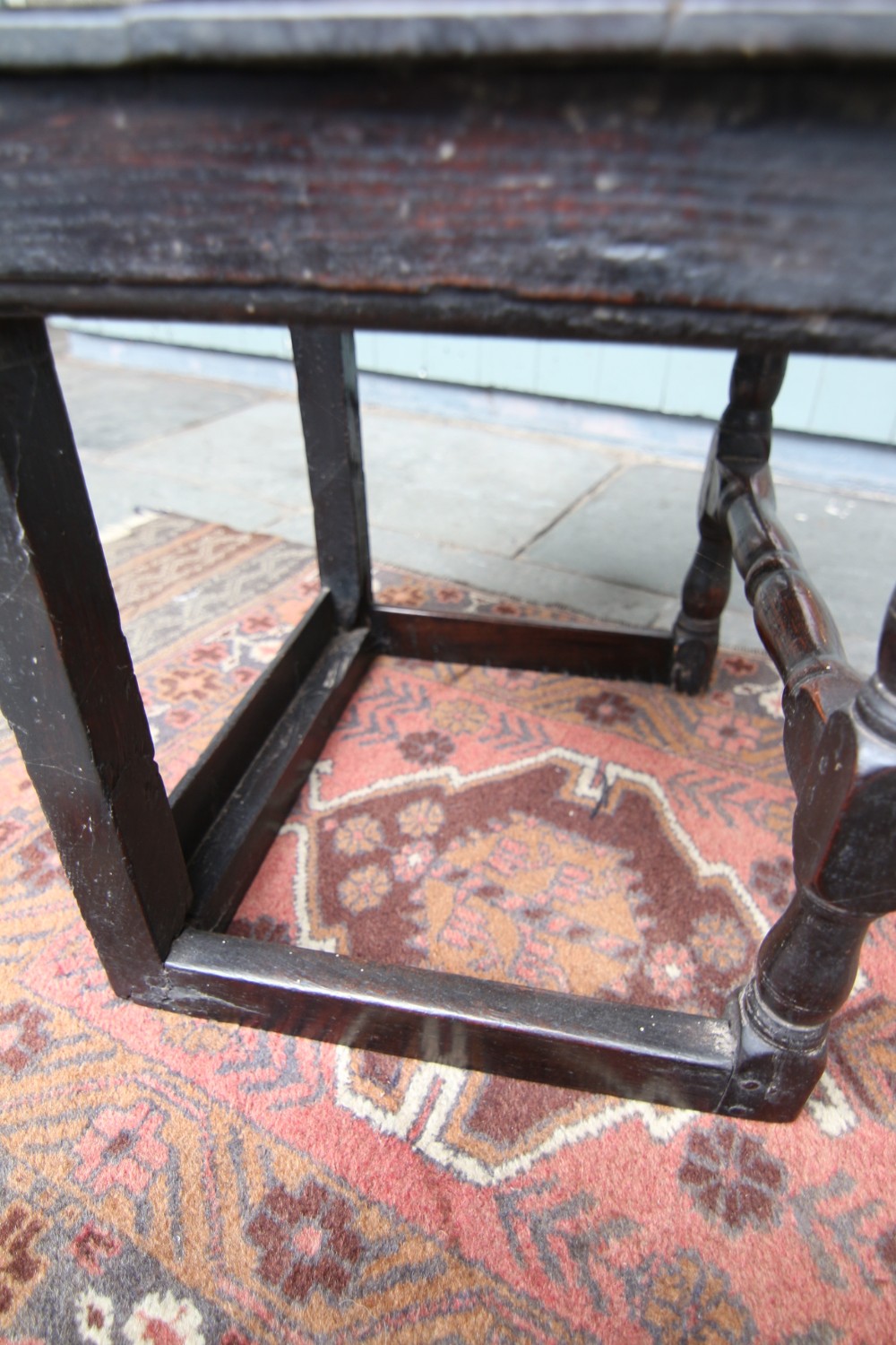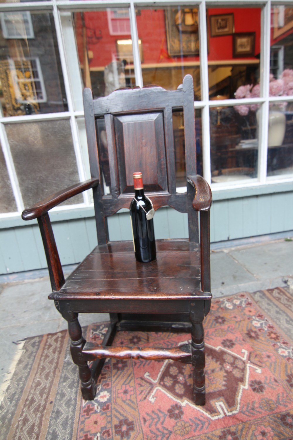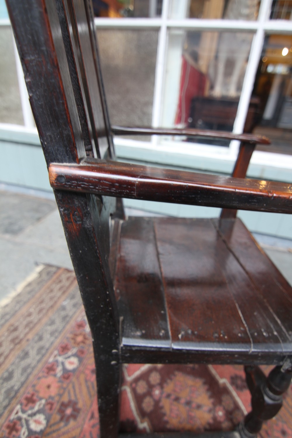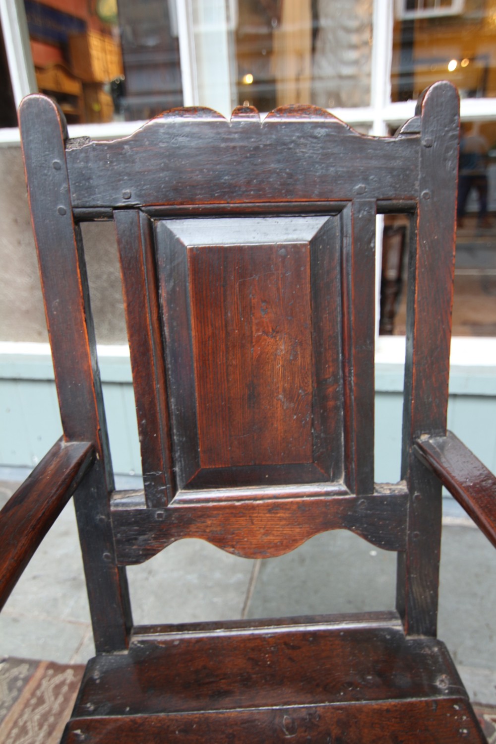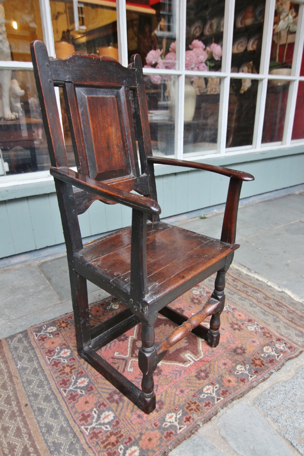A GOOD HONEST PROVINCIAL WELSH OAK WAINSCOT TYPE OAK ARMCHAIR; JOINED CONSTRUCTION WITH SHAPED BACK AND RAISED PANEL BACKREST, SLENDER WORN TO SHAPE ARMRESTS WITH POLISHED SEAT. STOOD ON POLE LATHE TURNED UPRIGHTS WITH CROSS SUPPORTS TERMINATING ON STILED FOOT. STRUCTURALLY SOUND OVERALL, VARIOUS OLD HONEST REPAIRS AS PER PHOTOS. BEAUTIFUL RICH COLOUR AND PATINATION. PURCHASED SNOWDONIA 70S, FROM PRIVATE COLLECTION.