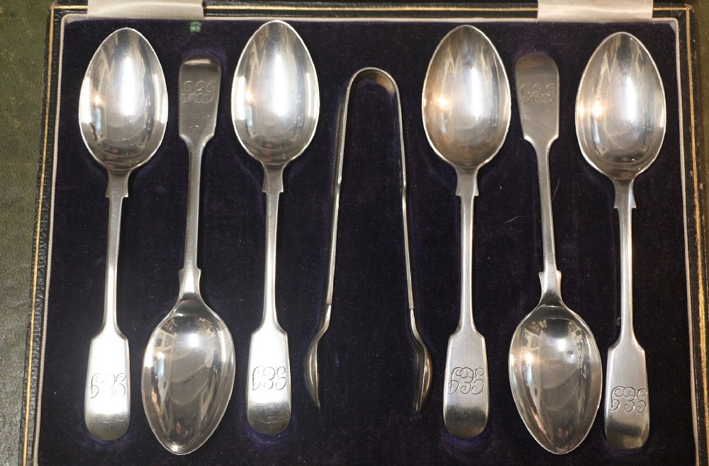 A 19TH CENTURY BOXED SET OF TEASPOONS WITH SUGAR TONGS; HALLMARKED WITH MONOGRAM TO THE TOP SET IN ORIGINAL VELVET LINED CASE. TOTAL WEIGHT 179G APROX BOUGHT PRIVATELY