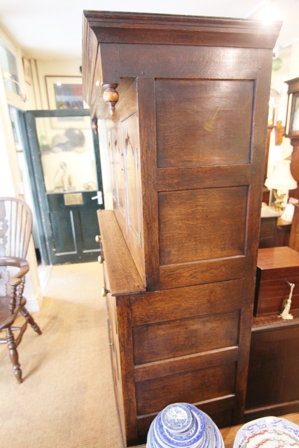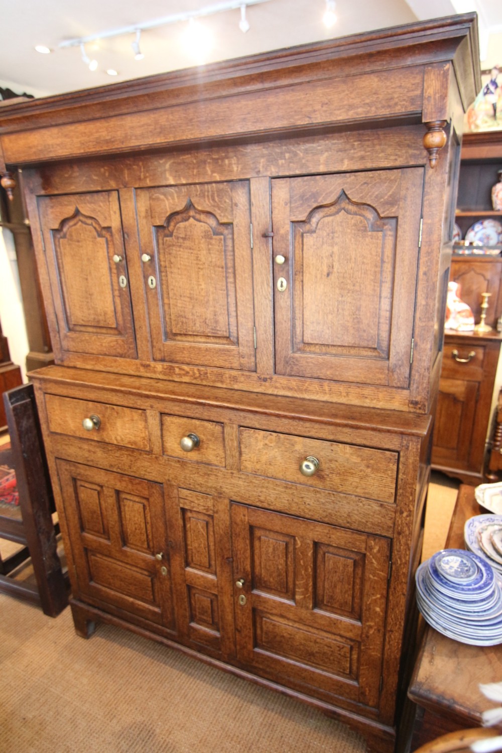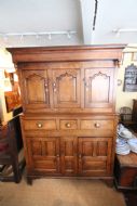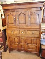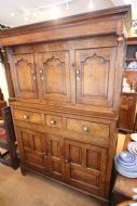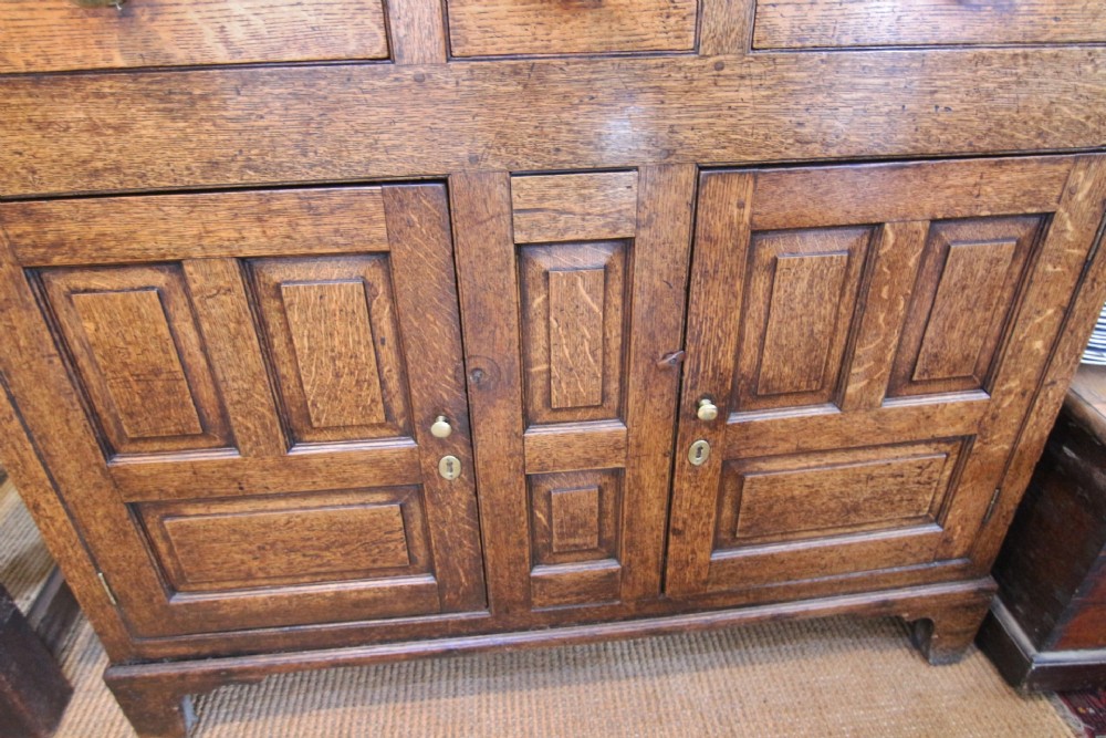 A LOVELY CLEAN WELL PROPORTIONED EXAMPLE OF A MID GEORGIAN OAK DEUDDARN IN TWO PARTS; OGEE CORNICE ABOVE FINELY TURNED DROPPERS, THREE RAISED SHAPE PANEL CUPBOARD DOORS , THE CENTRE WITH INTERIOR SPICE DRAWER. THE LOWER SECTION WITH THREE DOVETAILED DRAWERS WITH BRASS HANDLES ABOVE RAISED PANEL CUPBOARD DOORS, SOLID TIMBER PANEL SIDES AND BACK, STOOD ON STILED FEET. NICE HONEST PIECE STRUCTURALLY SOUND WITH SOME LOVELY DETAIL OF YEW WOOD CATCHES AND DELICATE DETAIL. NORTH WALES MID 18THC.GREAT STORAGE PIECE, GOOD COLOUR AND PATINATION READY TO USE.