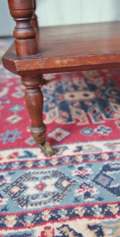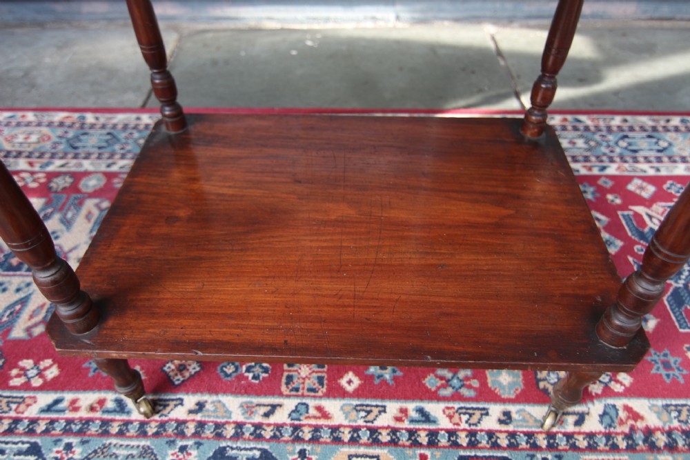 AN ELEGANT SLENDER 19TH CNETURY THREE TIER WHATNOT; POLISHED TOP WITH FINIALS AND TURNED PILLARS, CANTERED CORNERS TO EACH STAGE. TERMINATING IN ORIGINAL BRASS CASTORS. GENERAL USAGE WEAR AS PER PHOTOS INC SMALL WATERMARK SEE PHOTOS. OVERALL STRUCTURALLY SOUND GOOD COLOUR AND PATINATION. BOUGHT PRIVATELY