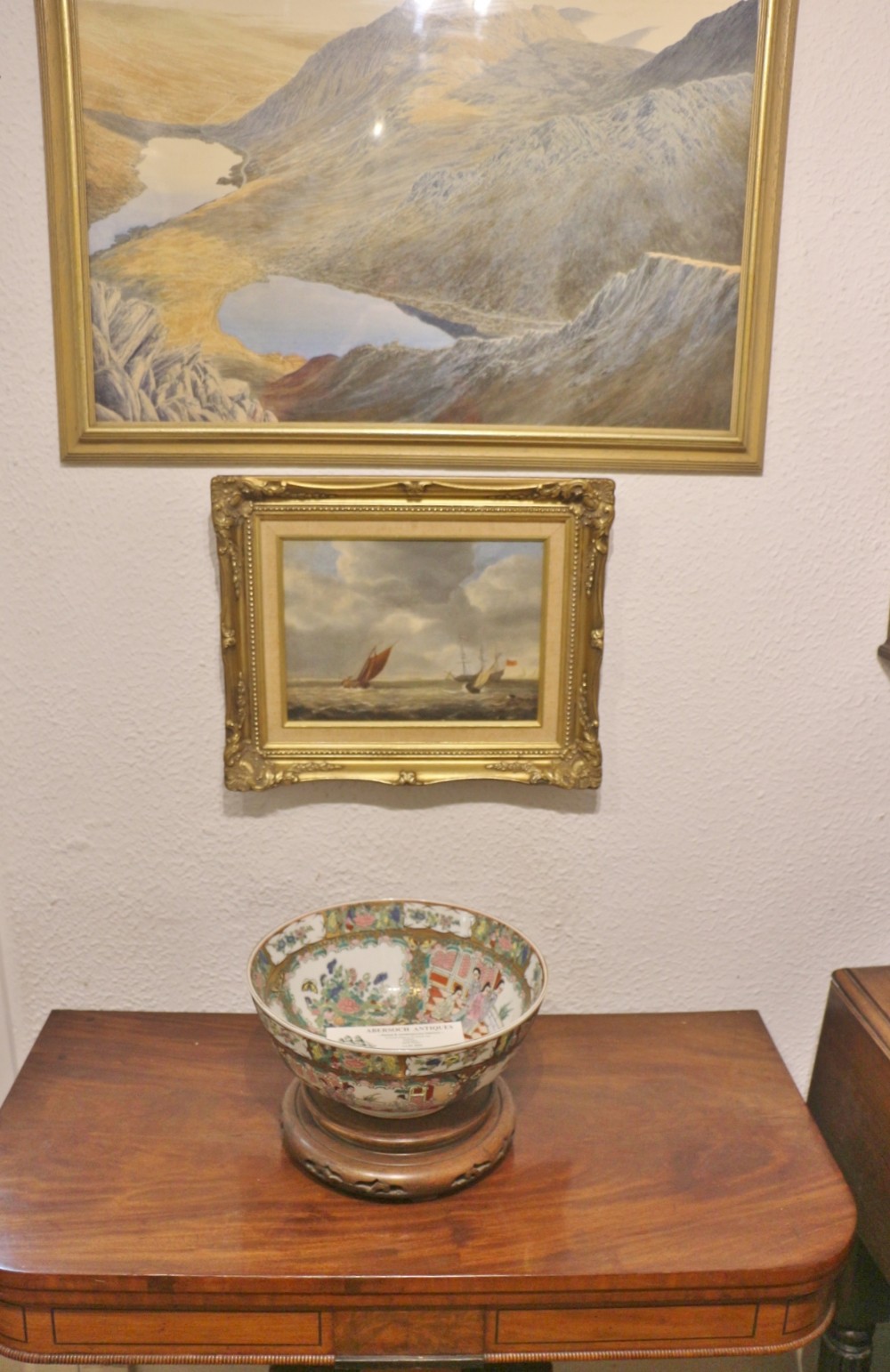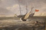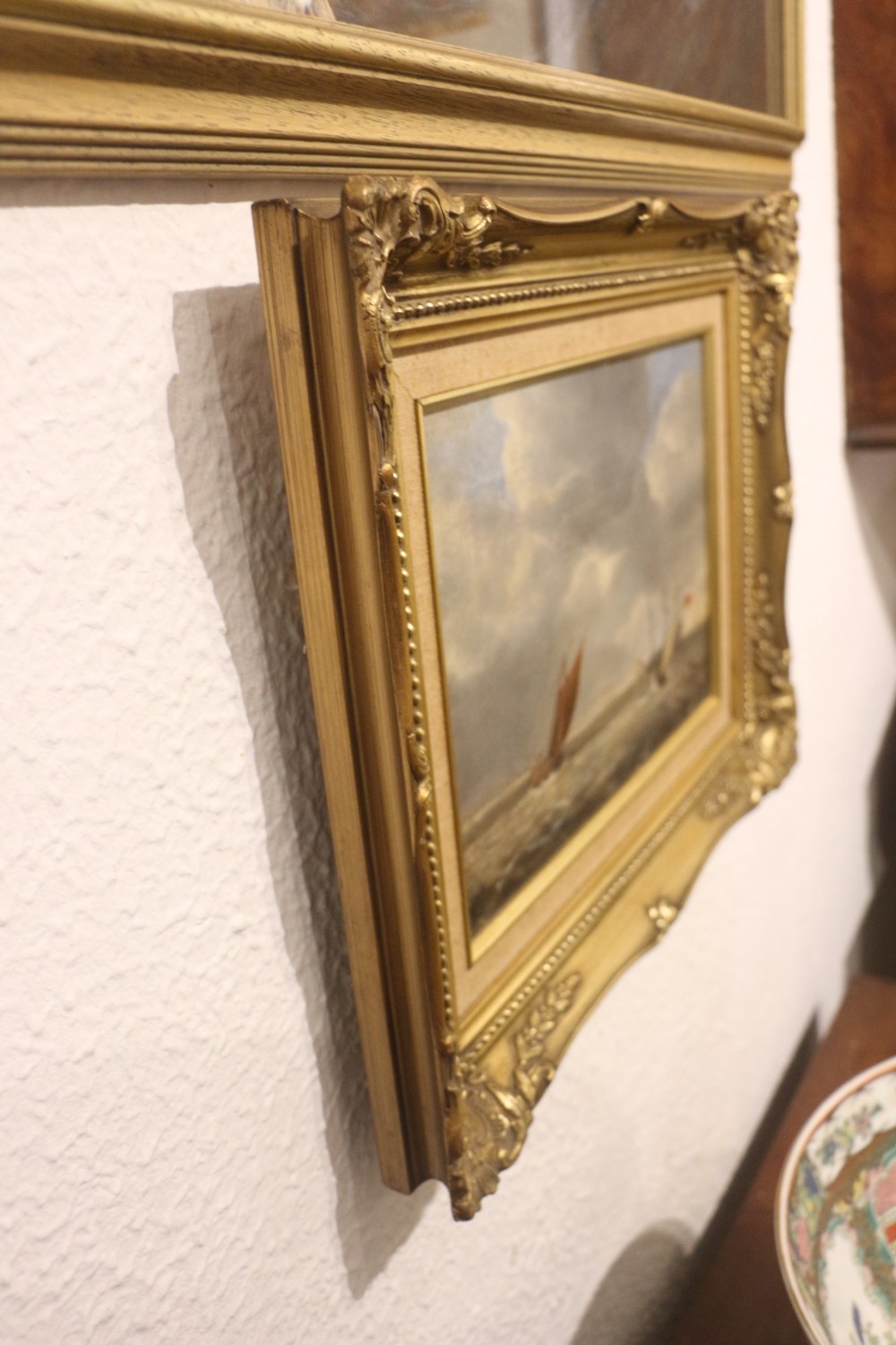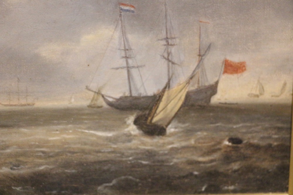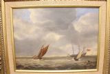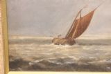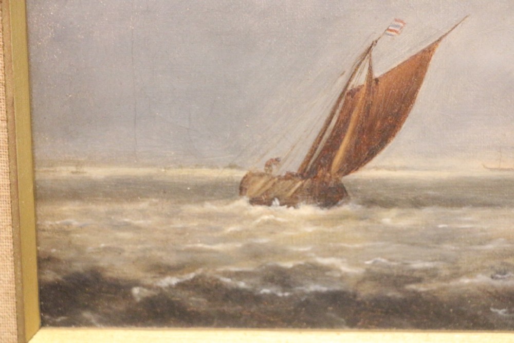 A BEAUTIFULLY EXECUTED 19TH CENTURY OIL PAINTING OF MARITIME SCENE; PERIOD GILT FRAME WITH SAILBOATS TO THE FOREGROUND IN ROUGH SEAS, THREE MASTED SHIPS SEEN IN THE BACKGROUND WITH ATMOSPHERIC CLOUDY SKY. REAR STAMPED 'GEO ROWNEY OXFORD ST LONDON, CANT SEE A SIGNATURE.LIGHT FADING TO SECTION OF SKY AS PER PHOTOS, STRUCTURALLY STABLE IN GOOD OVERALL CONDITION WITH VIBRANT COLOUR. FROM A PRIVATE COLLECTION.