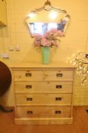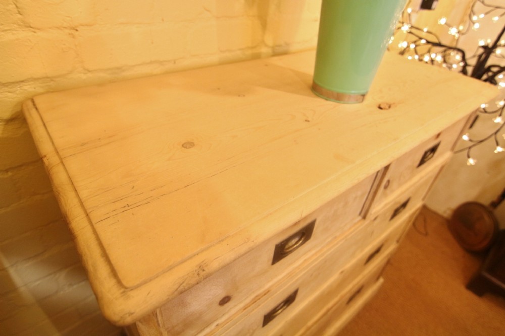 A SUPERB QUALITY HEAVY PINE CHEST OF DRAWERS; PLANK TOP ABOVE OGEE MOULDING AND TWO SHORT OVER 3 LONG DOVETAILED INSET MOULDED & GRADUATED DRAWERS, ORIGINAL INSET BRASS HANDLES.SOLID TIMBER SIDES AND BACK STOOD ON SOLID PLINTH. GENERAL USAGE WEAR AS PER PHOTOS, IN A NATURAL SCRUBBED PINE CONDITION (CAN BE POLISHED IF REQUIRED). STRUCTURALLY SOUND,WELL MADE CLEAN PIECE OF FURNITURE GOOD DEEP DRAWER STORAGE.