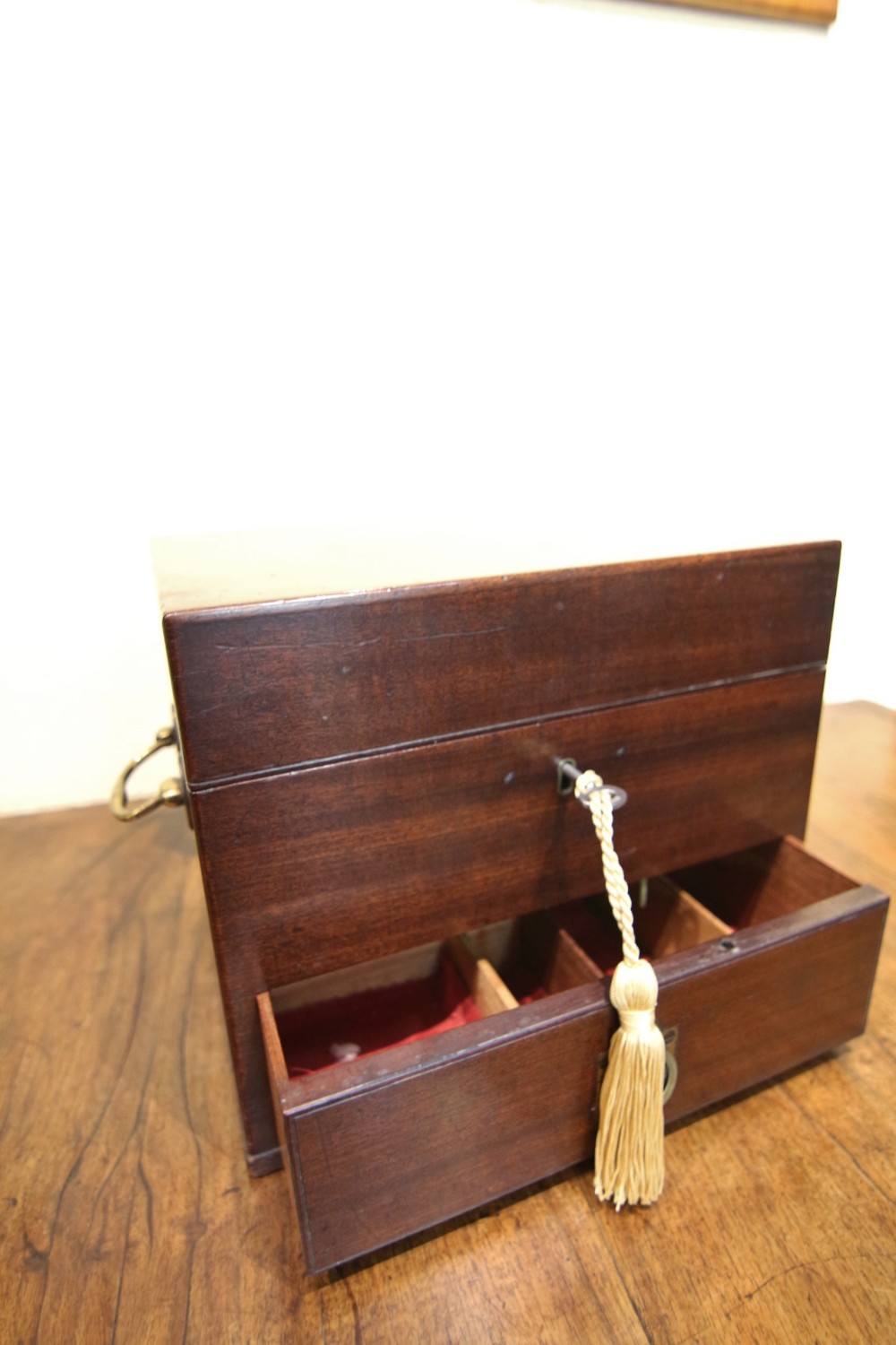 A HANDSOME CLEAN GEORGIAN MAHOGANY BOX; LIKELY AN APOTHECARY TRAVEL BOX WITH PLAIN POLISHED CASE WITH CARRY HANDLES, THE INTERIOR WITH ROOMY COMPARTMENT FOR STORAGE, LOCKING WITH BRASS ROD LOCK FOR LOWER DRAWER. INTERIOR SECTIONED COMPARTMENTS WITH RECESSED BRASS HANDLE. OVERALL CLEAN USEFUL LITTLE 18TH CENTURY BOX. BOUGHT PRIVATELY