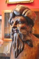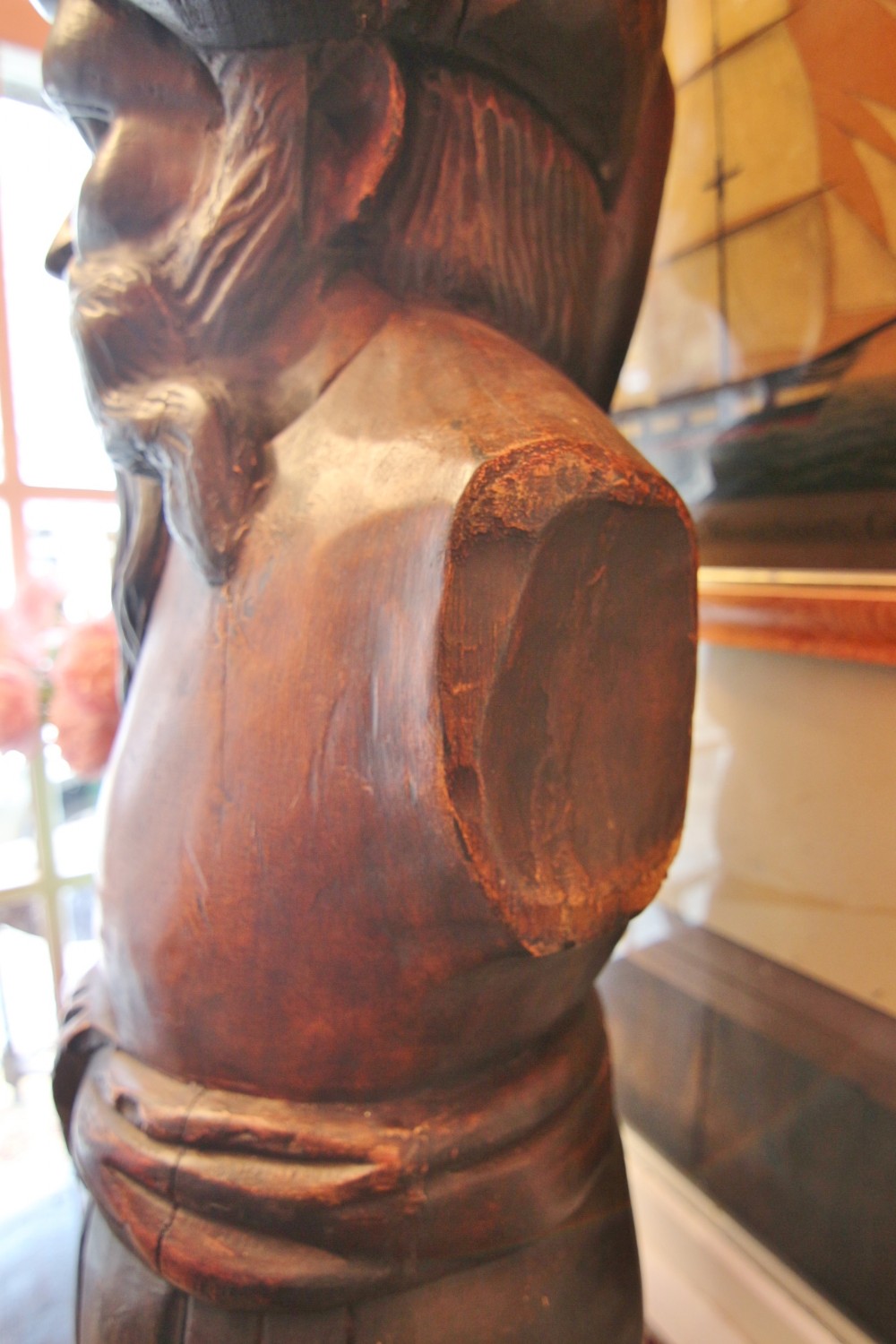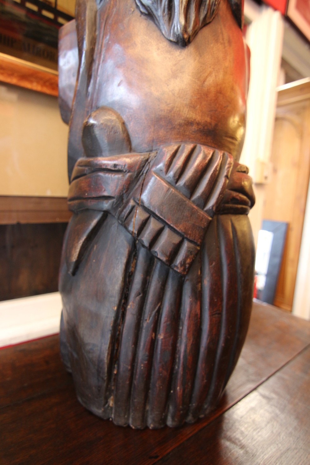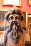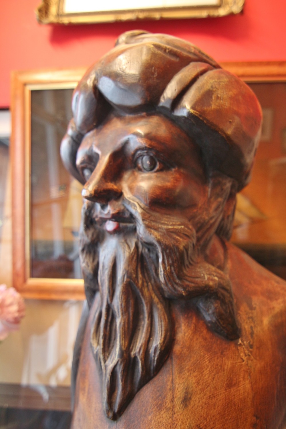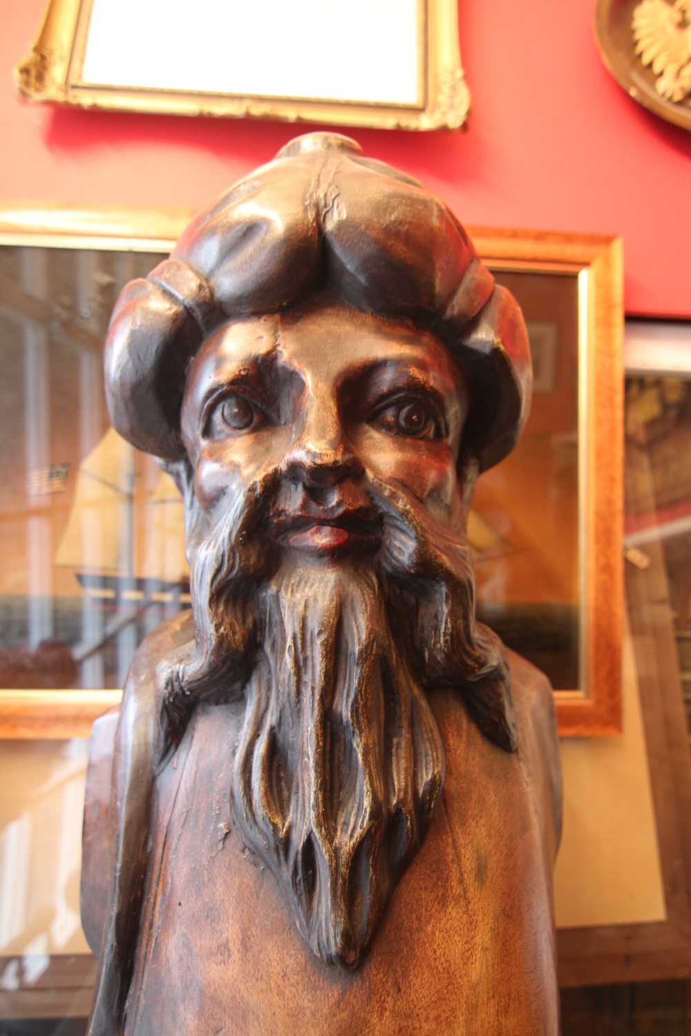 A SOLID CARVED SHIPS FIGURE HEAD OF A PERSIAN WARRIOR; CARVED FROM ONE PIECE OF HARDWOOD BIG CHAP WITH TURBAN AND BEARD BRANDISHING A CUTLASS,TRACES OF PIGMENT PAINTWORK. GENERAL USAGE WEAR AS PER PHOTOS. BOUGHT PRIVATELY
