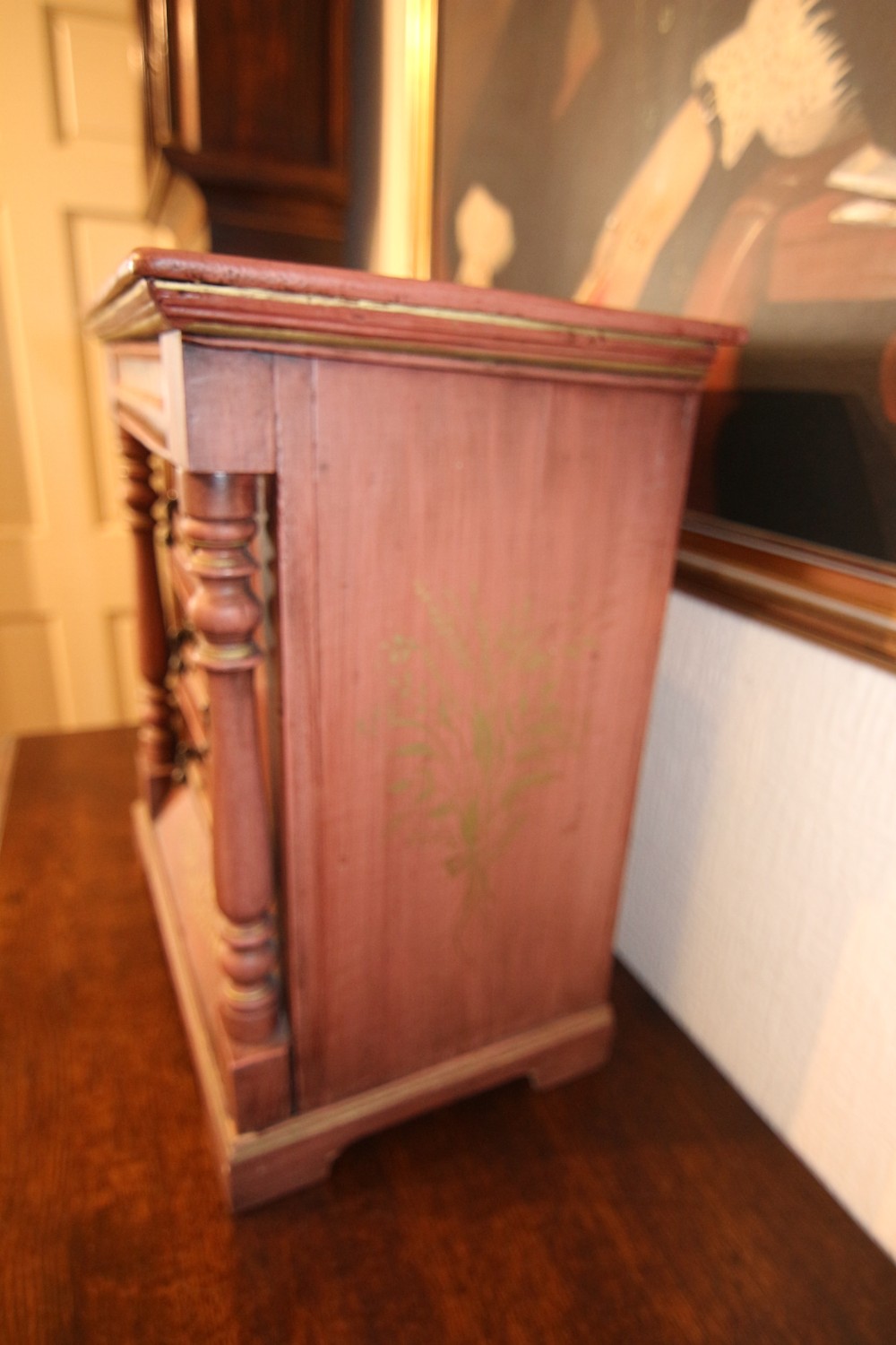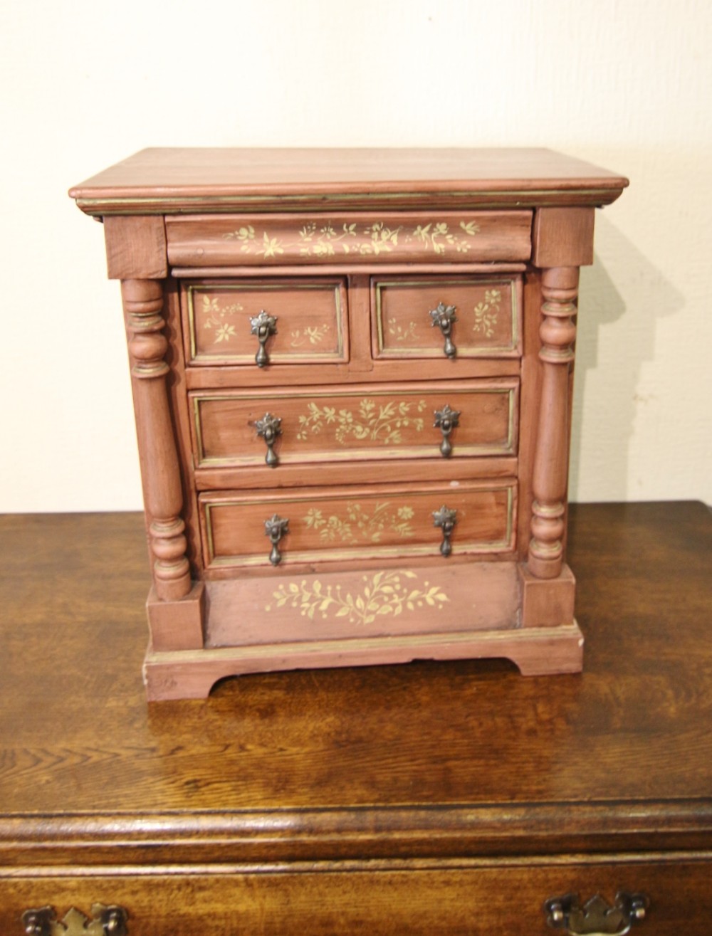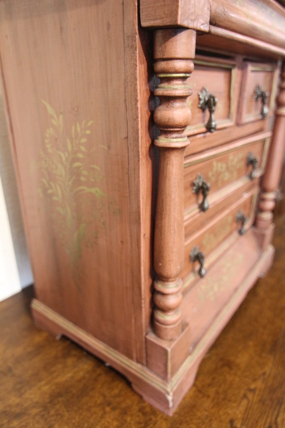 AN ATTRACTIVE LITTLE 19TH CENTURY PINE APPRENTICE PIECE CHEST OF DRAWERS; DECORATIVELY PAINTED BY THE FORMER OWNER ABOUT 30 YEARS AGO WITH GOLD FOLIATE PATTERN. MOULDED TOP ABOVE LONG SECRET DRAWER ABOVE 2 SHORT OVER 2 LONG DOVETAILED DRAWERS , FLANKED BY TURNED COLUMNS. SOLID TIMBER SIDES AND BACK, STOOD ON SHAPED PLINTH FOOT. GENERAL USAGE WEAR OVERALL CLEAN STRUCTURALLY SOUND PIECE. BOUGHT PRIVATELY