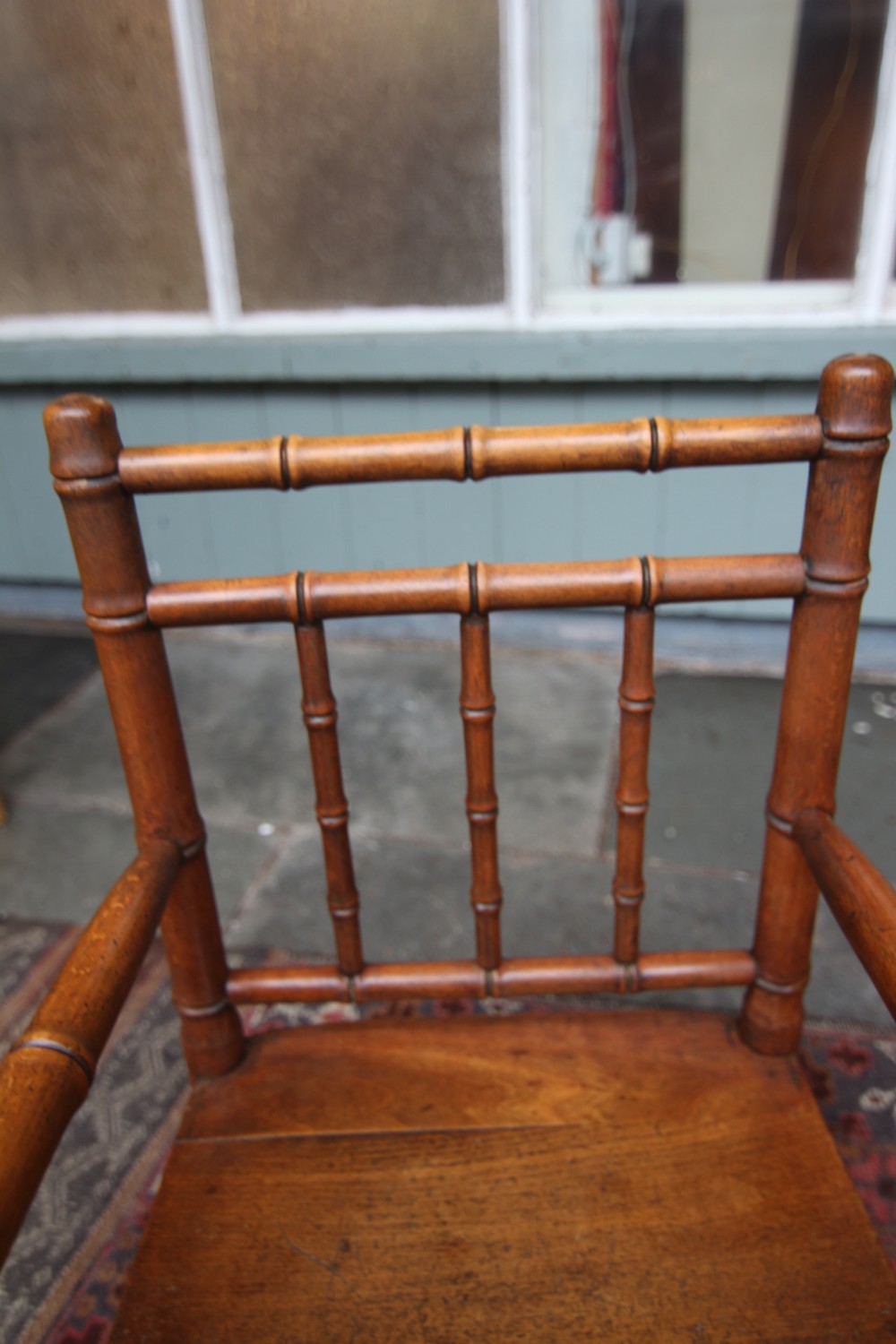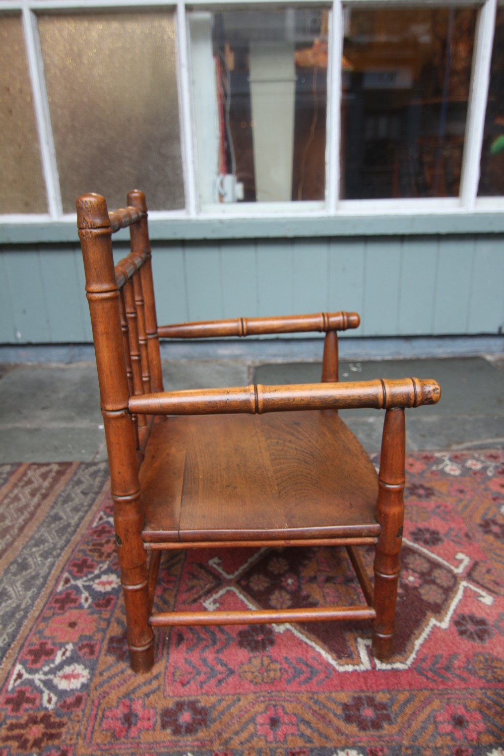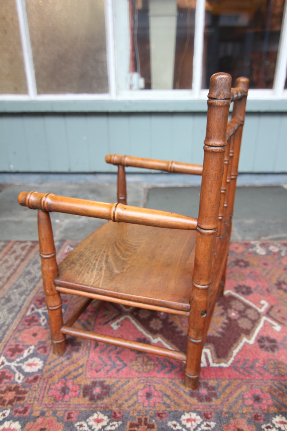 LITTLE 19TH CENTURY BEECH / SYCAMORE FAUX BAMBOO CHILDS CHAIR; WITH SPINDLE BACK SUPPORT WITH SOLID SEAT, CROSS STRETCHER SUPPORTS STOOD ON SOLID LEG. OLD REPAIRS AS PER PHOTOS, STRUCTURALLY SOUND, LOVELY GOLDEN COLOUR AND PATINATION. FROM ESTATE IN WELSHPOOL.