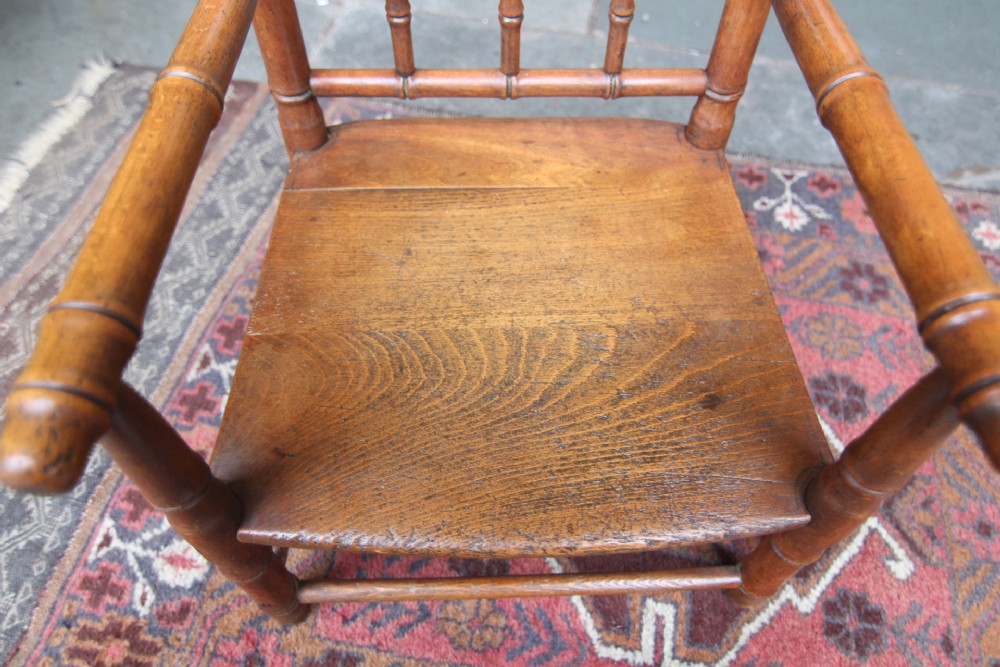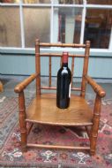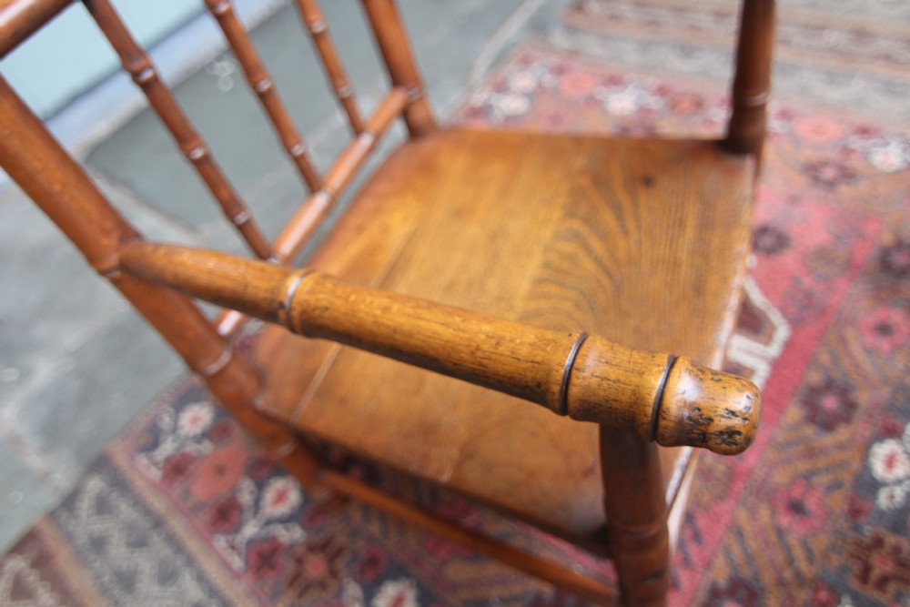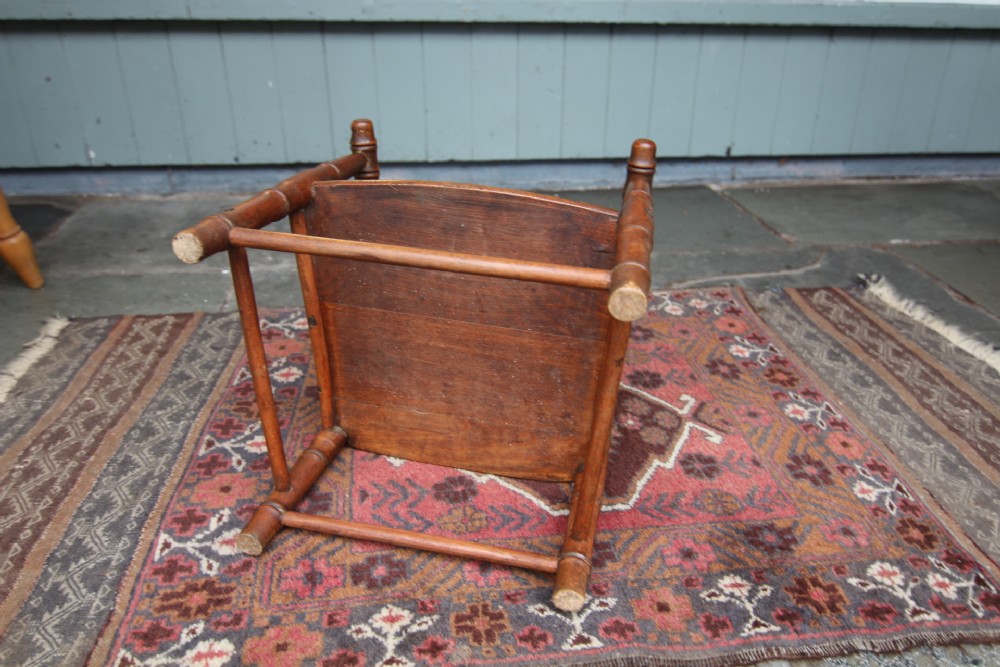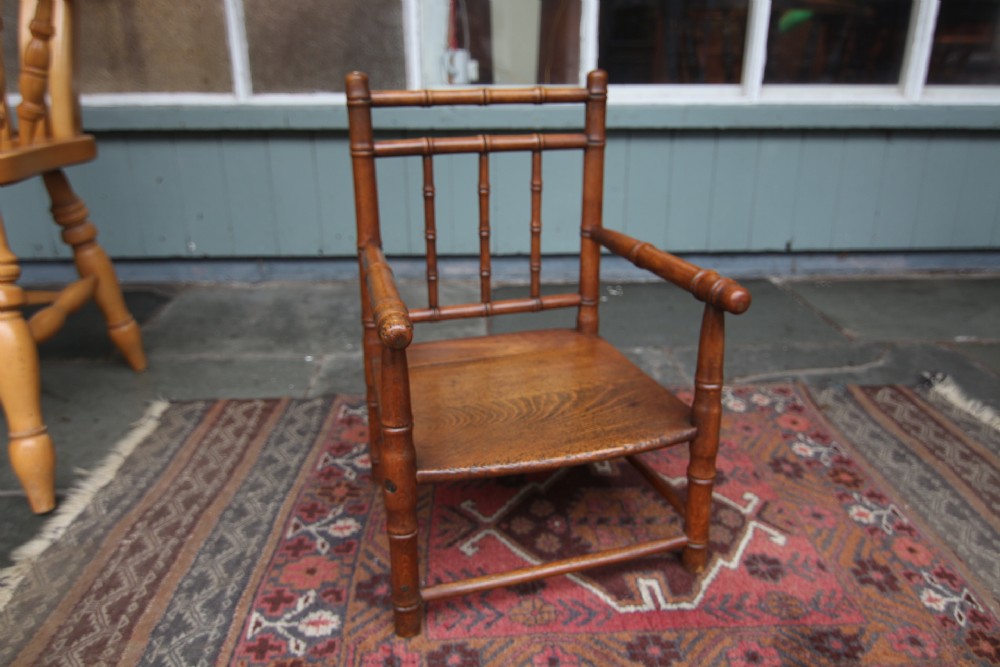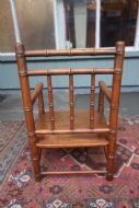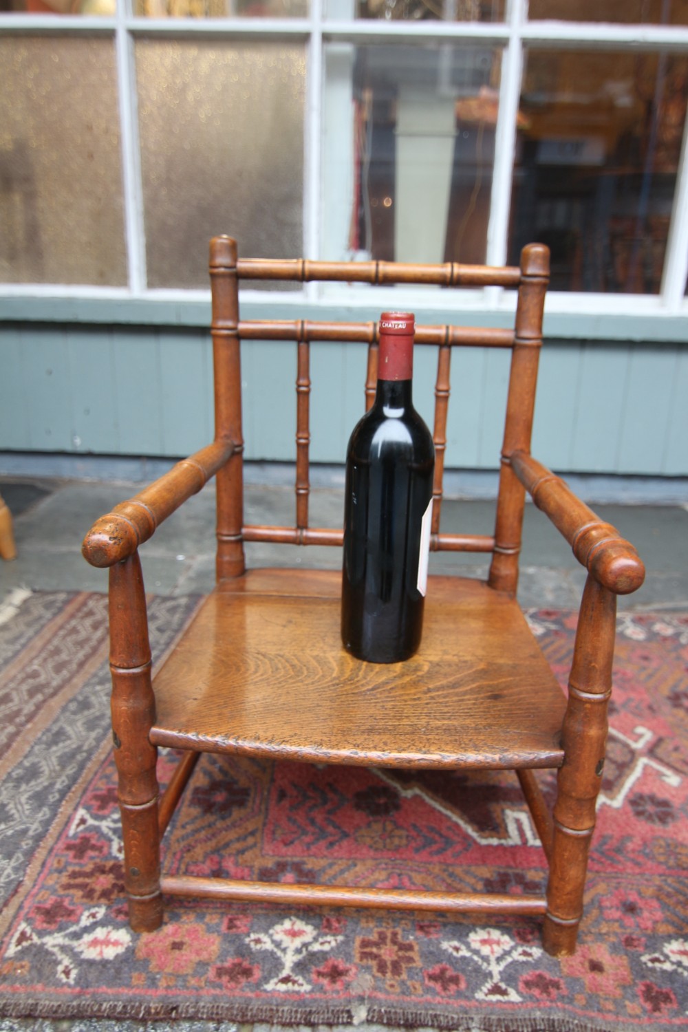 LITTLE 19TH CENTURY BEECH / SYCAMORE FAUX BAMBOO CHILDS CHAIR; WITH SPINDLE BACK SUPPORT WITH SOLID SEAT, CROSS STRETCHER SUPPORTS STOOD ON SOLID LEG. OLD REPAIRS AS PER PHOTOS, STRUCTURALLY SOUND, LOVELY GOLDEN COLOUR AND PATINATION. FROM ESTATE IN WELSHPOOL.