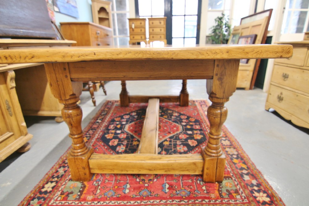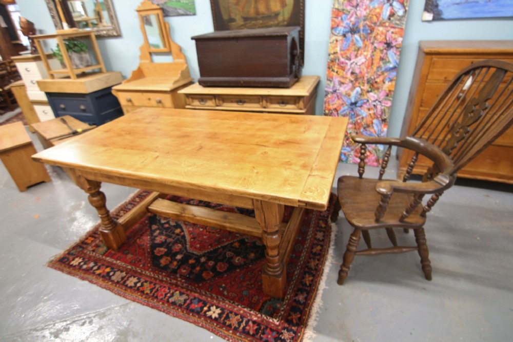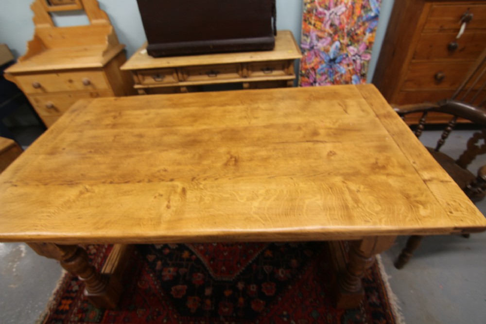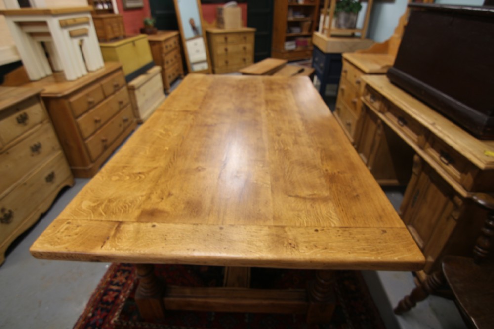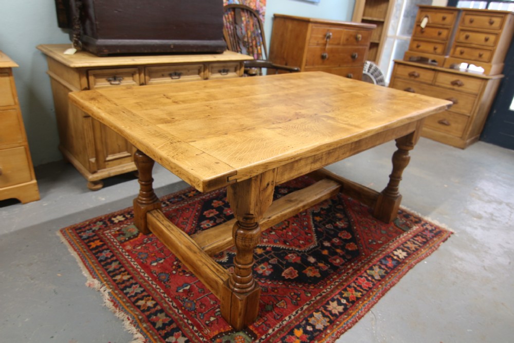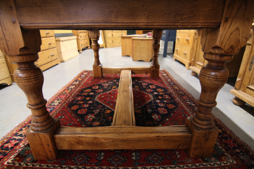 A GOOD QUALITY GEORGIAN STYLE SOLID OAK REFECTORY TABLE EARLY 20TH CENTURY; IN RESTORED AND CLEANED CONDITION STRUCTURALLY SOUND NO WORM. SOLID POLISHED OAK TOP WITH CLEATED ENDS.THE TOP DROPS INTO THE FRAME WITH FIGURED TURNED OAK LEG & WEATHERED FOOTREST SUPPORT. GENERAL USAGE WEAR AS PER PHOTOS PROVIDING CHARACTER, POLISHED USING NATURAL OIL FOR HEAT & DURABILITY AND IN RESTORED CONDITION.OLD TIMBER SHAKE TO LEGS STRUCTURALLY SOUND ,MORE A CHARACTER FEATURE. BOUGHT PRIVATELY