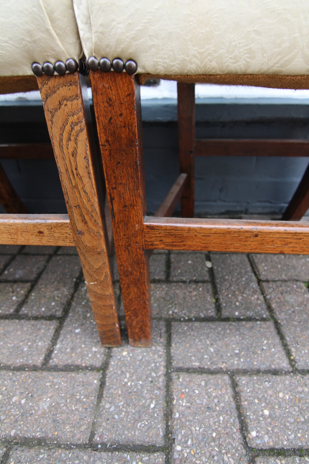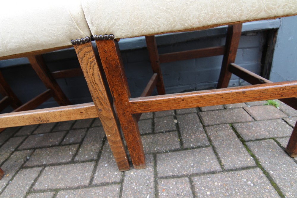 A GOOD SOLID SET OF LATE GEORGIAN OAK COUNTRY FARMHOUSE CHAIRS; WITH SHAPED BACKREST AND PIERCED SPLAT, BROAD ORIGINAL SOLID OAK SEATS COVERED LATER WITH COMFY MODERN UPHOLSTERY. SQUARE LEG WITH CROSS -STRETCHER SUPPORTS. ALL CHAIRS ARE STRUCTURALLY FIRM AND SOUND, OLD USAGE WEAR AND OLD REPAIR AS PER PHOTOS, LOVELY COLOUR AND PATINATION, NICE DENSE OAK.