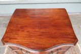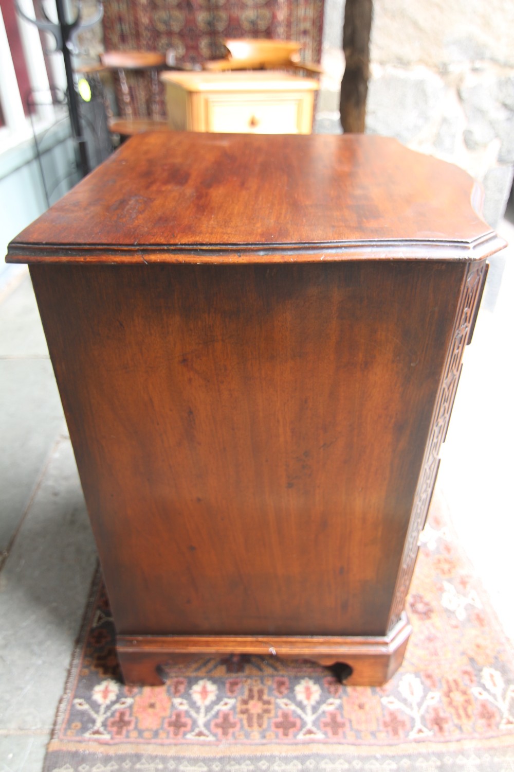A SUPERIOR QUALITY EDWARDIAN GEORGIAN STYLE SERPENTINE CHEST OF FOR DRAWERS NICE SMALL PROPORTIONS; POLISHED TOP WITH CANTERED CORNERS ABOVE FOUR COCKBEADED, DOVETAILED SOLID TIMBER DRAWERS, ORIGINAL HEAVY BRASSWARE, BLIND FRET DECORATION TO THE CORNERS. SOLID TIMBER SIDES AND BACK STOOD ON BRACKET FEET. GENERAL USAGE WEAR AS PER PHOTOS, STRUCTURALLY SOUND READY TO USE.