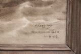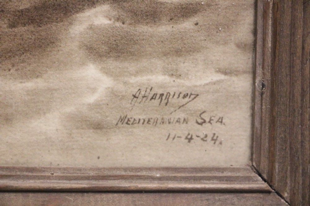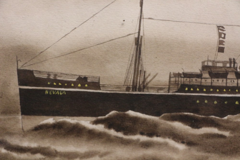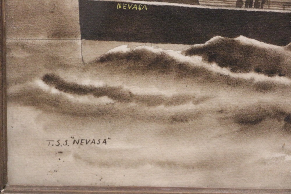A SHIPS PAINTING IN GOUACHE IN ORIGINAL FRAME OF THE STEAMSHIP TTS NEVASA PICTURED IN THE MEDITERRANEAN. BEHIND GLLASS DEPICTED IN ROUGH SEAS. GENERAL AGE RELATED WEAR, OVERALL HONEST LITTLE PIECE OF HISTORY.