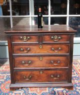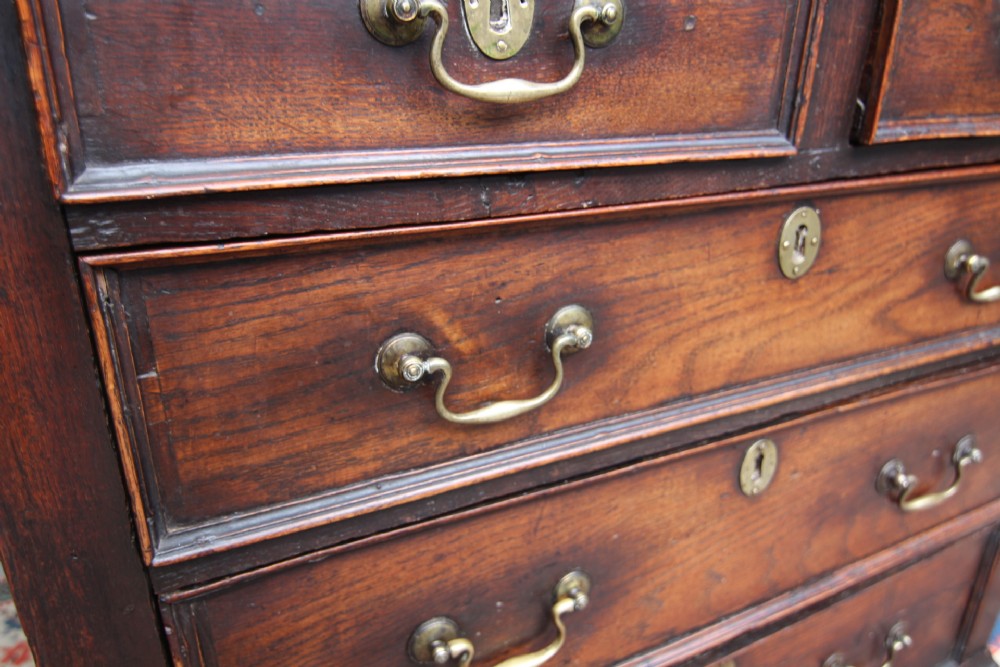 A HANDSOME WELL PROPORTIONED GEORGIAN OAK CHEST; WITH POLISHED TOP ABOVE OGEE MOULDING, TWO SHORT OVER THREE LONG GRADUATED DRAWERS WITH RAISED EDGE MOULDING AND PERIOD BRASSWARS SWAN NECK HANDLE AND ESCUTCHEONS. TOP TWO DRAWERS WITH SECRET LOCKING MECHANISM TO THE UNDERSIDE AS PER PHOTOS.. SOLID PANEL SIDES AND BACK STOOD ON SHAPED BRACKET FEET. GENERAL USAGE WEAR AND OLD MINOR REPAIRS. STRUCTURALLY SOUND, DENSE GLOSSY TIMBER WITH A LOVELY COLOUR AND PATINATION.GOOD CHEST READY TO GO.