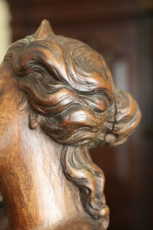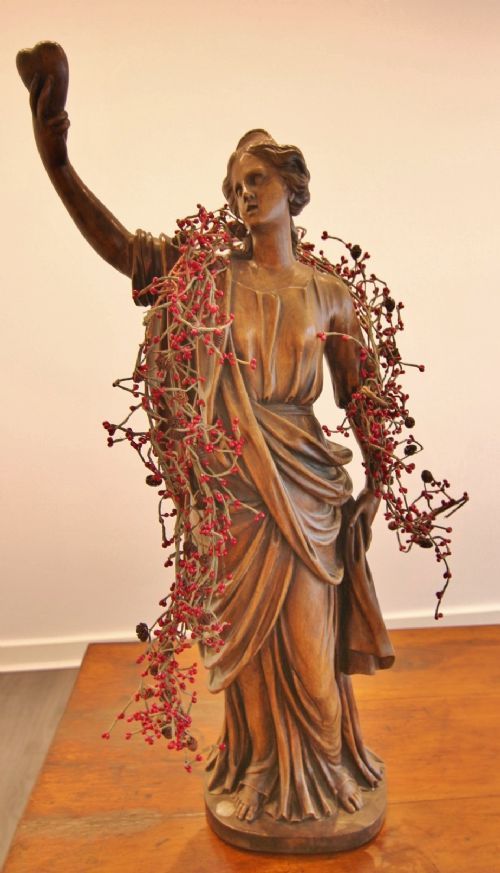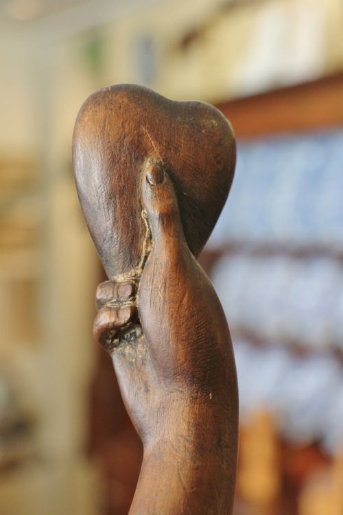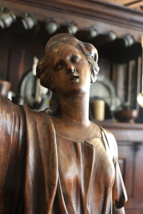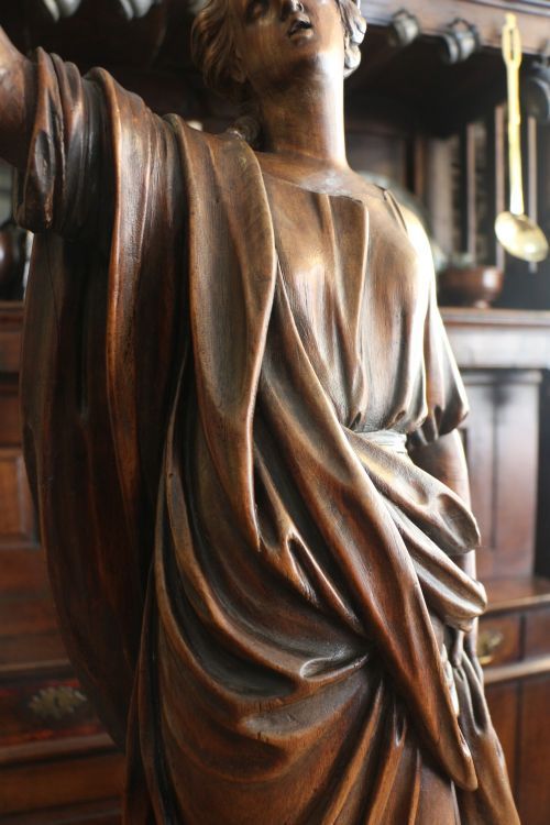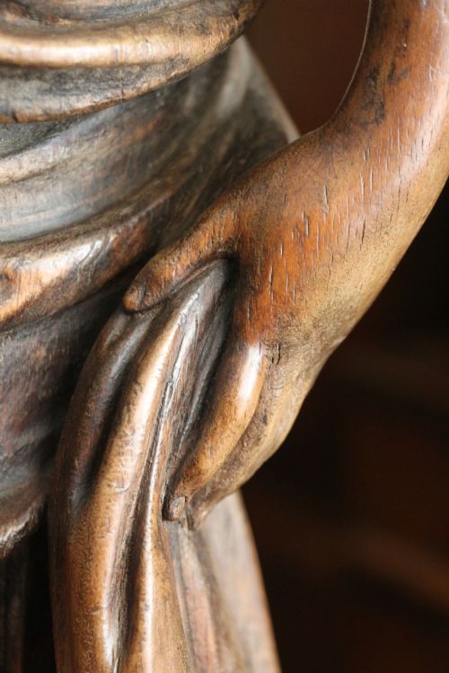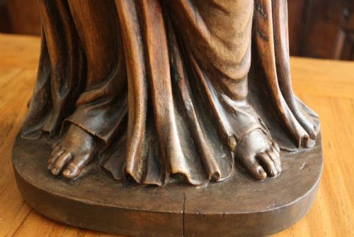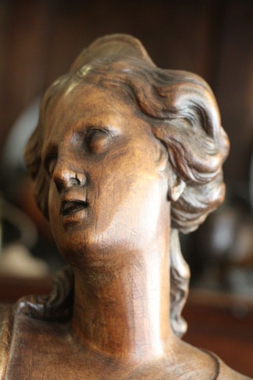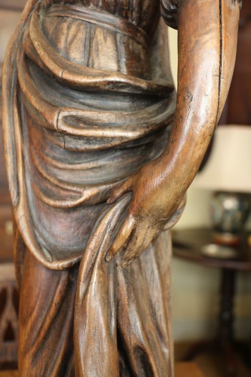 A BEAUTIFUL LARGE LATE GEORGIAN FIGURE OF A FEMALE FIGURE WITH RAISED OUTSTRETCHED ARM HOLDING A HEART ( TRADITIONALLY A CHRISTIAN SYMBOL OF LOVE & MERCY ). DRESSED IN FLOWING ROBES WONDERFULLY EXECUTED CARVING, INTRICATE CLASPED HAIR AND DETAIL OF THE HANDS AND FEET.A GOOD GOLDEN COLOUR & PATINATION, SHE STANDS FIRMLY BY HERSELF.MINOR AGE AND WEAR WITH WOOD SHRINKAGE TYPICAL OF AGE AS PER PHOTOS, OTHERWISE STRUCTURALLY EXCELLENT CONDITION WITH NO WORM.A REALLY PLEASING SCULPTURAL CENTREPIECE.