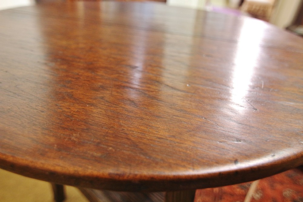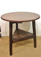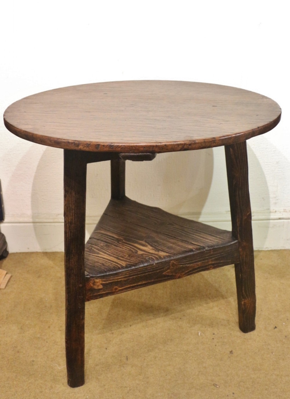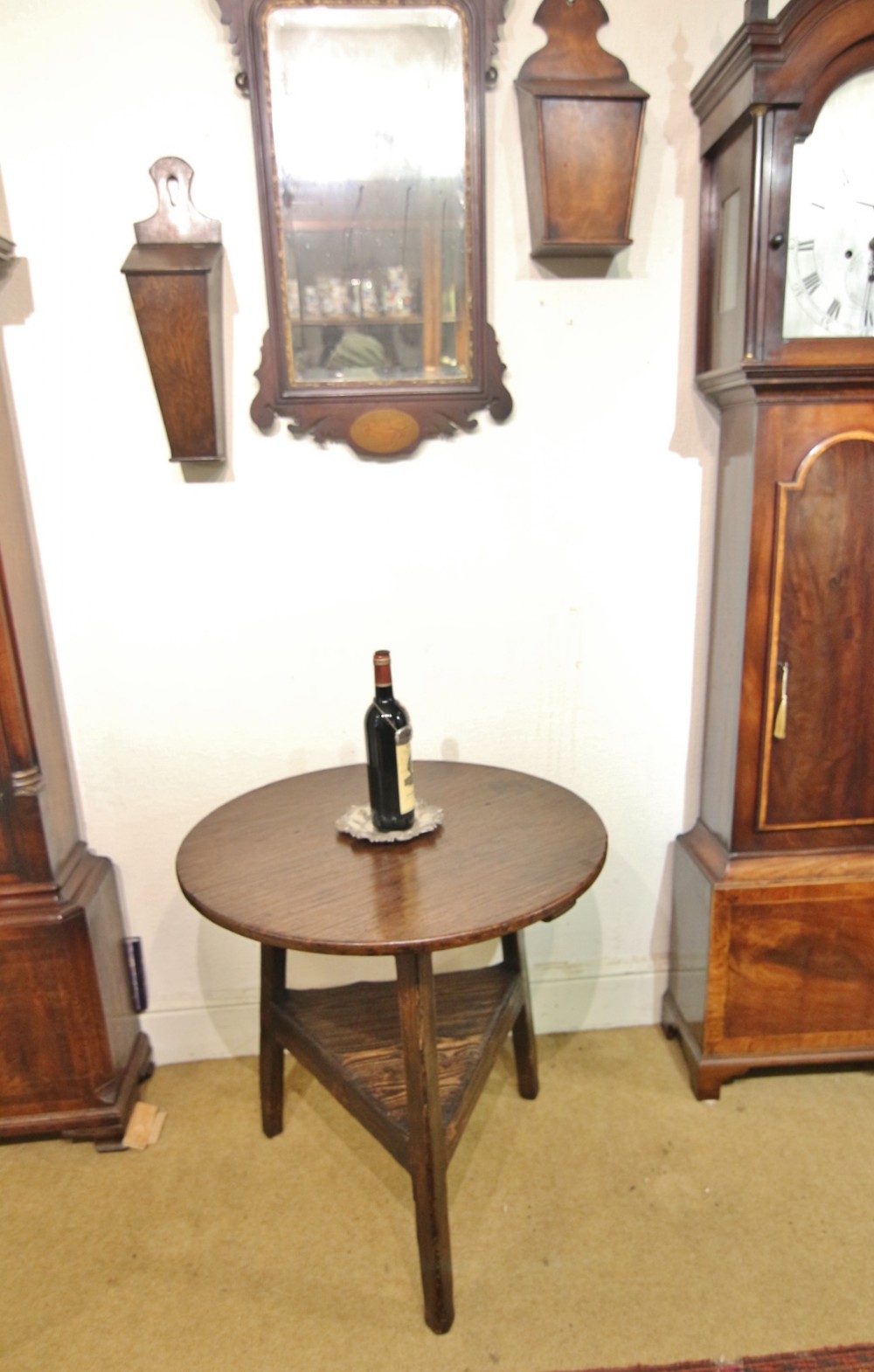 A SUPERB EXAMPLE OF A 19TH CENTURY OAK TWO PIECE TOP OAK CRICKET TABLE; POLISHED TOP SET ON NICELY WEATHERED TACTILE COLOURED DARK PINE BASE , PEGGED CONSTRUCTION WITH LOWER SHELF. STRUCTURALLY STURDY READY FOR USE. GENERAL WEAR AS PER AGE AND PHOTOS,RESTORED CONDITION/ OVERALL EXCELLENT FUNCTIONAL PIECE OF FURNITURE. BOUGHT PRIVATELY NORTH WALES.