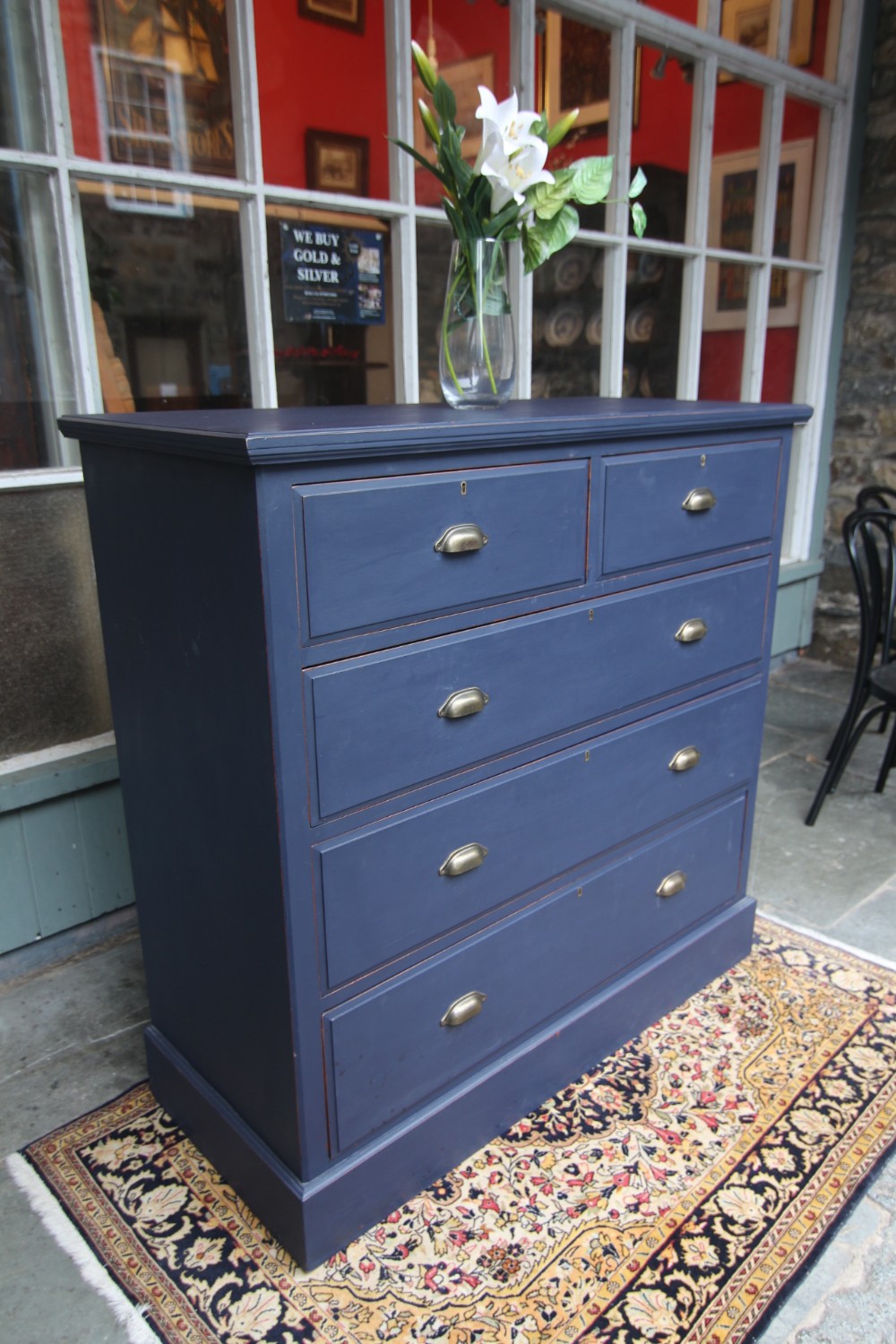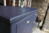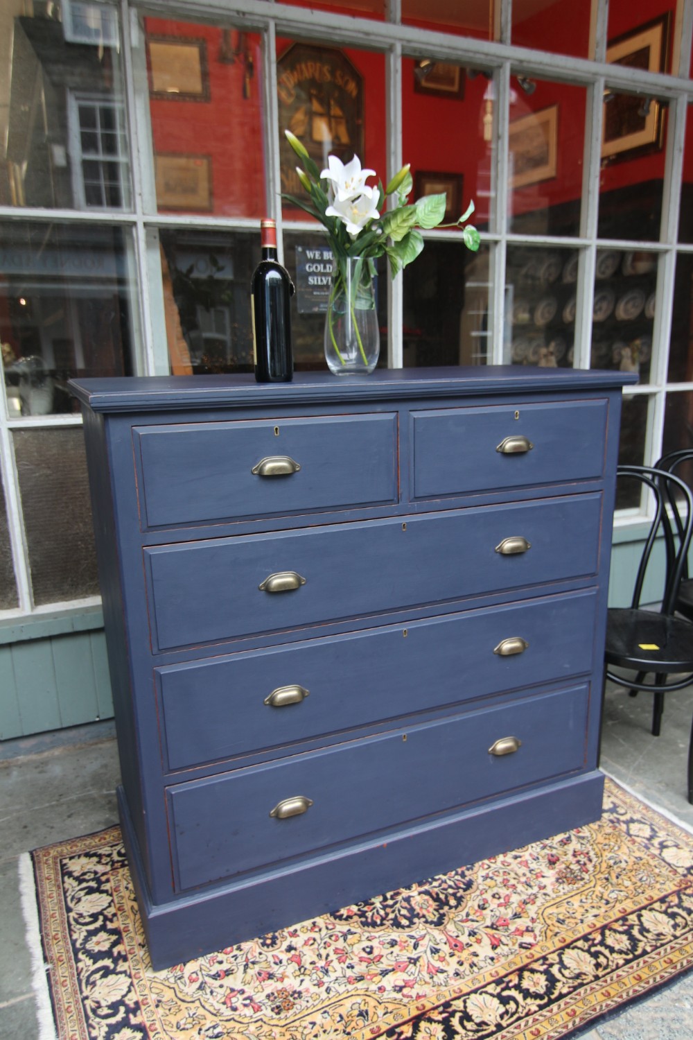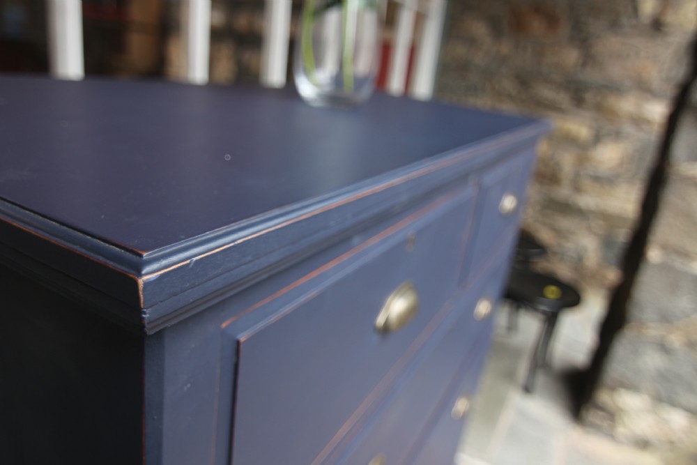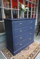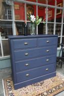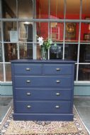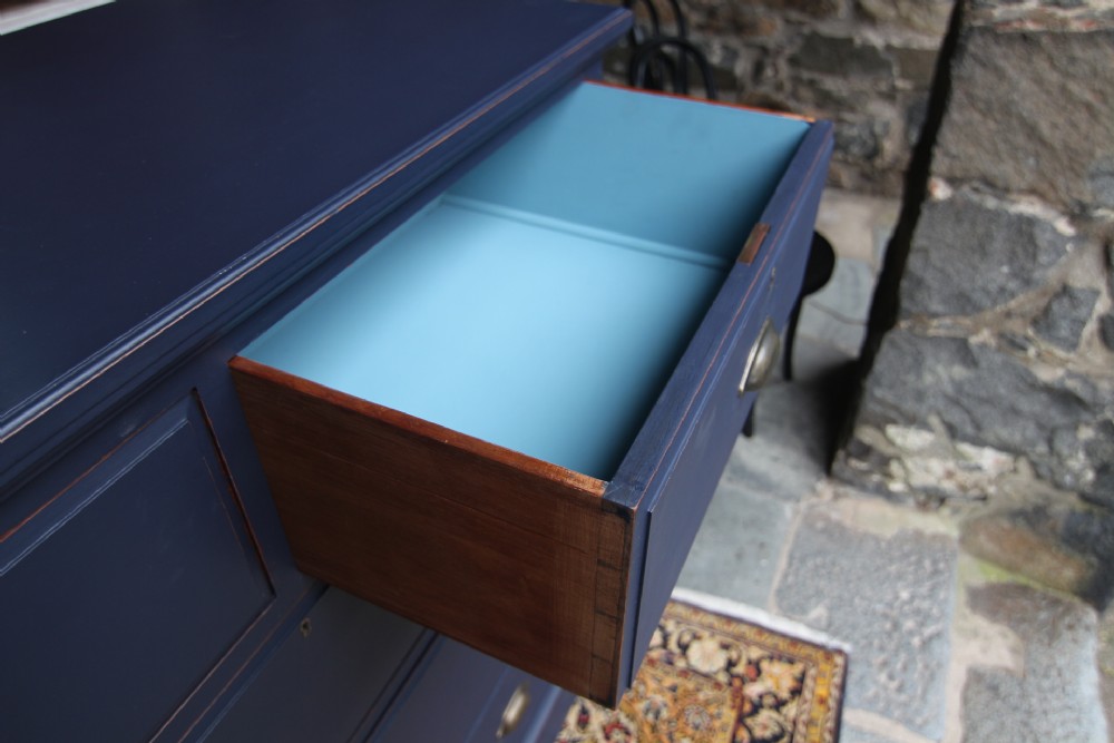 AN IMMACULATE EDWARDIAN HARDWOOD CHEST OF DRAWERS; SOLID TOP WITH SQUARE EDGE OGEE MOULDING, TWO SHORT OVER THREE LONG DOVETAILED GRADUATED DRAWERS WITH BRASS CUP HANDLES. SOLID TIMBER SIDES AND BACK, ROYAL BLUE TONE & DRAWER LINGINGS PAINTED DIFFERENT TONE, STOOD ON SOLID PLINTH. EXCELLENT READY TO USE CONDITION, GREAT STORAGE. BOUGHT PRIVATELY