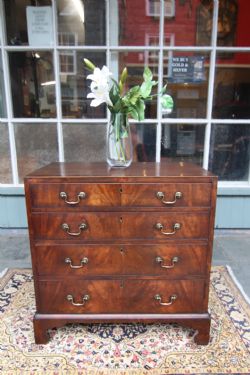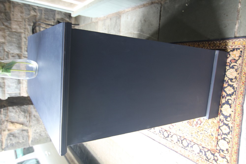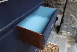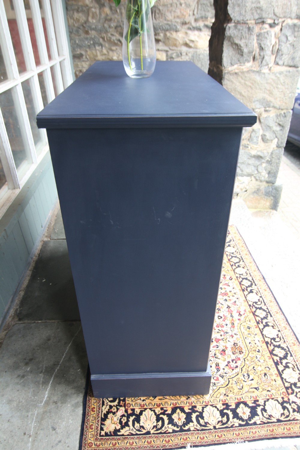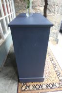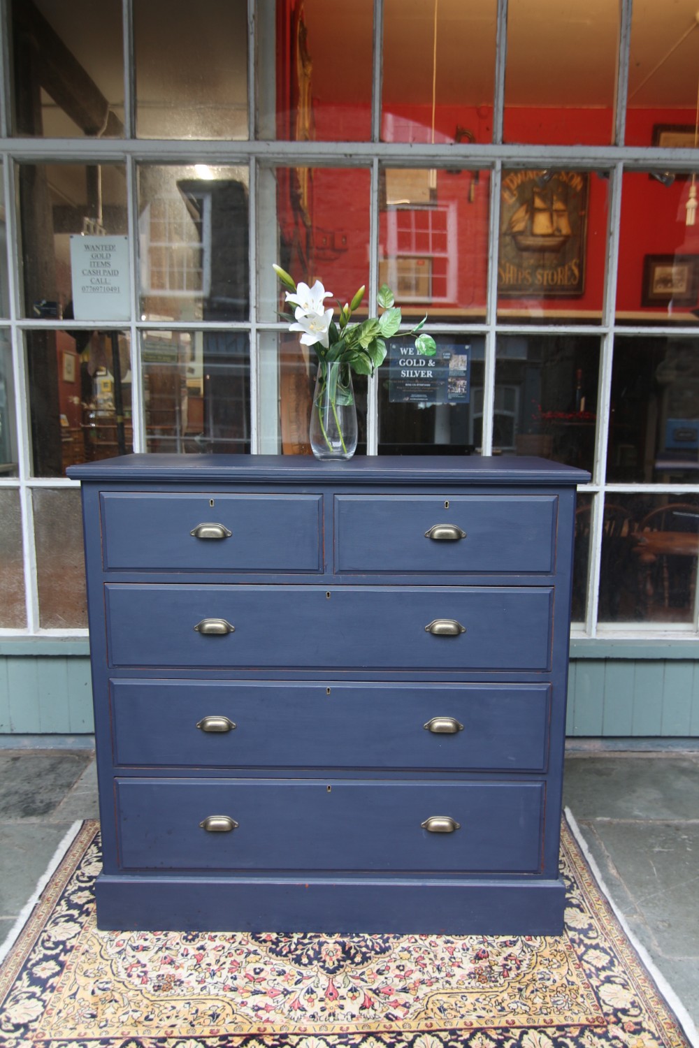 AN IMMACULATE EDWARDIAN HARDWOOD CHEST OF DRAWERS; SOLID TOP WITH SQUARE EDGE OGEE MOULDING, TWO SHORT OVER THREE LONG DOVETAILED GRADUATED DRAWERS WITH BRASS CUP HANDLES. SOLID TIMBER SIDES AND BACK, ROYAL BLUE TONE & DRAWER LINGINGS PAINTED DIFFERENT TONE, STOOD ON SOLID PLINTH. EXCELLENT READY TO USE CONDITION, GREAT STORAGE. BOUGHT PRIVATELY