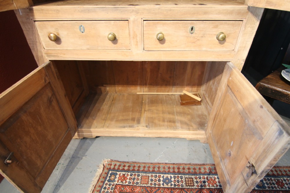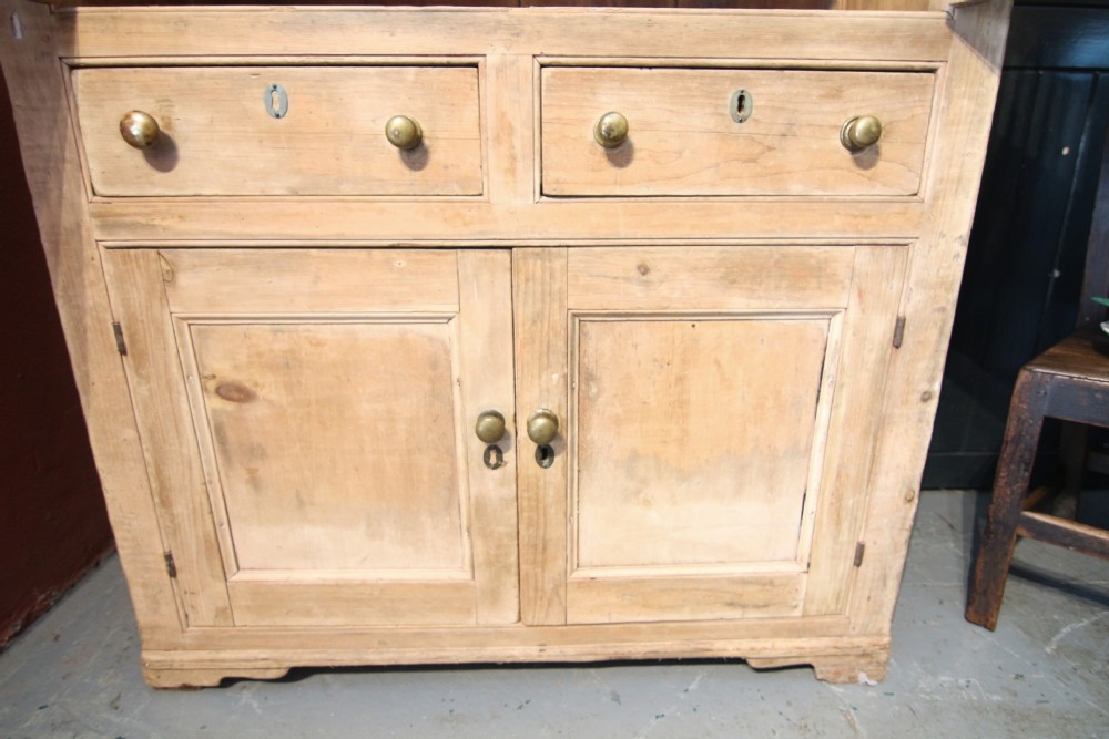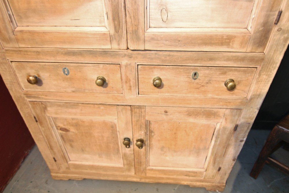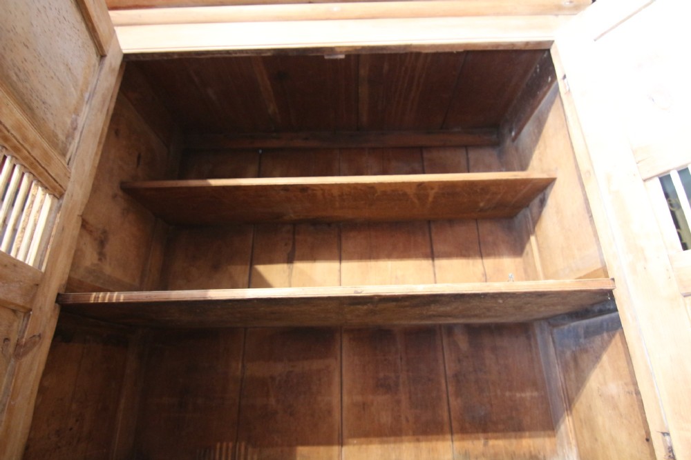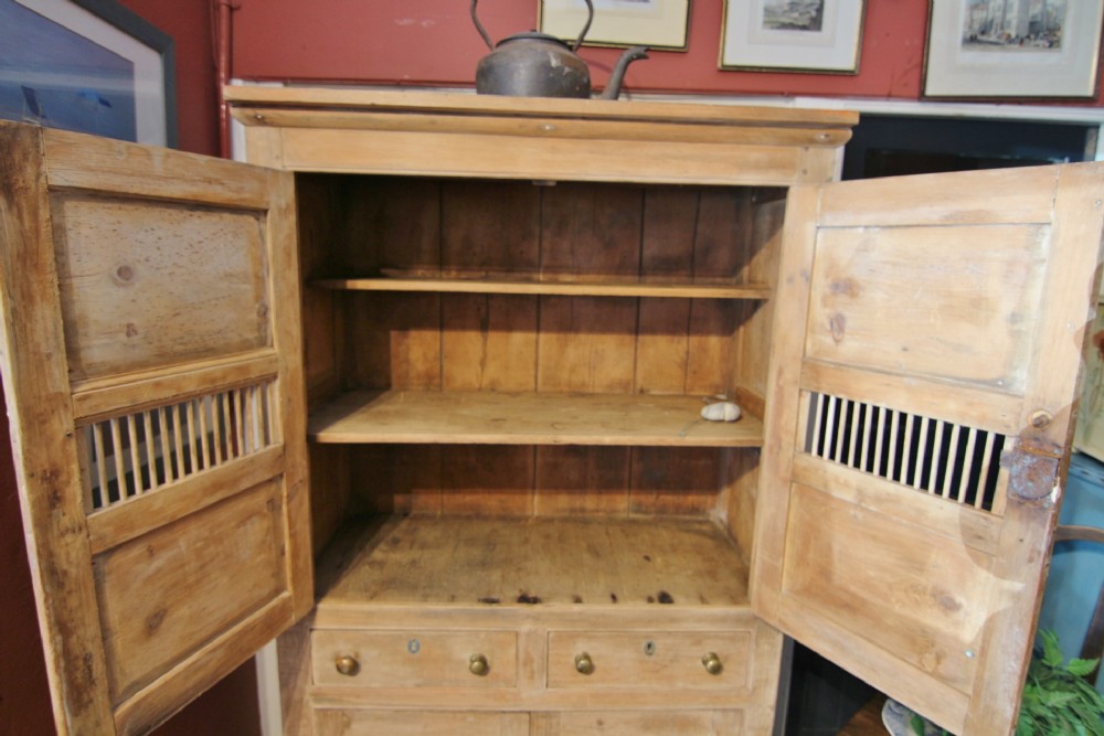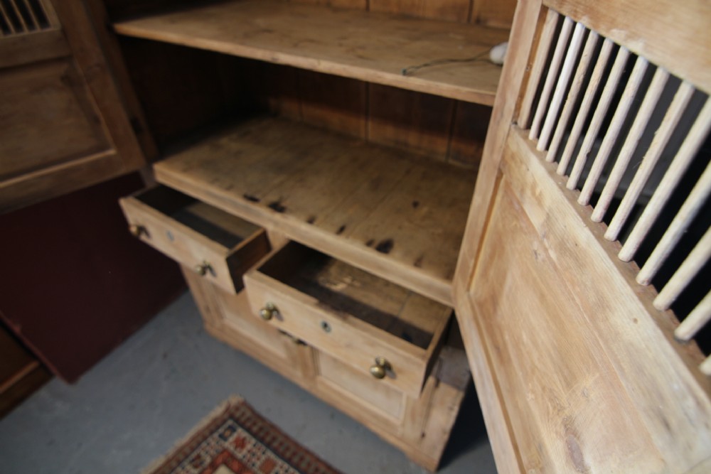 A LOVELY LITTLE HONEST EARLY 19TH CENTURY WELSH BREAD AND CHEESE CUPBOARD ONE PIECE IN PINE; WITH SIMPLE MOULDING ABOVE PANELLED DOORS WITH TURNED SPINDLES AND SHELVED INTERIOR. TWO DOVETAILED DRAWERS ABOVE INSET PANEL CUPBOARD DOORS STOOD ON STILED FEET, PANEL SIDES AND SOLID TIMBER BACK. OBVIOUSLY UNTOUCHED CONDITION PURCHASED FROM DESERTED FARM LLEYN PENINSULA BOUGHT AS SEEN. LOTS OF SMALL FOLK ART TREEN ALSO FROM THE SAME CLEARANCE. BOUGHT PRIVATELY.
