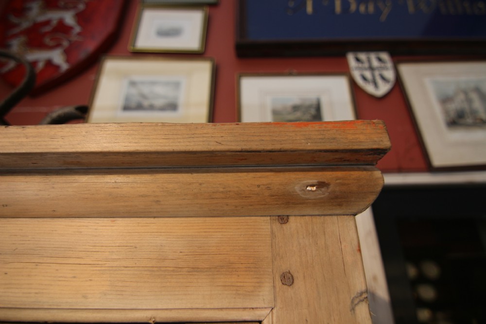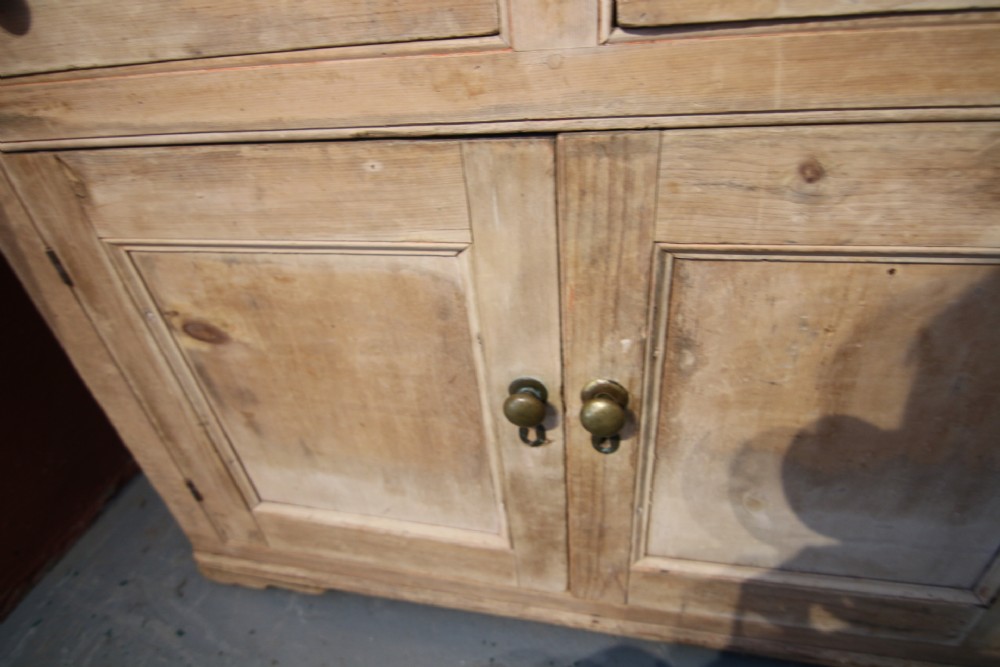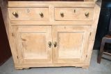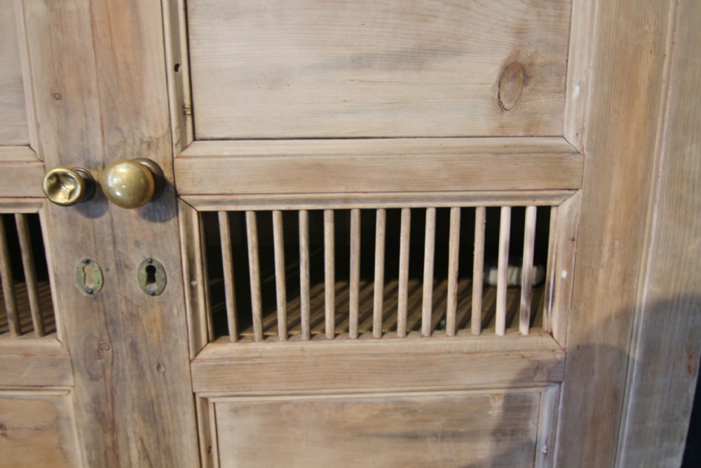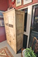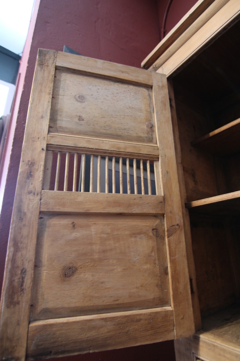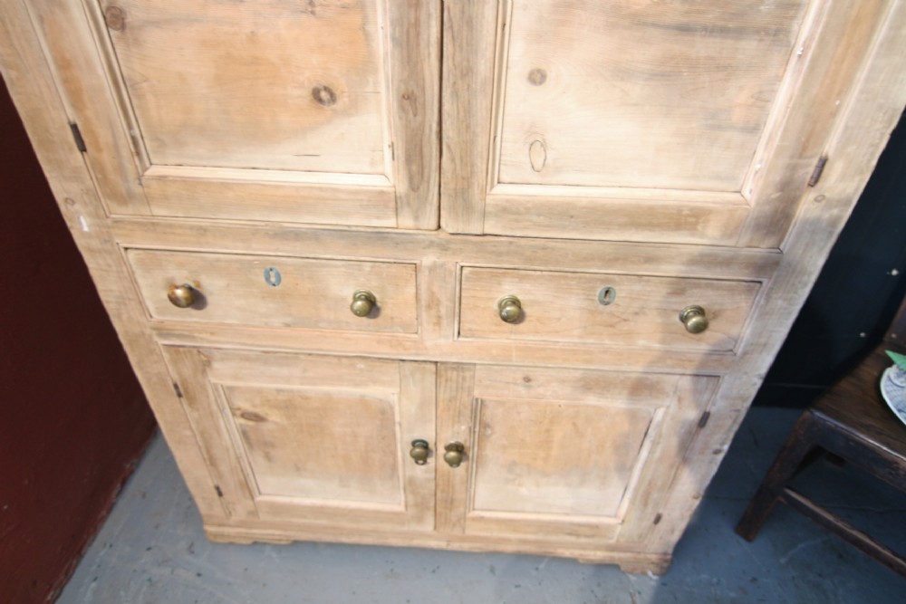 A LOVELY LITTLE HONEST EARLY 19TH CENTURY WELSH BREAD AND CHEESE CUPBOARD ONE PIECE IN PINE; WITH SIMPLE MOULDING ABOVE PANELLED DOORS WITH TURNED SPINDLES AND SHELVED INTERIOR. TWO DOVETAILED DRAWERS ABOVE INSET PANEL CUPBOARD DOORS STOOD ON STILED FEET, PANEL SIDES AND SOLID TIMBER BACK. OBVIOUSLY UNTOUCHED CONDITION PURCHASED FROM DESERTED FARM LLEYN PENINSULA BOUGHT AS SEEN. LOTS OF SMALL FOLK ART TREEN ALSO FROM THE SAME CLEARANCE. BOUGHT PRIVATELY.