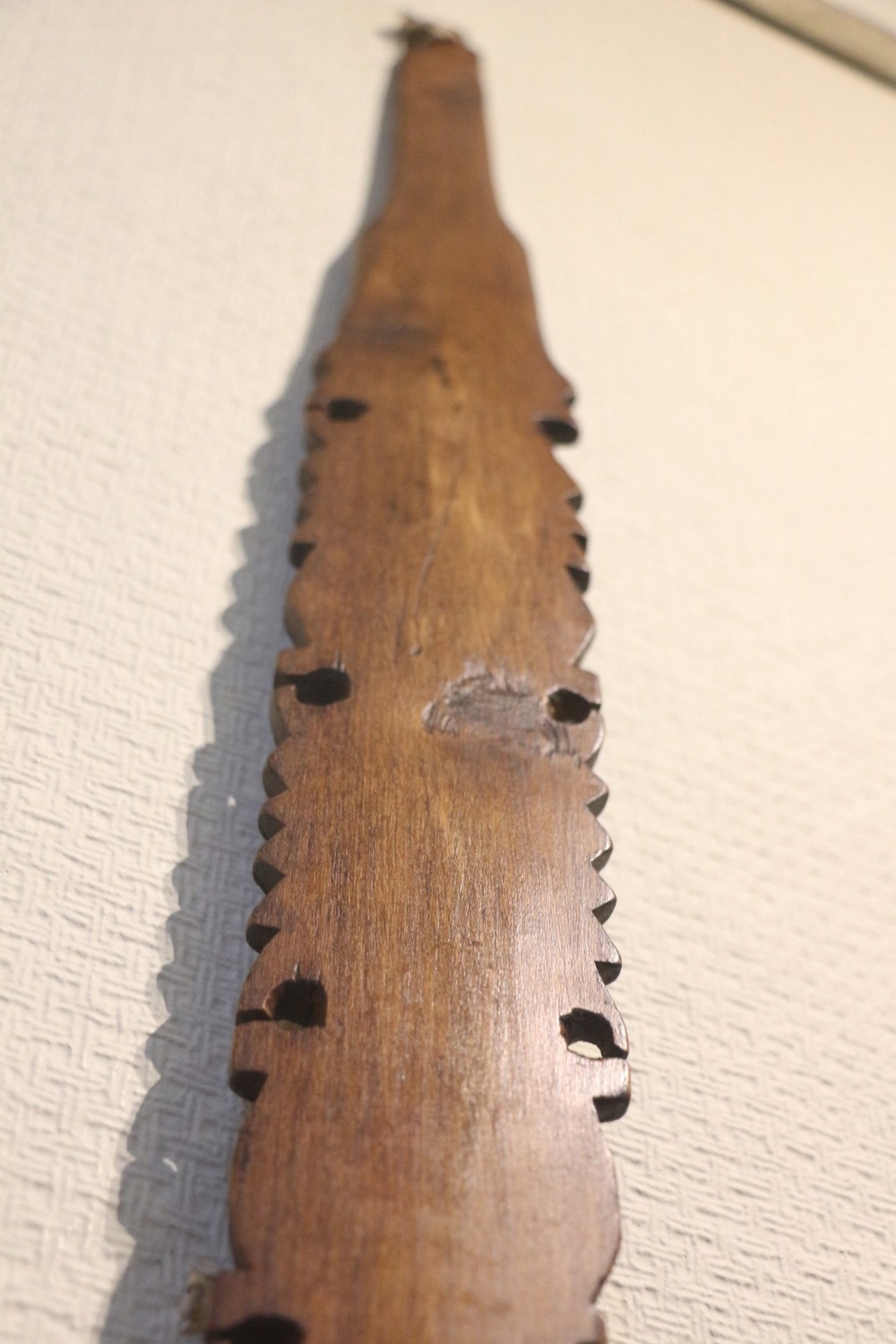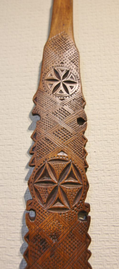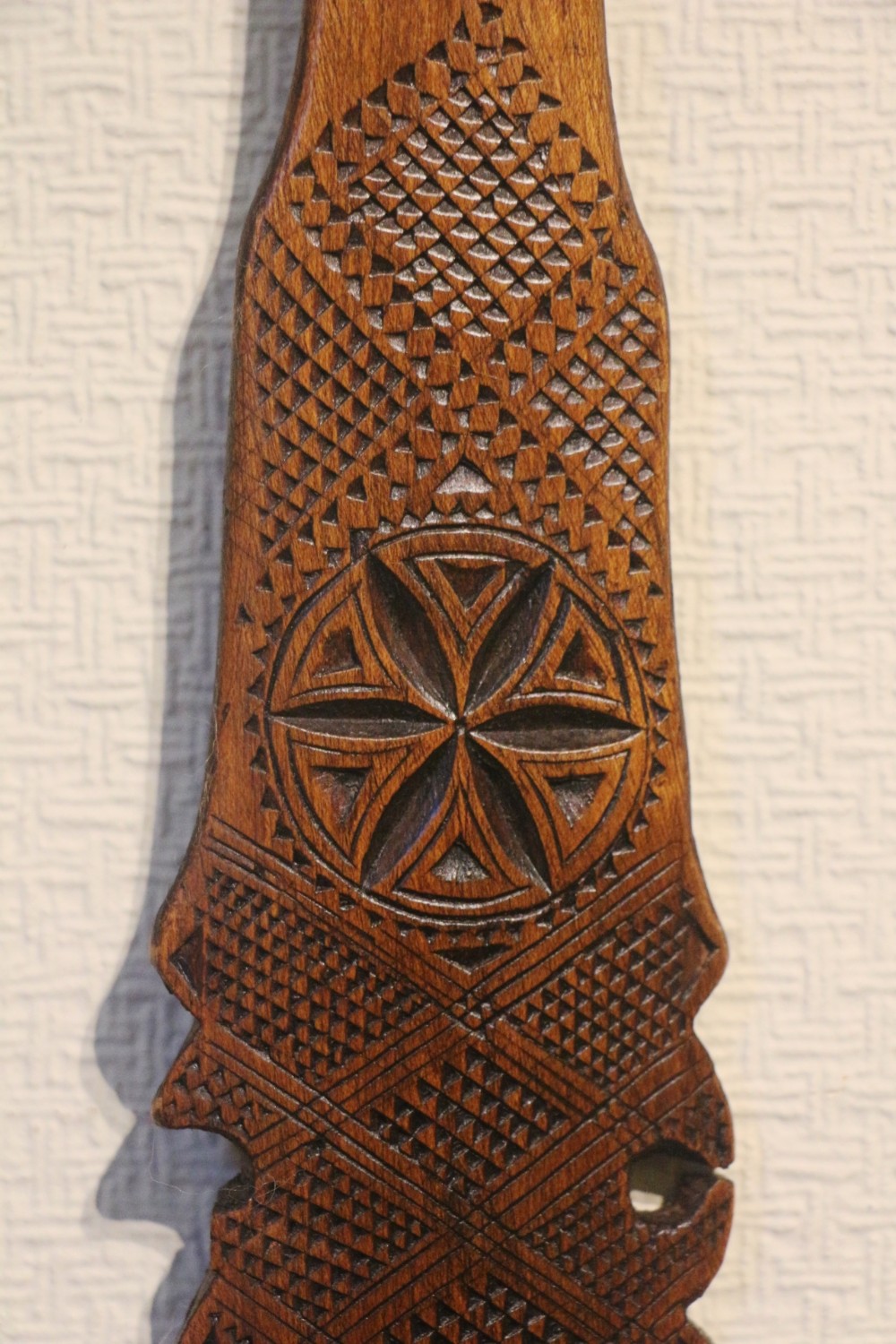 A BEAUTIFULLY CARVED EARLY 19TH CENTURY CARVED DISTAFF- ORIGINALLY USED FOR SPINNING WOOL, THEY BECAME A FORM OF FOLK ART HEIRLOOMS IN MANY EASTERN EUROPEAN AND RUSSIAN STEPPE CULTURES SIMILAR IN TRADITION TO THE CELTIC LOVE SPOON TRADITION.