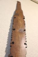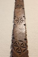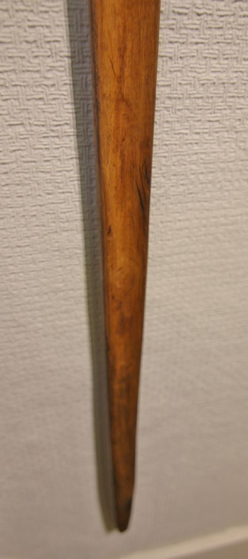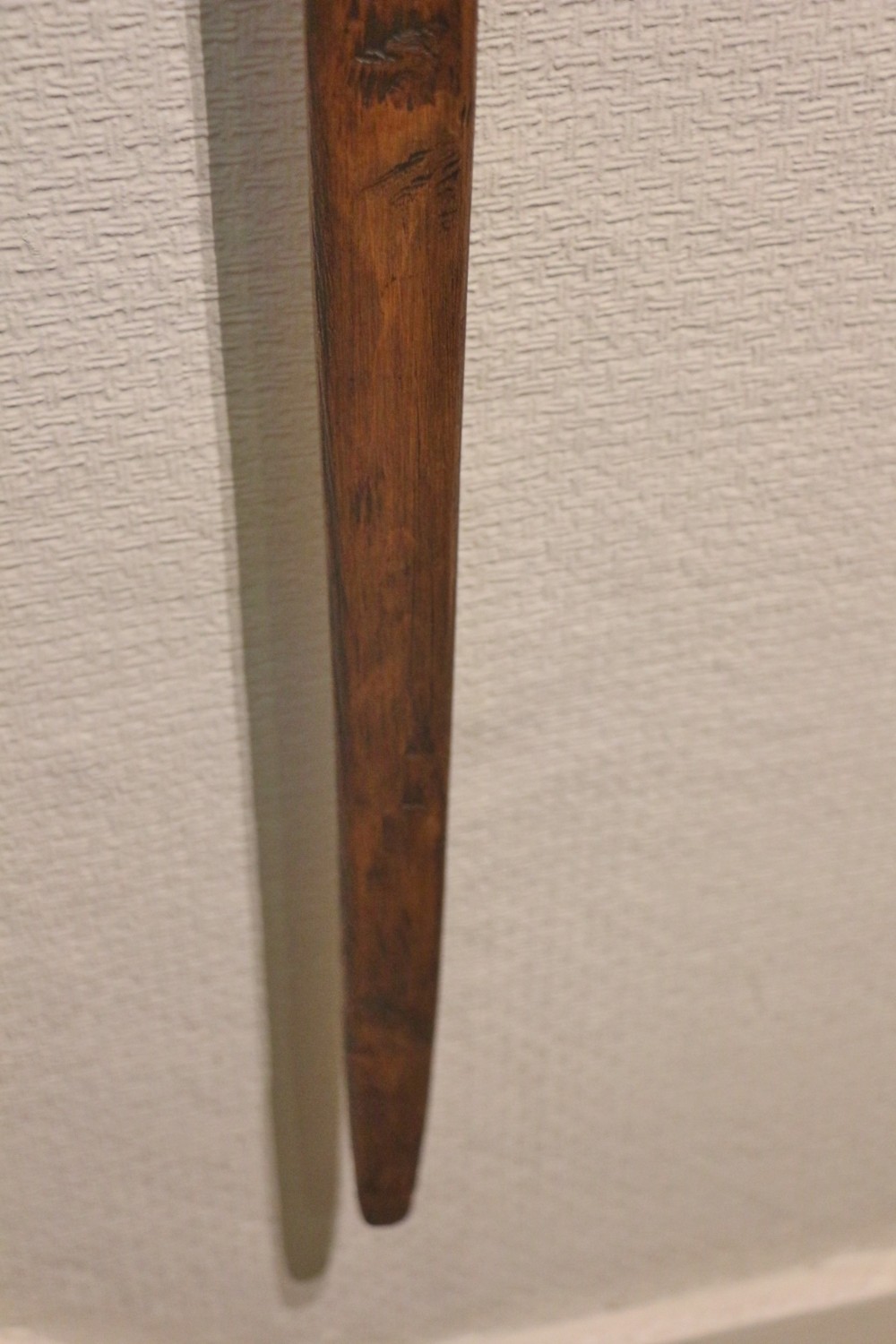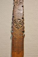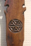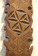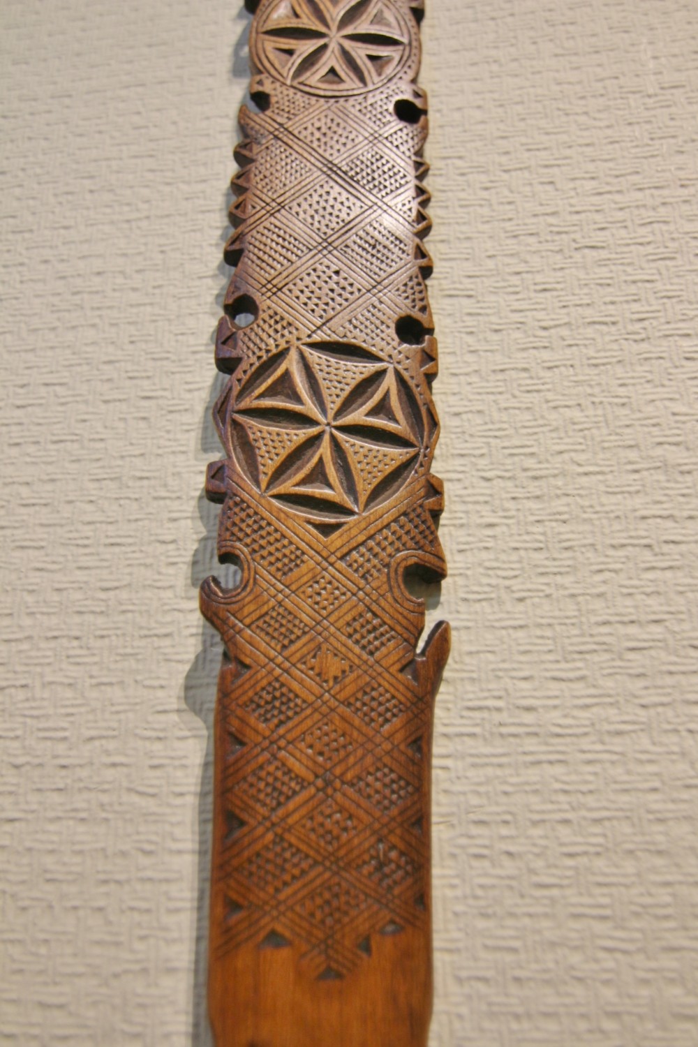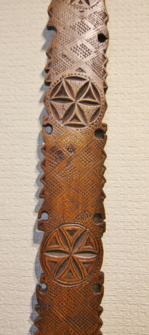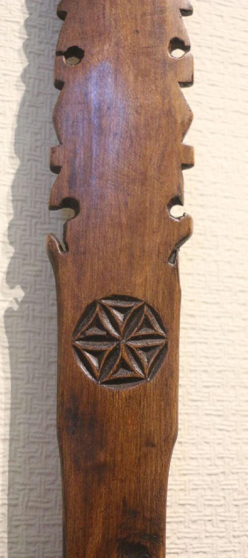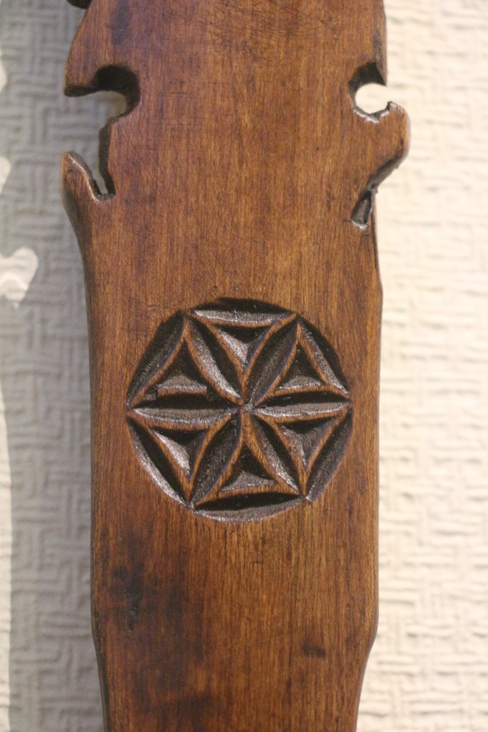 CHIP CARVED GEOMETRIC PATTERNS AND FLORAL MOTIF ADORN THE HARDWOOD STAFF, INTRICATELY CARVED RECTANGULAR PATTERN,SHAPED EDGING CREATING A DECORATIVE PIECE OF ART. GENERAL USAGE WEAR AND LOVELY GOLDEN PATINATION AS PER PHOTO, OLD TRACES OF WORM NOW STABLE AND TREATED.POINT OF INTEREST IS SIMILARLY TO THE MEDIEVAL TRADITION OF CARVING A GEOMETRIC STAR TO THE REAR OF EARLY FURNITURE TO WARD OFF EVIL SPIRITS, THIS HAS ONE CARVED TO THE REAR. FROM A PRIVATE COLLECTION