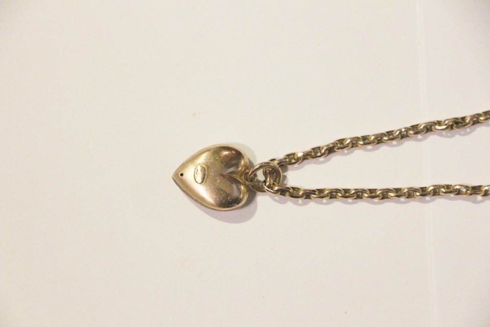 AN ATTRACTIVE 9CT GOLD CHAIN NECKLACE; WITH CLOSED CATCH AND CLOSE LINK MARKED 9CT WITH HEART PENDANT, LIGHT USAGE WEAR OVERALL EXCELLENT CONDITION.7GM APROX 24CM LONG OVERALL. BOUGHT PRIVATELY