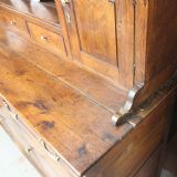 THE BASE WITH POLISHED TOP ABOVE T -SHAPED ARRANGEMENT OF 4 OAK LINED AND DOVETAILED DRAWERS, SHAPED PANEL CUPBOARDS EITHER SIDE, SOLID OAK PANEL SIDES AND BACK, APPLIED BRACKET FOOT STOOD ON SOLID STYLED FEET. GENERAL USAGE WEAR, STRUCTURALLY SOUND, BEAUTIFUL GOLDEN TIMBER USED WITH A LOVELY PATINATION, OLD REPAIR ONE RACK SHOE AS PER PHOTO. BOUGHT PRIVATELY HARLECH REGION NORTH WALES. PLATES OPTIONAL PLEASE ENQUIRE FOR OPTIONS