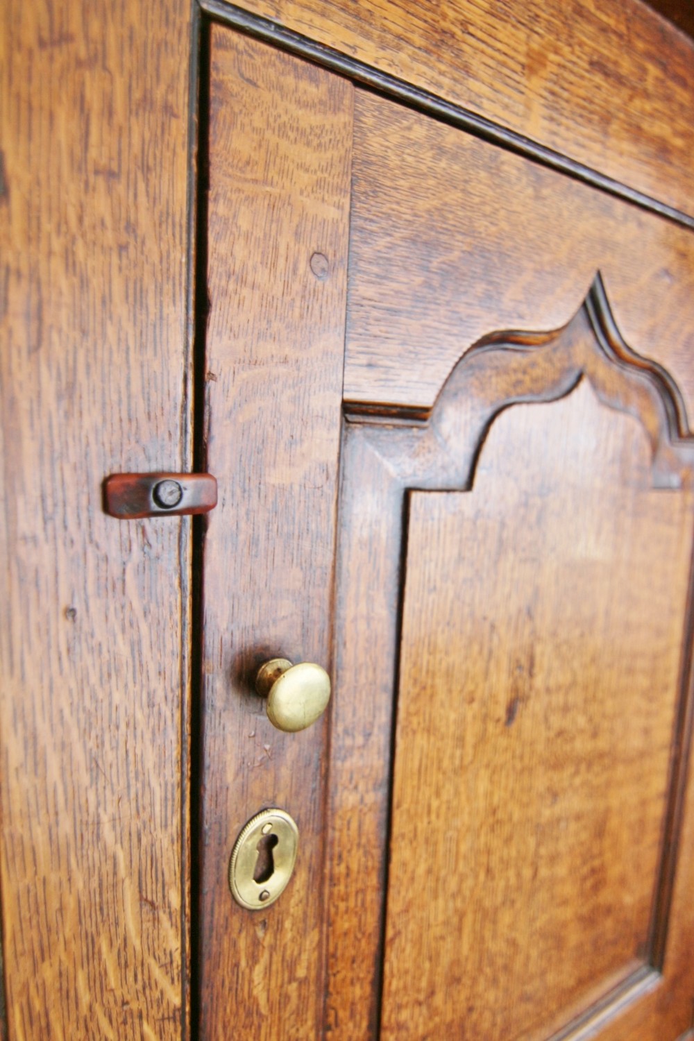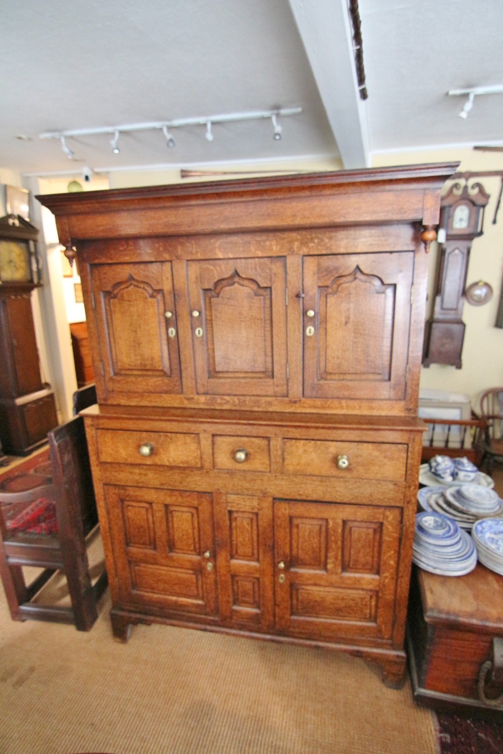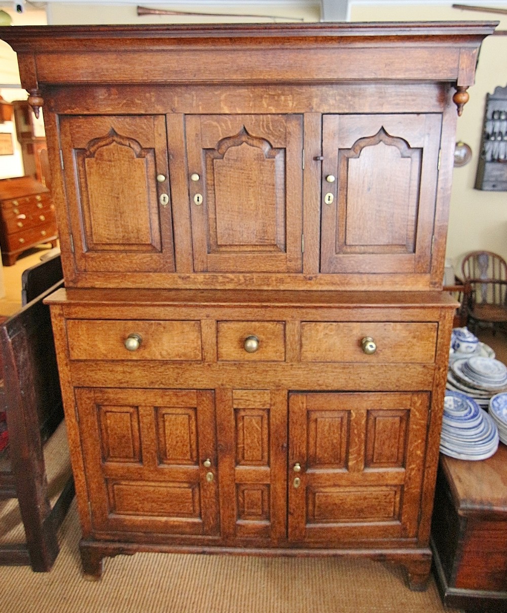 A LOVELY CLEAN WELL PROPORTIONED EXAMPLE OF A MID GEORGIAN OAK DEUDDARN IN TWO PARTS; OGEE CORNICE ABOVE FINELY TURNED DROPPERS, THREE RAISED SHAPE PANEL CUPBOARD DOORS , THE CENTRE WITH INTERIOR SPICE DRAWER. THE LOWER SECTION WITH THREE DOVETAILED DRAWERS WITH BRASS HANDLES ABOVE RAISED PANEL CUPBOARD DOORS, SOLID TIMBER PANEL SIDES AND BACK, STOOD ON STILED FEET. NICE HONEST PIECE STRUCTURALLY SOUND WITH SOME LOVELY DETAIL OF YEW WOOD CATCHES AND DELICATE DETAIL. NORTH WALES MID 18THC.GREAT STORAGE PIECE, GOOD COLOUR AND PATINATION READY TO USE.