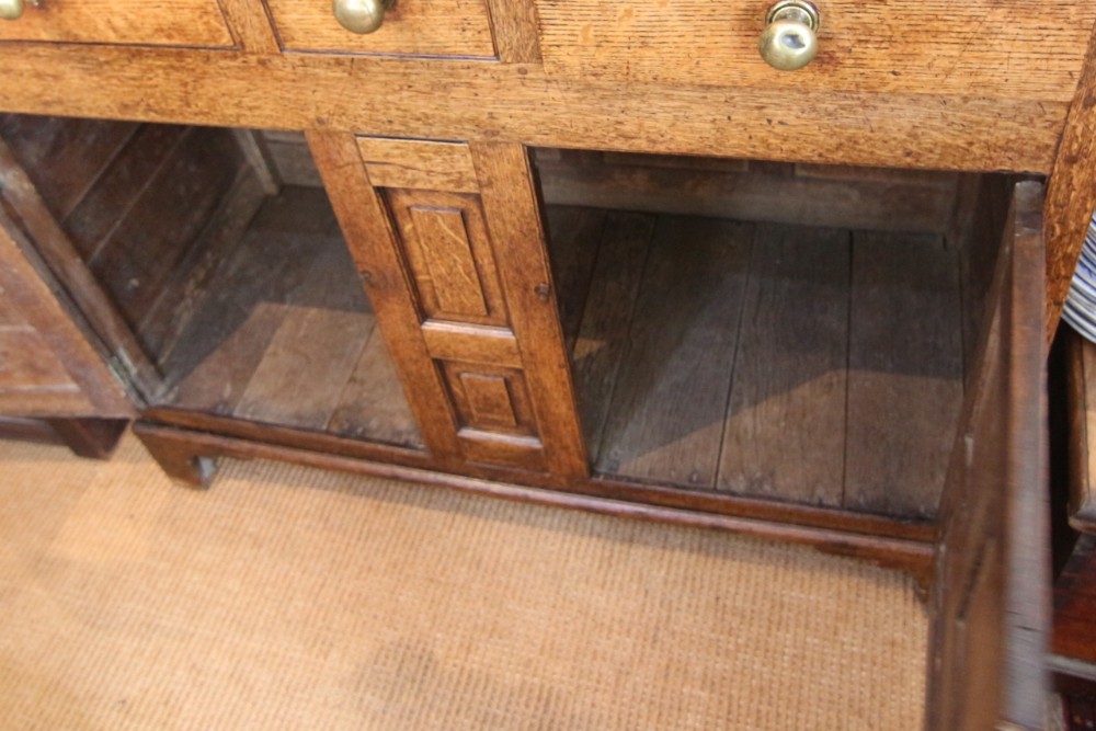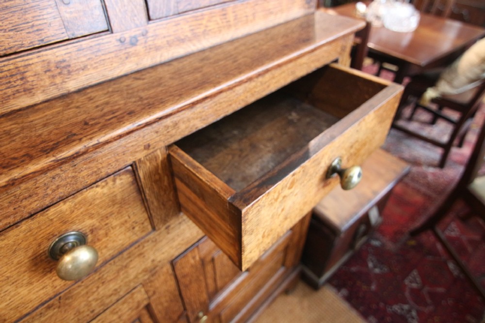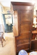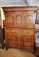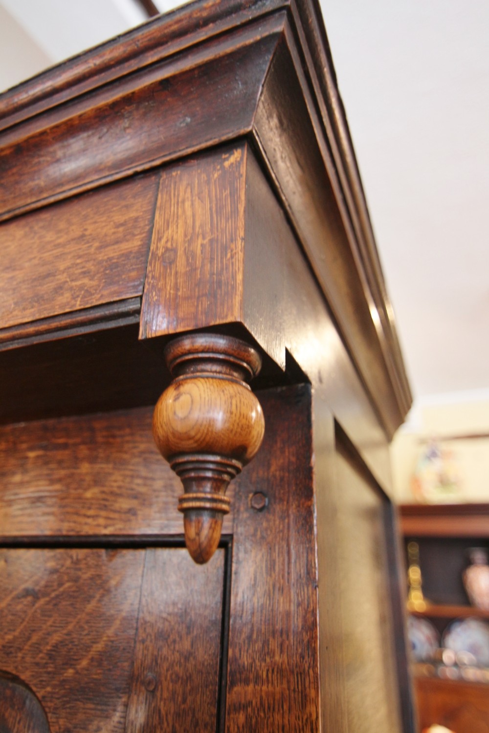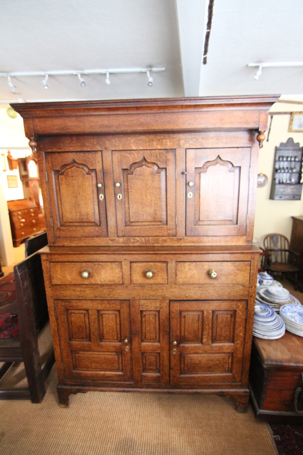 A LOVELY CLEAN WELL PROPORTIONED EXAMPLE OF A MID GEORGIAN OAK DEUDDARN IN TWO PARTS; OGEE CORNICE ABOVE FINELY TURNED DROPPERS, THREE RAISED SHAPE PANEL CUPBOARD DOORS , THE CENTRE WITH INTERIOR SPICE DRAWER. THE LOWER SECTION WITH THREE DOVETAILED DRAWERS WITH BRASS HANDLES ABOVE RAISED PANEL CUPBOARD DOORS, SOLID TIMBER PANEL SIDES AND BACK, STOOD ON STILED FEET. NICE HONEST PIECE STRUCTURALLY SOUND WITH SOME LOVELY DETAIL OF YEW WOOD CATCHES AND DELICATE DETAIL. NORTH WALES MID 18THC.GREAT STORAGE PIECE, GOOD COLOUR AND PATINATION READY TO USE.