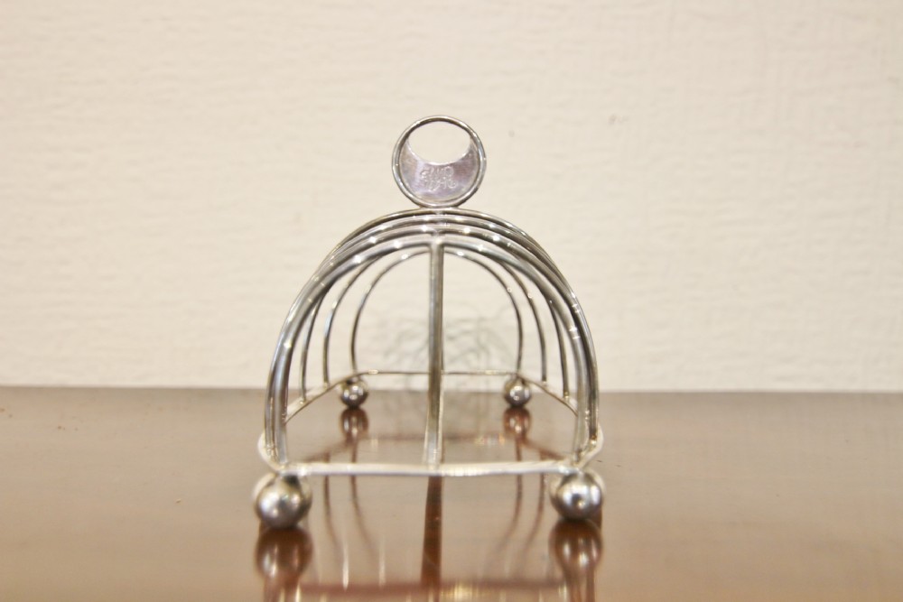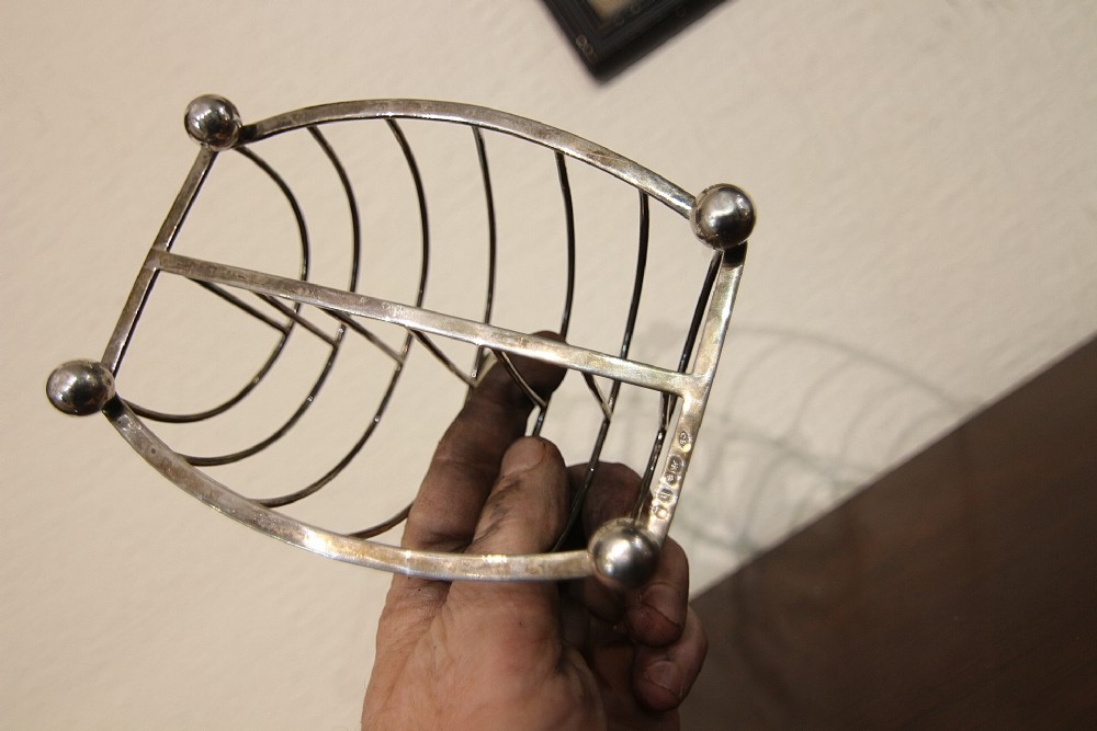 A SOLID SILVER GEORGE III TOASTRACK; WITH ENGRAVED MONOGRAM TO THE TOP HANDLE, HALLMARKS TO THE LOWER SIDE 'WR' LONDON CF. TERMINATING ON SOLID SILVER BUN FEET. STRUCTURALLY SOUND IN GOOD CONDITION AS PER PHOTOS. TOTAL WEIGHT 185.5G APROX. BOUGHT PRIVATELY