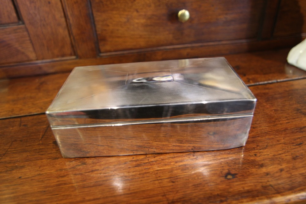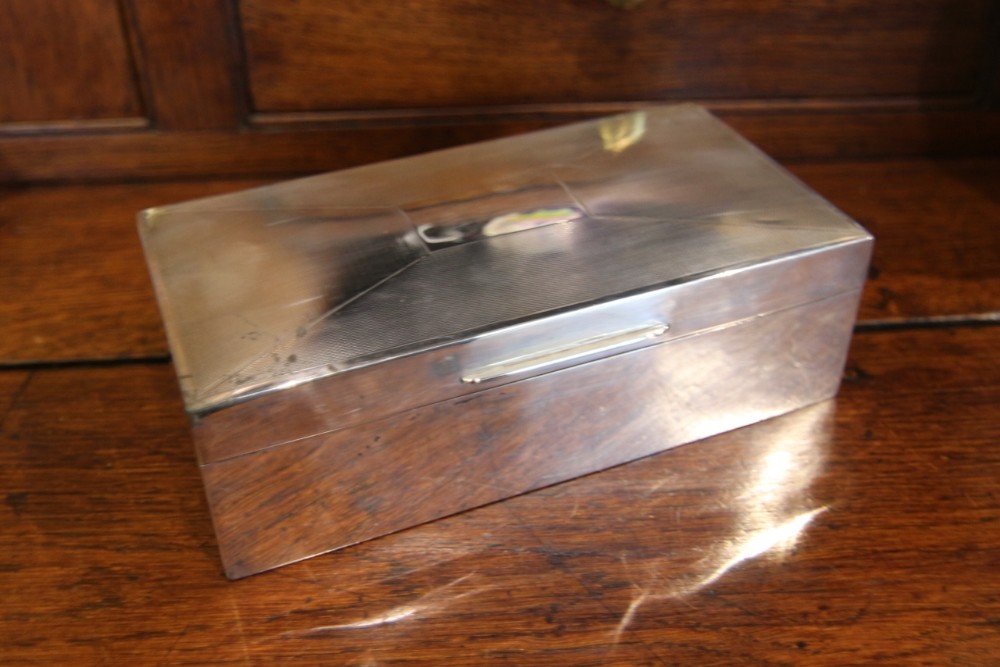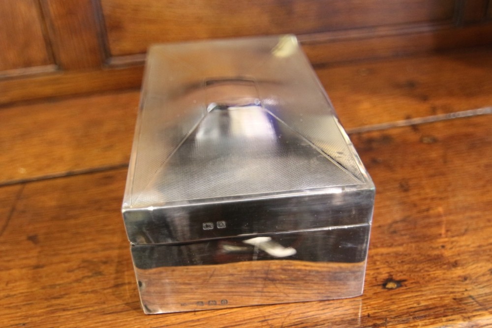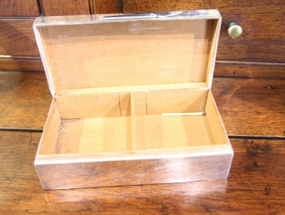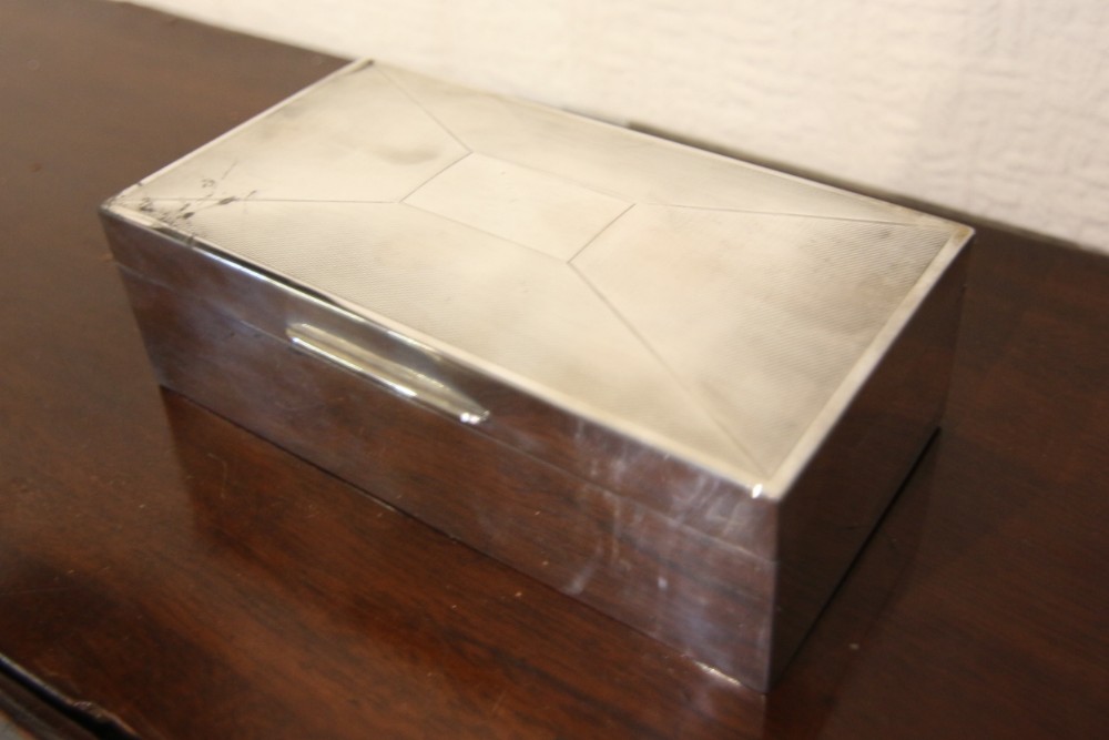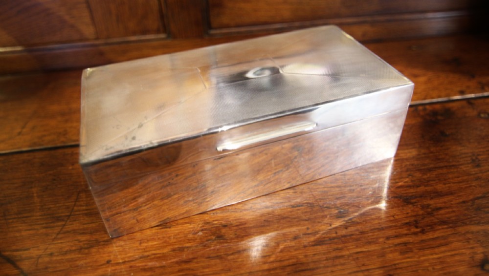 A LARGE HALLMARKED SILVER CIGARETTE CASE BIRMINGHAM 'GWS 'G'G TOTAL WEIGHT 470G APROX. WITH MACHINE TURNED PATTERN AND FITTED WOOD ONTERIOR. GENERAL USAGE WEAR AND OLD DENT AS PER PHOTOS. STRUCTURALLY SOUND. BOUGHT PRIVATELY