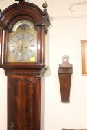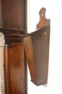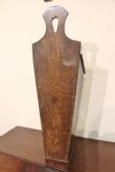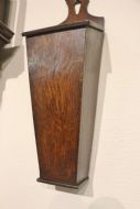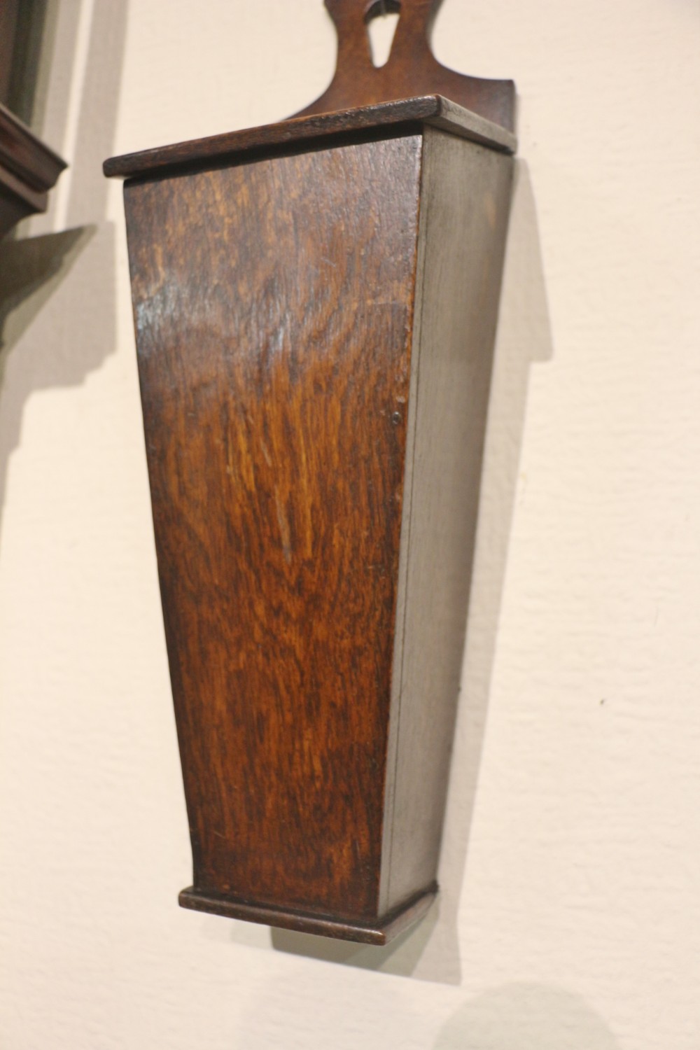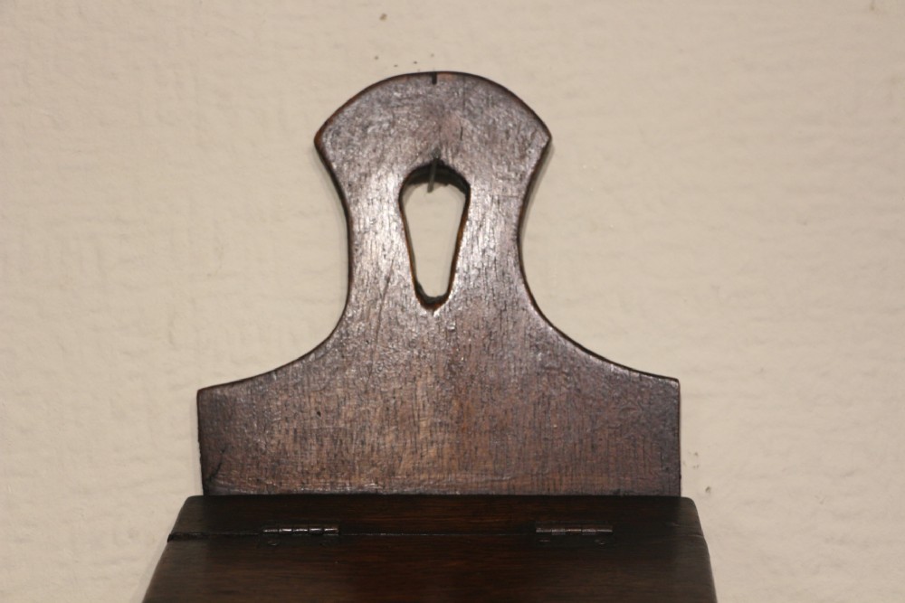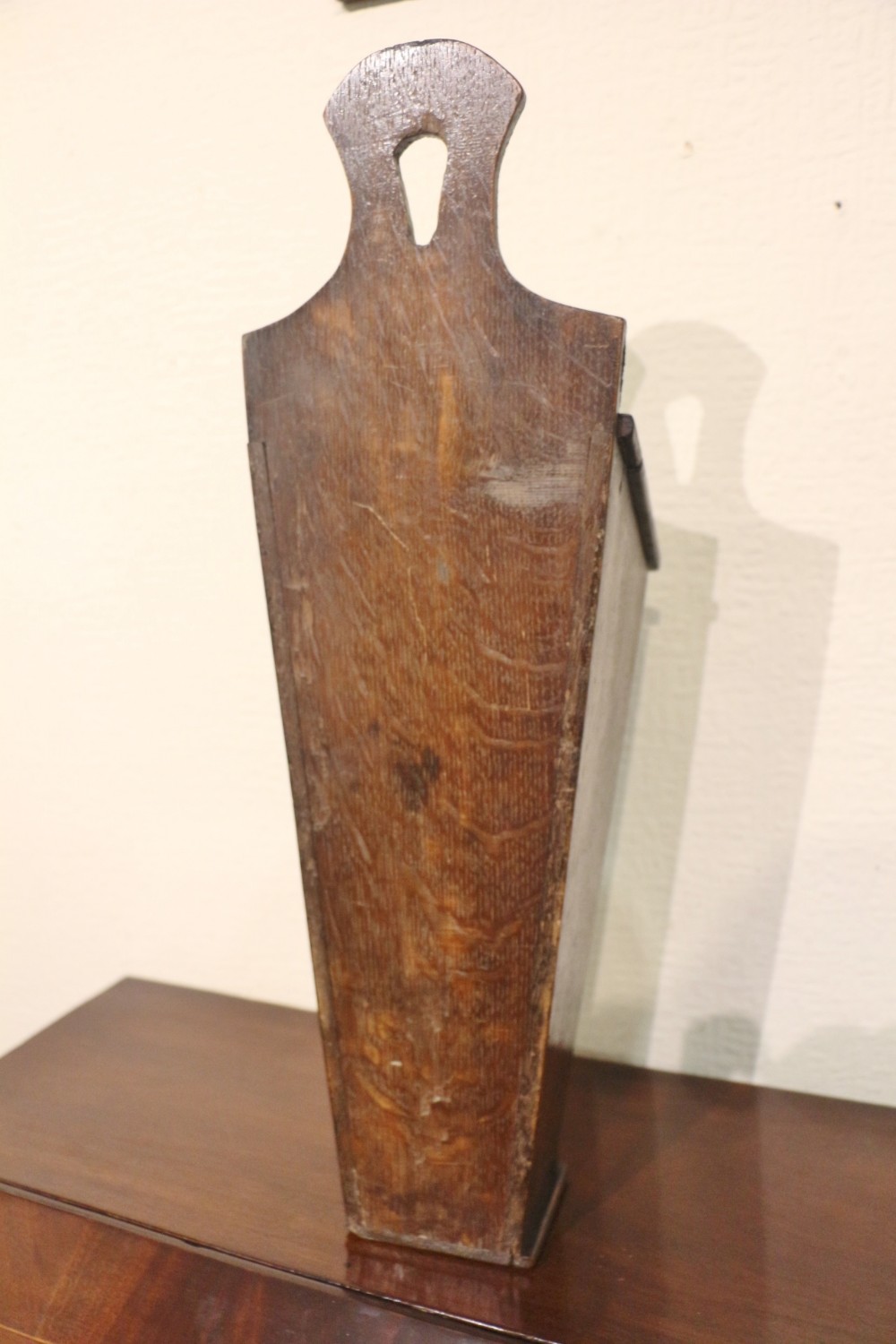 A SLENDER PROPORTIONED SOLID OAK WALL HANGING OAKL CANDLE BOX; WITH SHAPED PIERCED UPPER SECTION, LID WITH BRASS HINGES REVEALING CLEAN INTERIOR. GENERAL USAGE WEAR AS PER PHOTOS, DECENT COLOUR AND PATINATION.