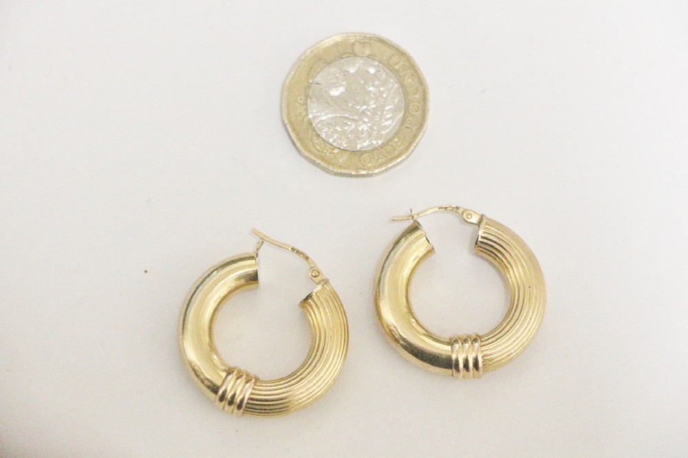 A LARGE PAIR OF 9CT HALLMARKED GOLD HOOPED EARINGS; HALLMARKED CLASP WITH REEDED PATTERN & BANDED,TOTAL WEIGHT G APROX.BOUGHT PRIVATELY