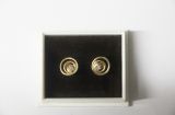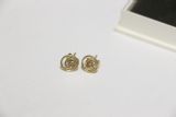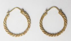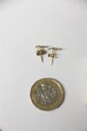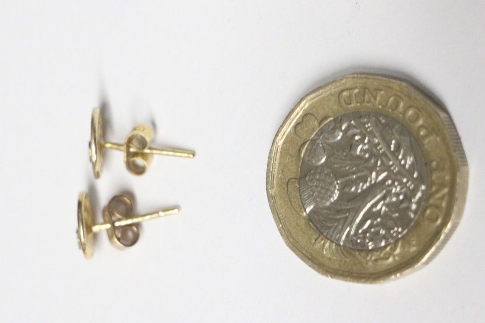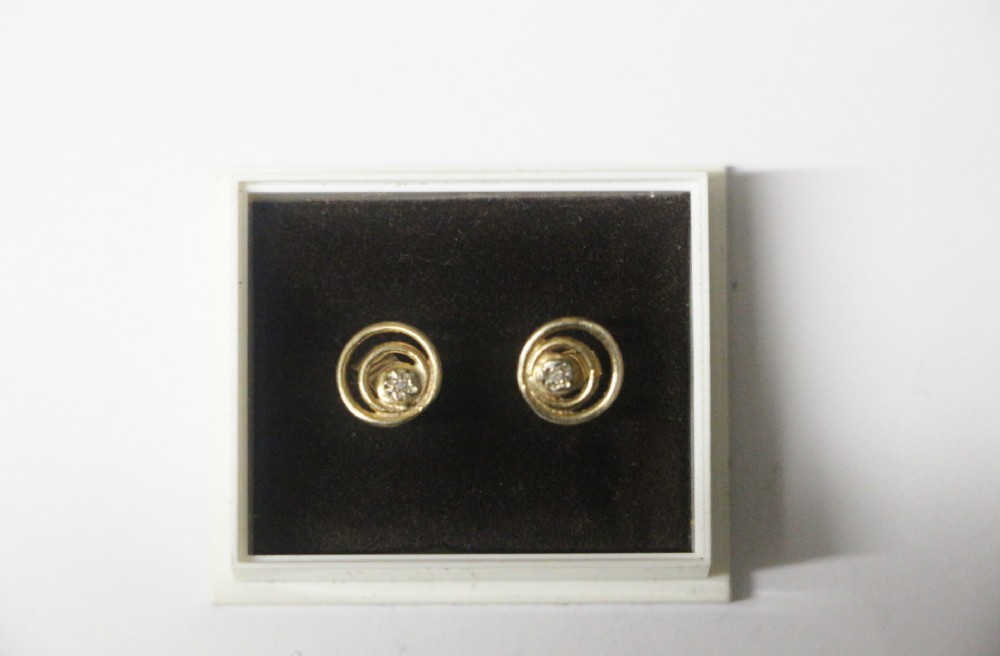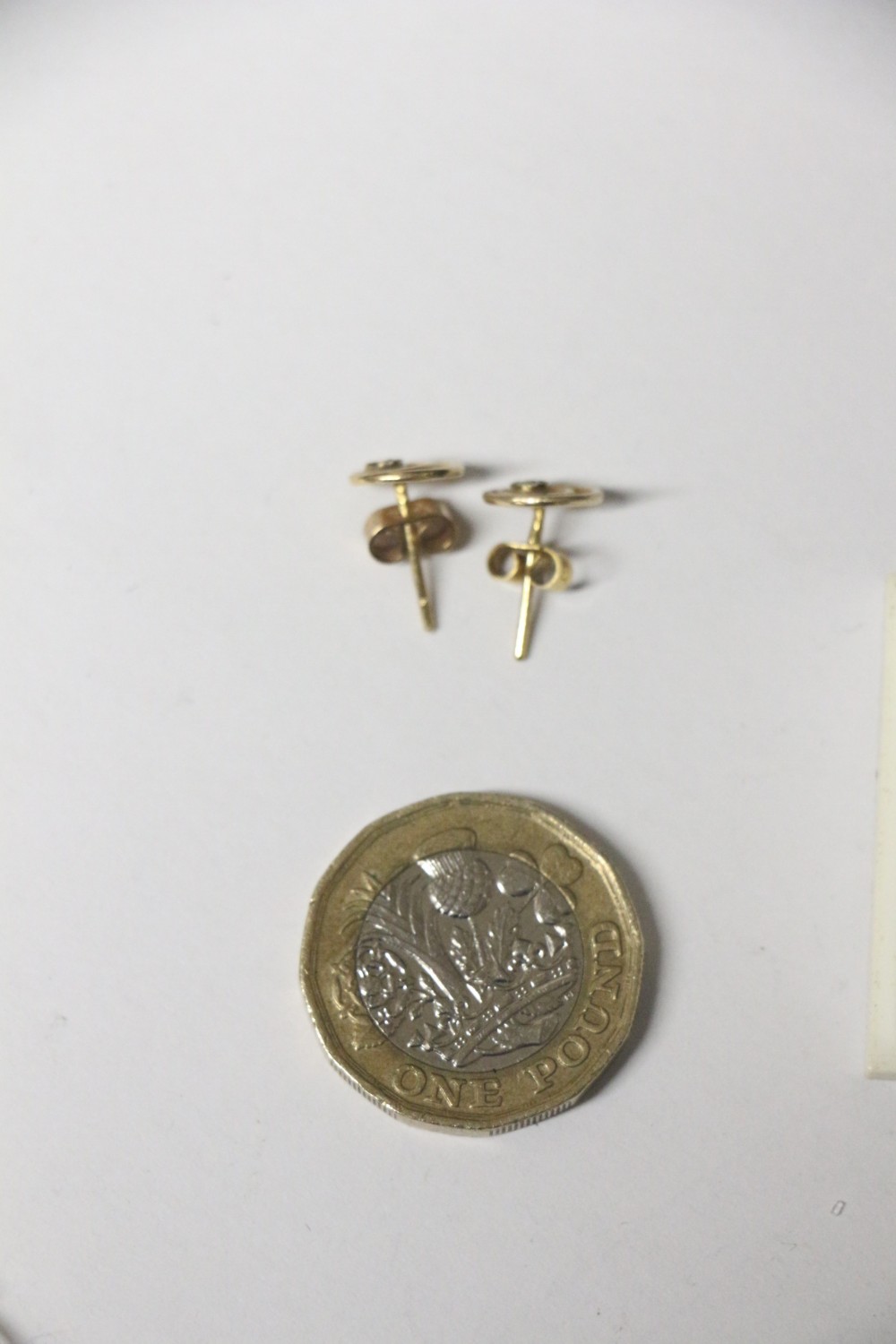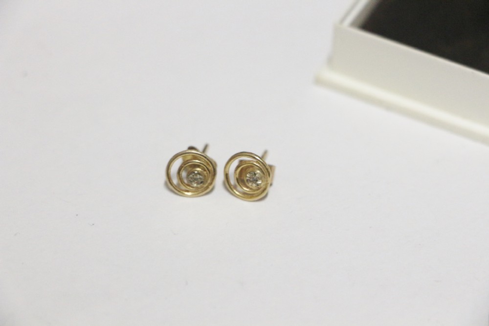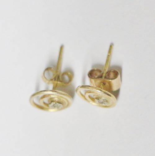 A SMALL PRETTY PAIR OF 14CT GOLD EARINGS; DOUBLE CIRCULAR LOOPS WITH CENTRAL DIAMOND , DIFFERENT STUD BACKS, 1G TOTAL WEIGHT APROX BOUGHT PRIVATELY
