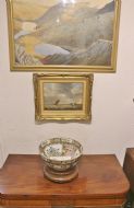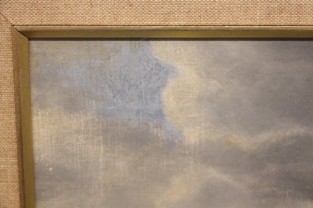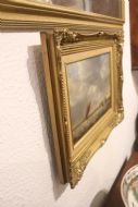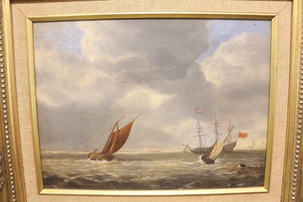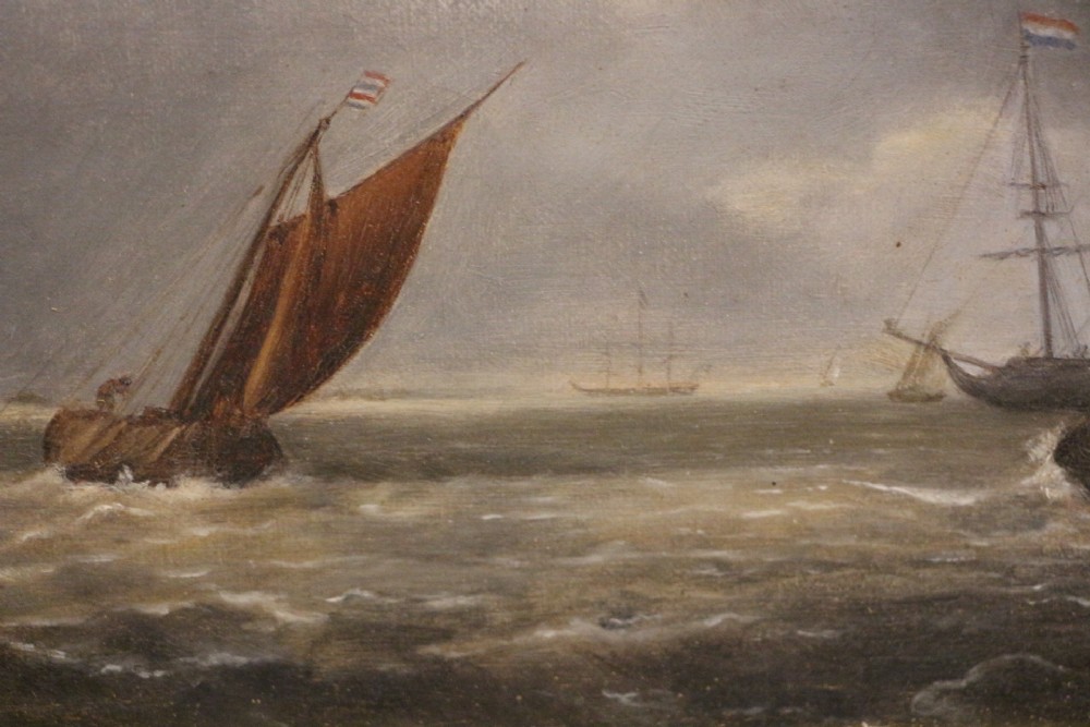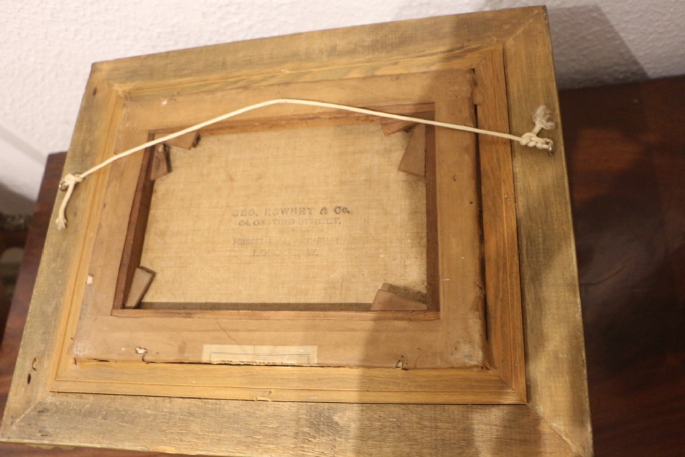 A BEAUTIFULLY EXECUTED 19TH CENTURY OIL PAINTING OF MARITIME SCENE; PERIOD GILT FRAME WITH SAILBOATS TO THE FOREGROUND IN ROUGH SEAS, THREE MASTED SHIPS SEEN IN THE BACKGROUND WITH ATMOSPHERIC CLOUDY SKY. REAR STAMPED 'GEO ROWNEY OXFORD ST LONDON, CANT SEE A SIGNATURE.LIGHT FADING TO SECTION OF SKY AS PER PHOTOS, STRUCTURALLY STABLE IN GOOD OVERALL CONDITION WITH VIBRANT COLOUR. FROM A PRIVATE COLLECTION.