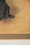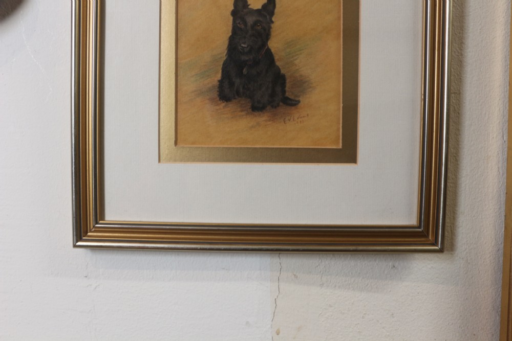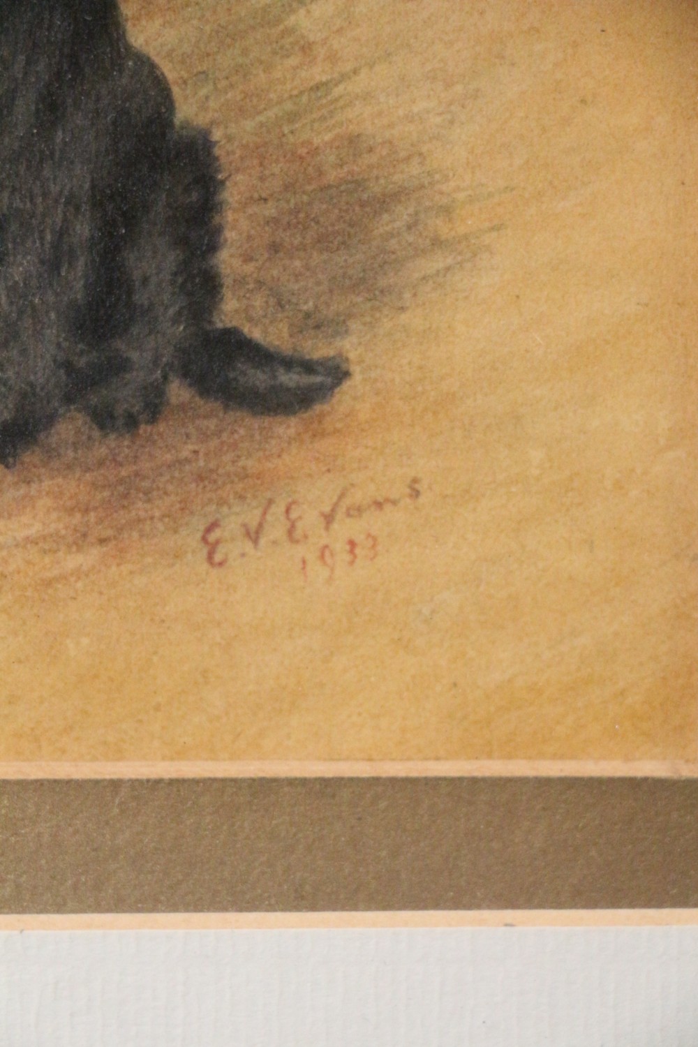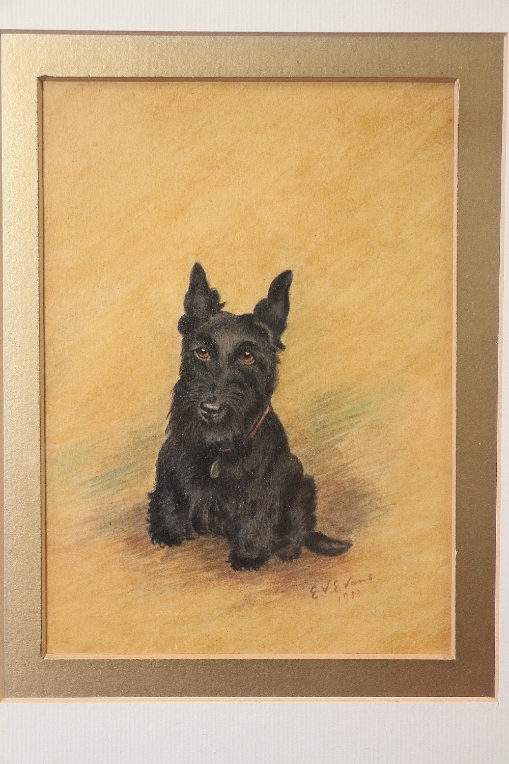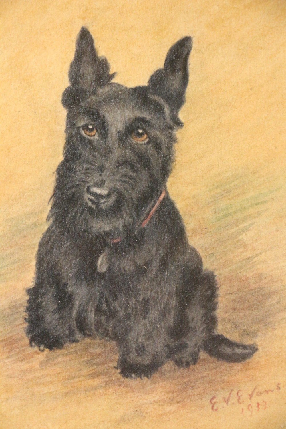 A CHARMING LETTLE PORTRAIT OF A SCOTTISH TERRIER OR SCOTTIE; PASTEL BACKGROUND WITH THE LITTLE CHAP SAT DEMURELY LOOKING BACK. SIGNED E.V EVANS 1933. IN LATER FRAME OVERALL EXCELLENT CONDITION.