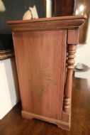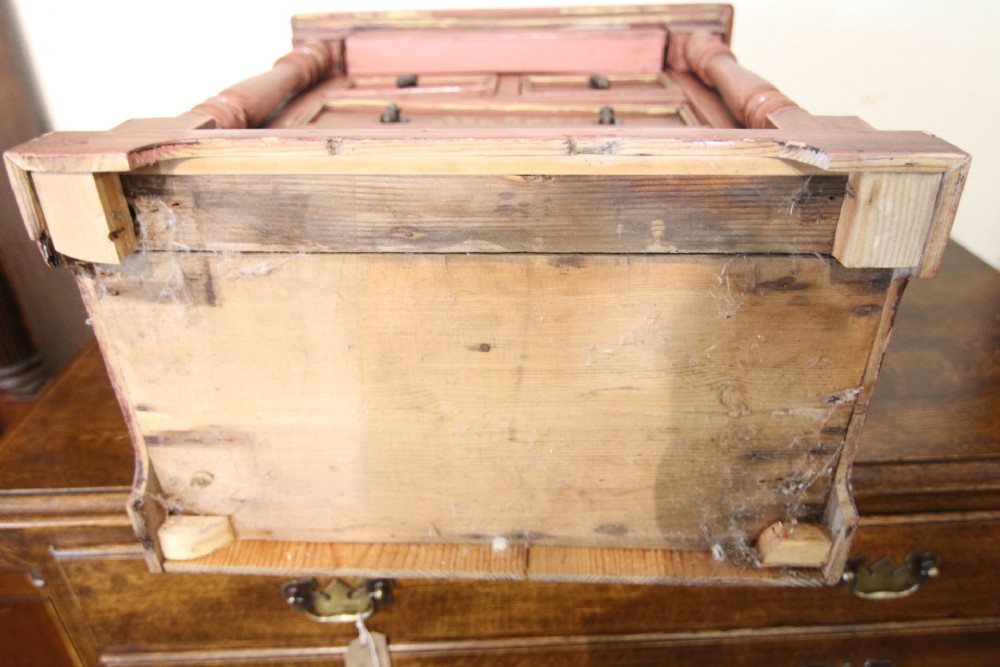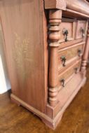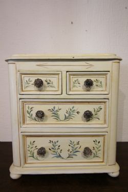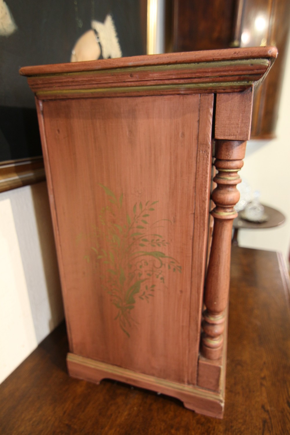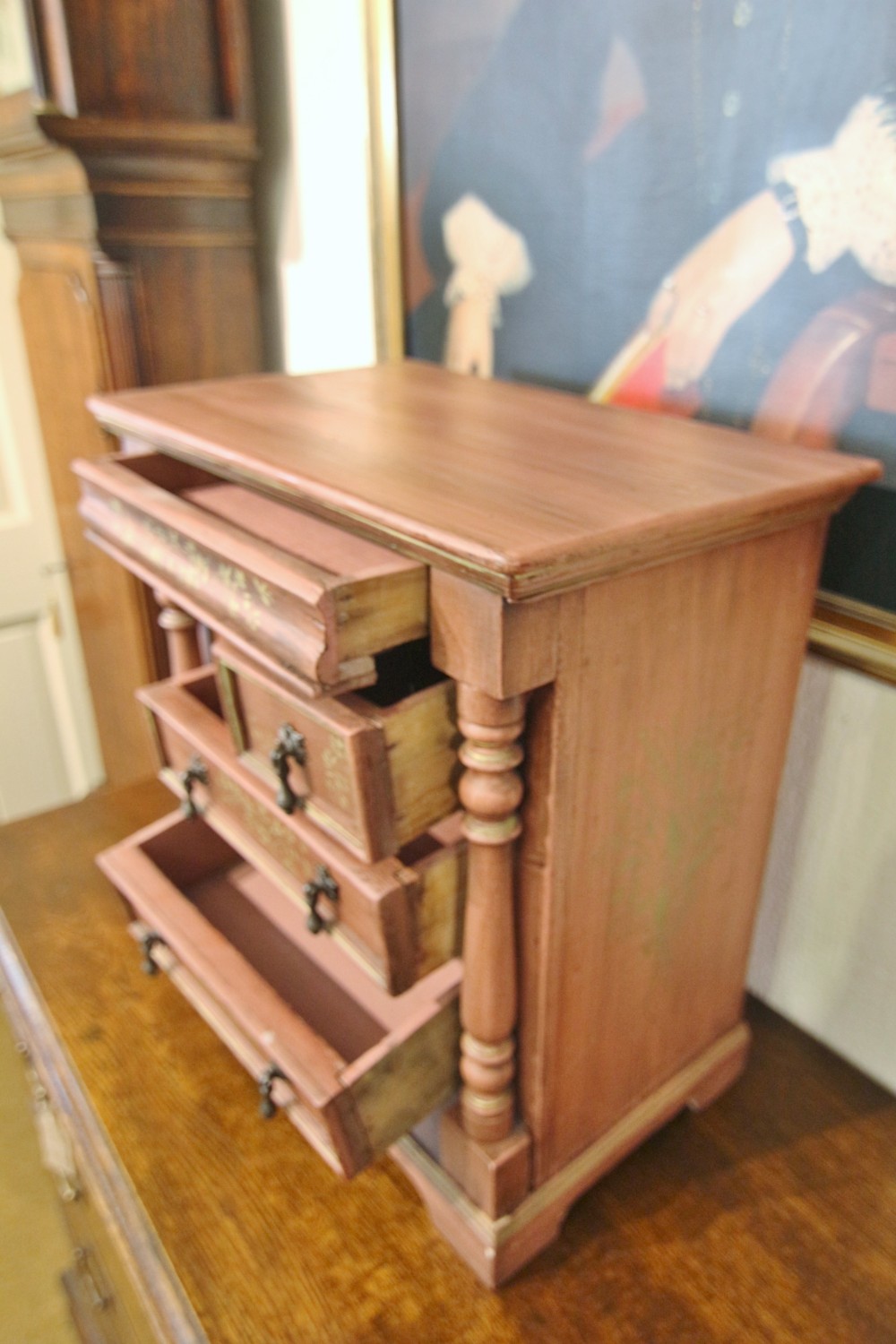 AN ATTRACTIVE LITTLE 19TH CENTURY PINE APPRENTICE PIECE CHEST OF DRAWERS; DECORATIVELY PAINTED BY THE FORMER OWNER ABOUT 30 YEARS AGO WITH GOLD FOLIATE PATTERN. MOULDED TOP ABOVE LONG SECRET DRAWER ABOVE 2 SHORT OVER 2 LONG DOVETAILED DRAWERS , FLANKED BY TURNED COLUMNS. SOLID TIMBER SIDES AND BACK, STOOD ON SHAPED PLINTH FOOT. GENERAL USAGE WEAR OVERALL CLEAN STRUCTURALLY SOUND PIECE. BOUGHT PRIVATELY