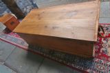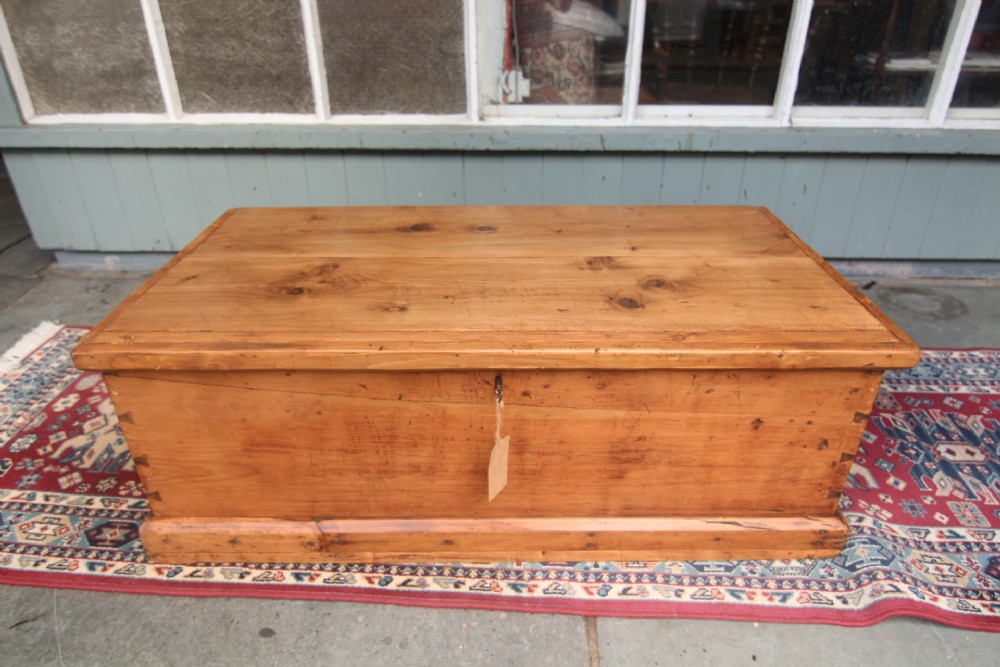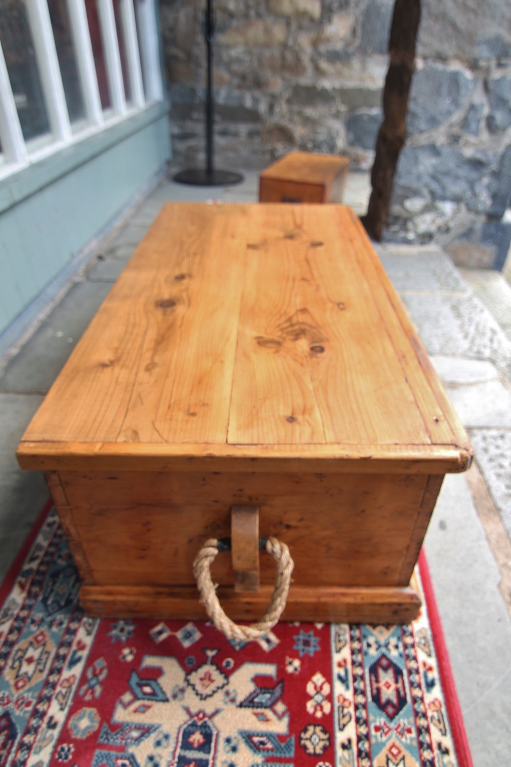 A CLEAN REFURBISHED PINE BLANKET BOX; WELL POLISHED TOP WITH CHAMFERED MOULDING ABOVE DOVETAILED FRONT CONSTRUCTION, ROPE HANDLES & BECKETS, WORKING LOCK, SOLID TIMBER SIDES AND BACK, STOOD ON SOLID PLINTH. GENERAL USAGE WEAR AND OLD REPAIRS, IN RESTORED CONDITION CLEAN INSIDE & OUT READY FOR USE. BOUGHT PRIVATELY