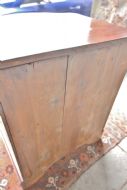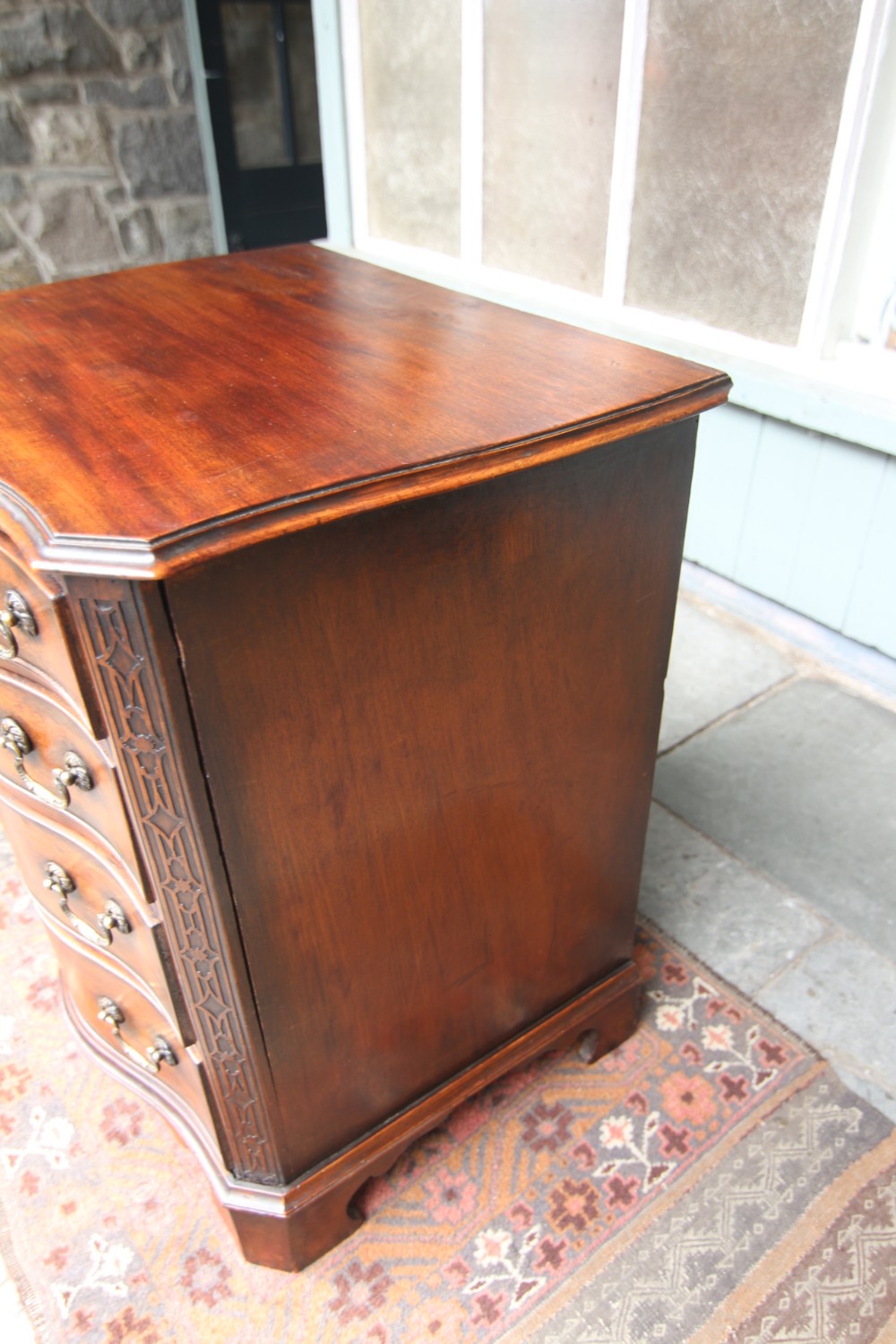 A SUPERIOR QUALITY EDWARDIAN GEORGIAN STYLE SERPENTINE CHEST OF FOR DRAWERS NICE SMALL PROPORTIONS; POLISHED TOP WITH CANTERED CORNERS ABOVE FOUR COCKBEADED, DOVETAILED SOLID TIMBER DRAWERS, ORIGINAL HEAVY BRASSWARE, BLIND FRET DECORATION TO THE CORNERS. SOLID TIMBER SIDES AND BACK STOOD ON BRACKET FEET. GENERAL USAGE WEAR AS PER PHOTOS, STRUCTURALLY SOUND READY TO USE.