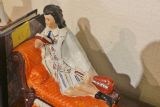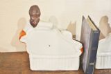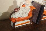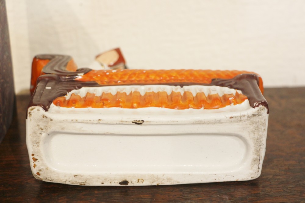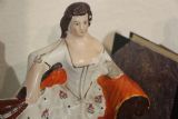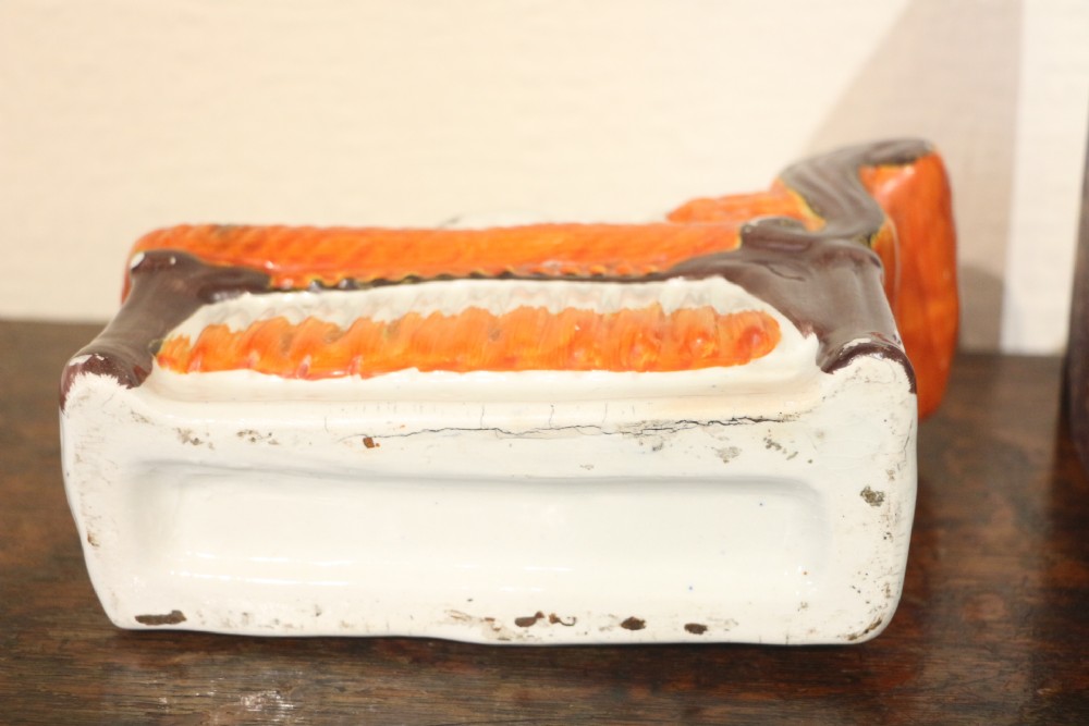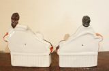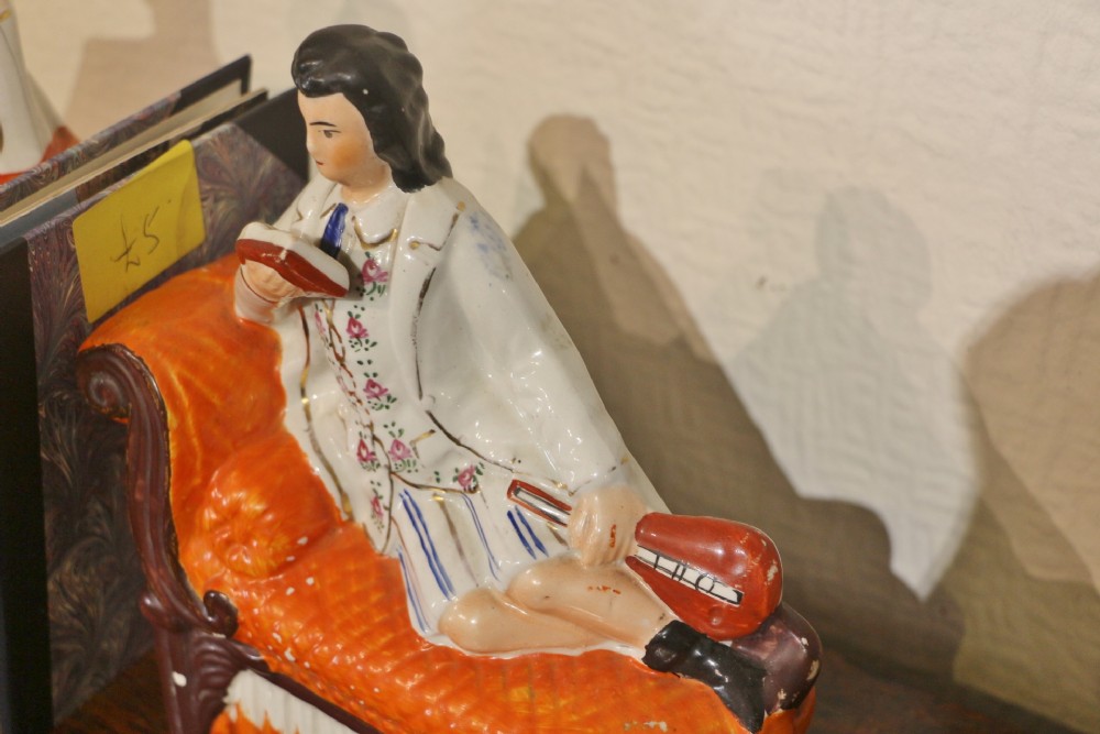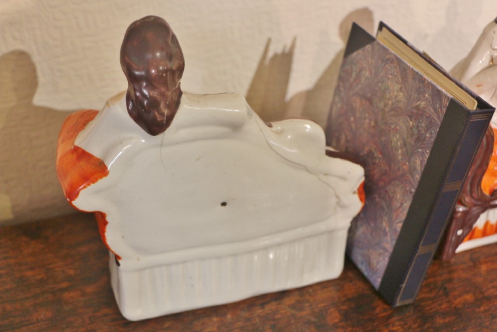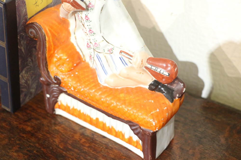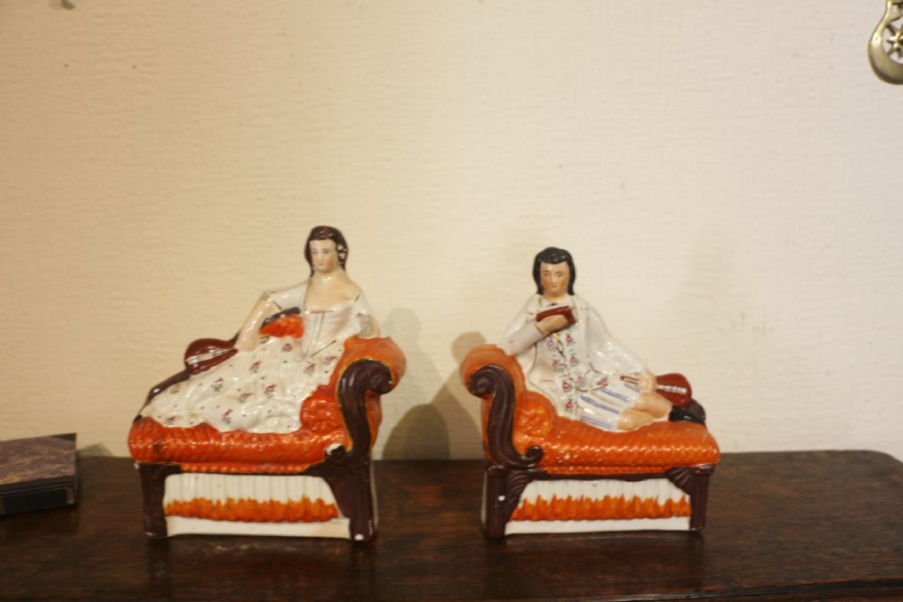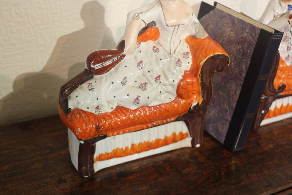 A COLOURFUL PAIR OF 19TH CENTURY STAFFORDSHIRE FIGURES; FUNCTION AS BOOKENDS, RECLINING ACTORS READING ON CHAISE LOUNGE. GENERAL USAGE WEAR AND CRACKS AS PER PHOTS. BOUGHT AS SEEN CONDITION. BOUGHT PRIVATELY