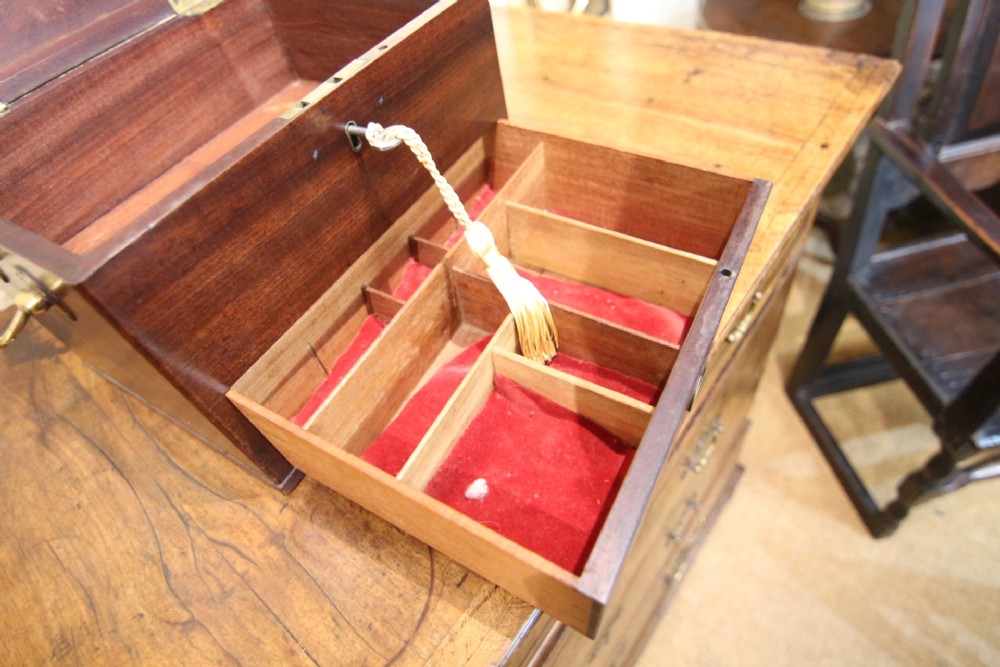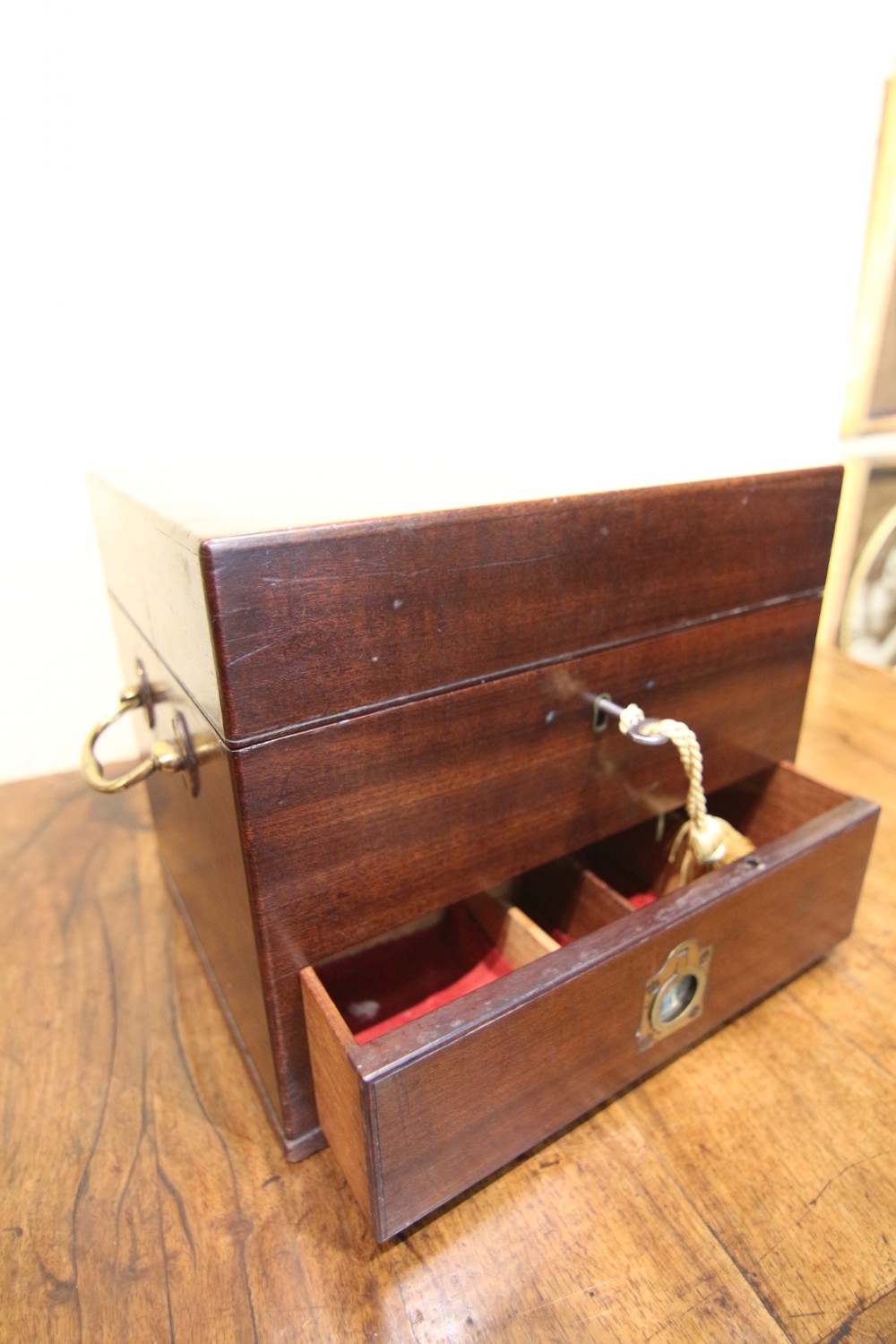 A HANDSOME CLEAN GEORGIAN MAHOGANY BOX; LIKELY AN APOTHECARY TRAVEL BOX WITH PLAIN POLISHED CASE WITH CARRY HANDLES, THE INTERIOR WITH ROOMY COMPARTMENT FOR STORAGE, LOCKING WITH BRASS ROD LOCK FOR LOWER DRAWER. INTERIOR SECTIONED COMPARTMENTS WITH RECESSED BRASS HANDLE. OVERALL CLEAN USEFUL LITTLE 18TH CENTURY BOX. BOUGHT PRIVATELY
