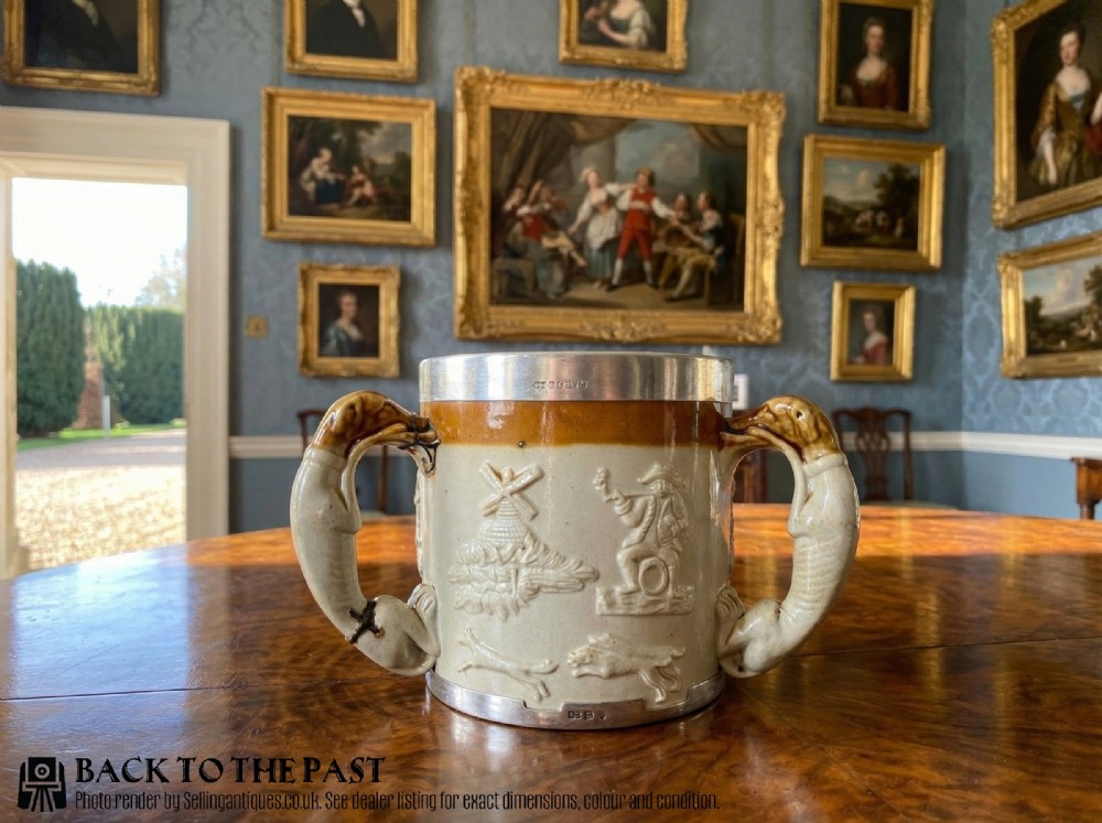 A CHARMING 19TH CENTURY HALLMARKED SILVER RIMMED HARVESTING CUP; TOP RIM SILVER WITH LURCHER SHAPED TRIO OF HANDLES, ONE WITH OLD STABLE REPAIR, SURROUNDING THE CUP A HUNTING SEEN WITH RAISED PATTERN SHOWING HOUNDS IN HUNT. THE BASE WITH SILVER RIM. GENERAL USAGE WEAR AS PER PHOTOS. BOUGHT PRIVATELY.