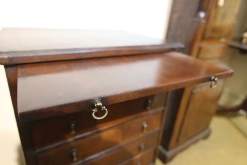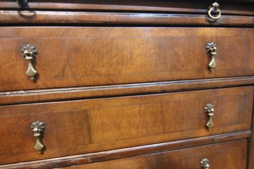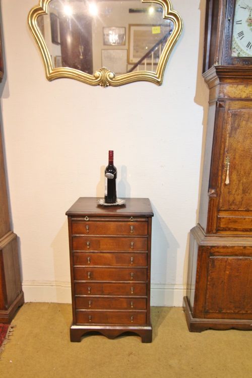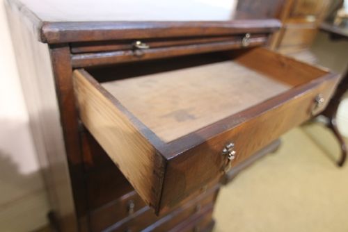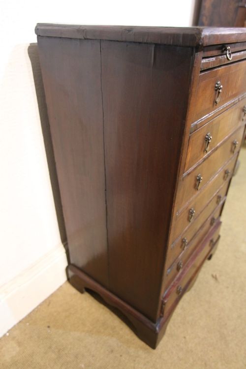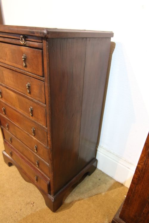 A USEFULL LITTLE EARLY GEORGIAN STYLE VICTORIAN CHEST OF DRAWERS;WITH POLISHED FEATHER BANDED TOP ABOVE PULL OUT BRUSHING SLIDE TOGETHER WITH A BANK OF 7 SOLID TIMBER LINED DRAWERS, ORIGINAL BRASS DROP HANDLES, FEATHER BANDED FRONT AND VENEERED SOLID TIMBER SIDES AND BACK, STOOD ON SHAPED BRACKET FOOT. GENERAL USAGE WEAR AND SOME VENEER SHRINKAGE COMPOSITE WITH AGE AND UASAGE, MINOR OLD REPAIRS. GOOD COLLECTORS PIECE FOR MEDALS, JEWELLERY COINS ETC.OVERALL STRUCTURALLY SOUND, POLISHED UP READY TO USE.