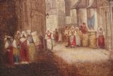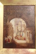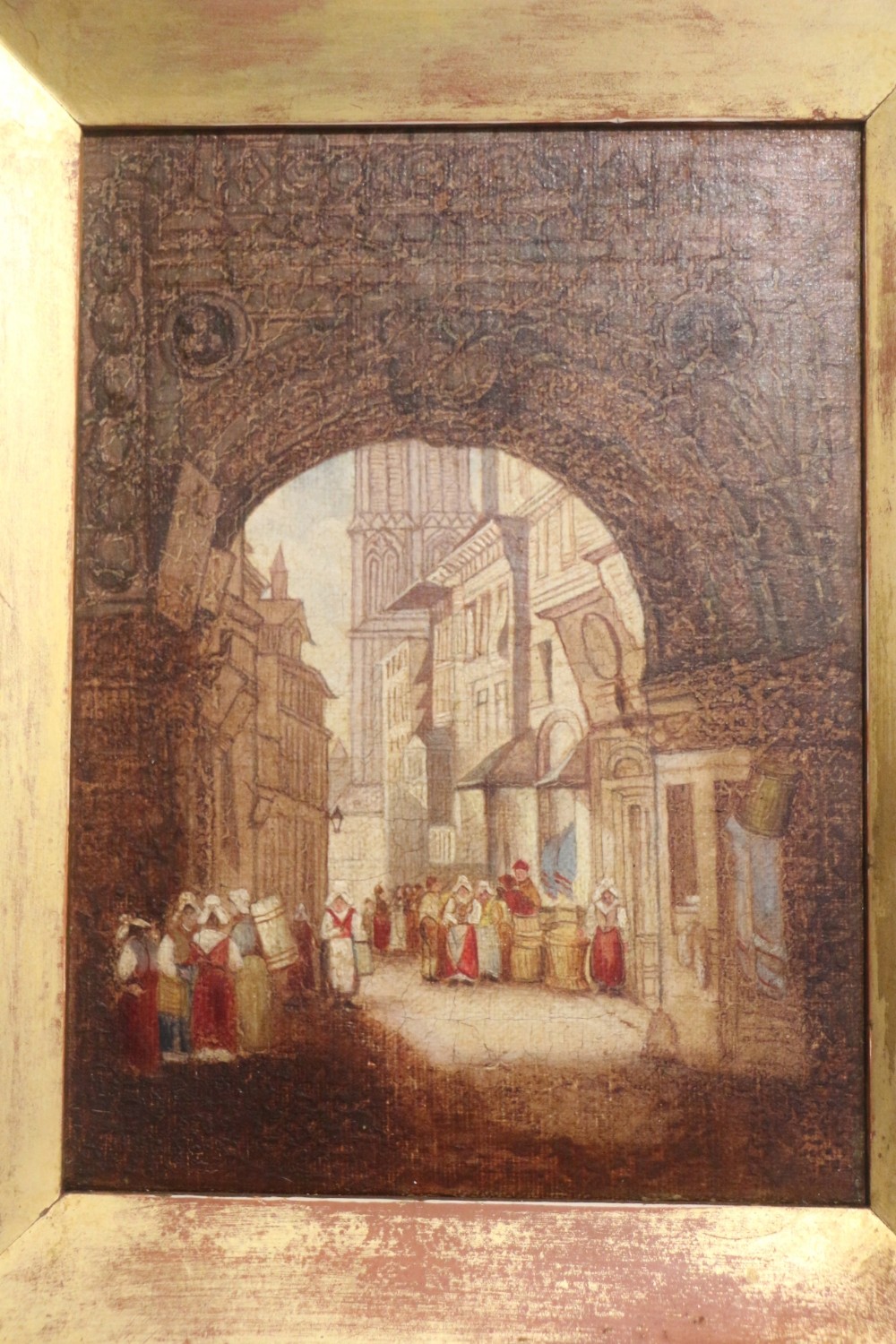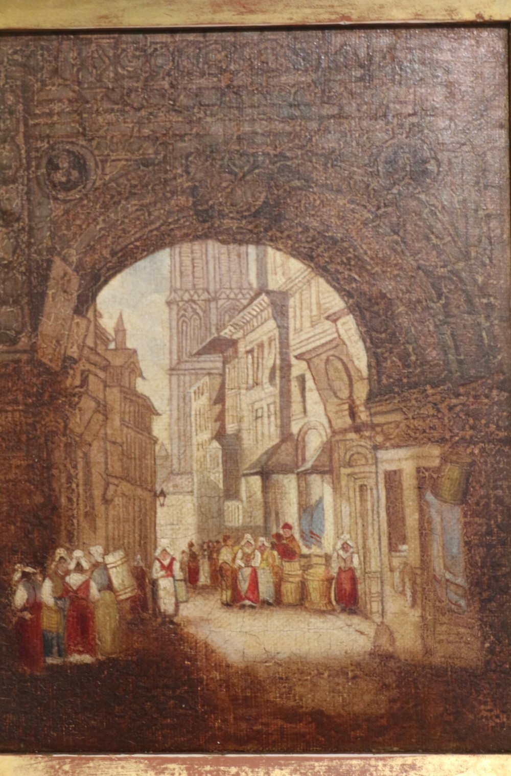 A CHARMING LATE 18TH/EARLY 19TH CENTURY OIL PAINTING IN PERIOD FRAME; OIL ON CANVAS DEPICTING INTRICATE CATHEDRAL ARCH OF AN URBAN SCENE; ASSORTED PEOPLE IN PERIOD CLOTHING LOOKING THROUGH A SUNLIGHT ARCHWAY. CRACKLING AS PER PHOTOS BUT ALL STABLE , SET IN GILT FRAME, CANT SEE A SIGNATURE. BOUGHT PRIVATELY.