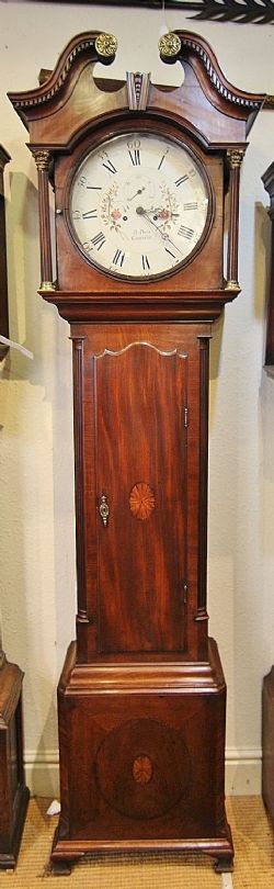A CHEERFUL PAINTED ARCH DIAL 8 DAY LONGCASE CLOCK BY OWEN OF LLANRWST CIRCA 1840, SWAN NECK PEDIMENT ABOVE COLOURFUL FACE, INLAID PILLARS ABOVE FRUITWOOD INLAID CASE, APPLIED CROSSBANDED PANNELED BASE STOOD ON SHAPED OAK BRACKET FEET.