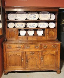 A GOOD CLEAN LATE 19TH CENTURY WELSH DRESSER IN TWO PARTS; THE UPPER SECTION WITH OGEE CORNICE ABOVE INLAID TALWRN STYLE MARK, THREE GRADUATED SHELVES WITH SHAPED RACK AND SUPPORT SHOES. THE BASE WITH POLISHED TOP ABOVE A T-SHAPED ARRANGEMENT OF MAHOGANY FRONTED COCKBEADED & DOVETAILED DRAWERS, ORIGINAL TURNED INLAID MOTHER OF PEAQRL MAHOGANY HANDLES, RECESSED ARCH CUPBOARD DOORSEITHER SIDE. CORNERS WITH TURNED PILLARS, SOLID TIMBER SIDES AND BACK, STOOD ON SHAPED BRACKET FEET. GENERAL USAGE WEAR AS PER PHOTOS, OVERALL GOLDEN COLOUR AND PATINATION. BOUGHT PRIVATELY FROM AN ESTATE IN NORTH WALES.